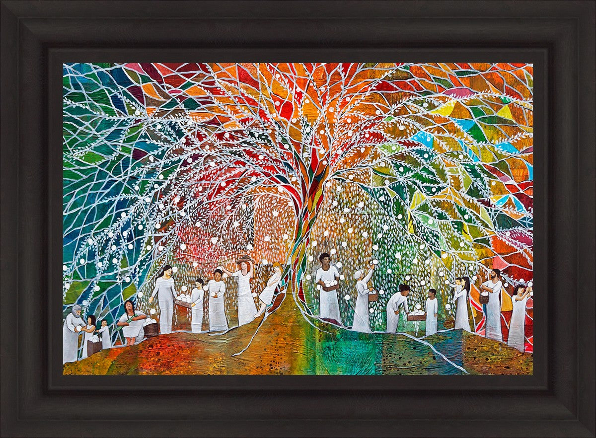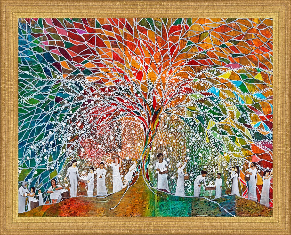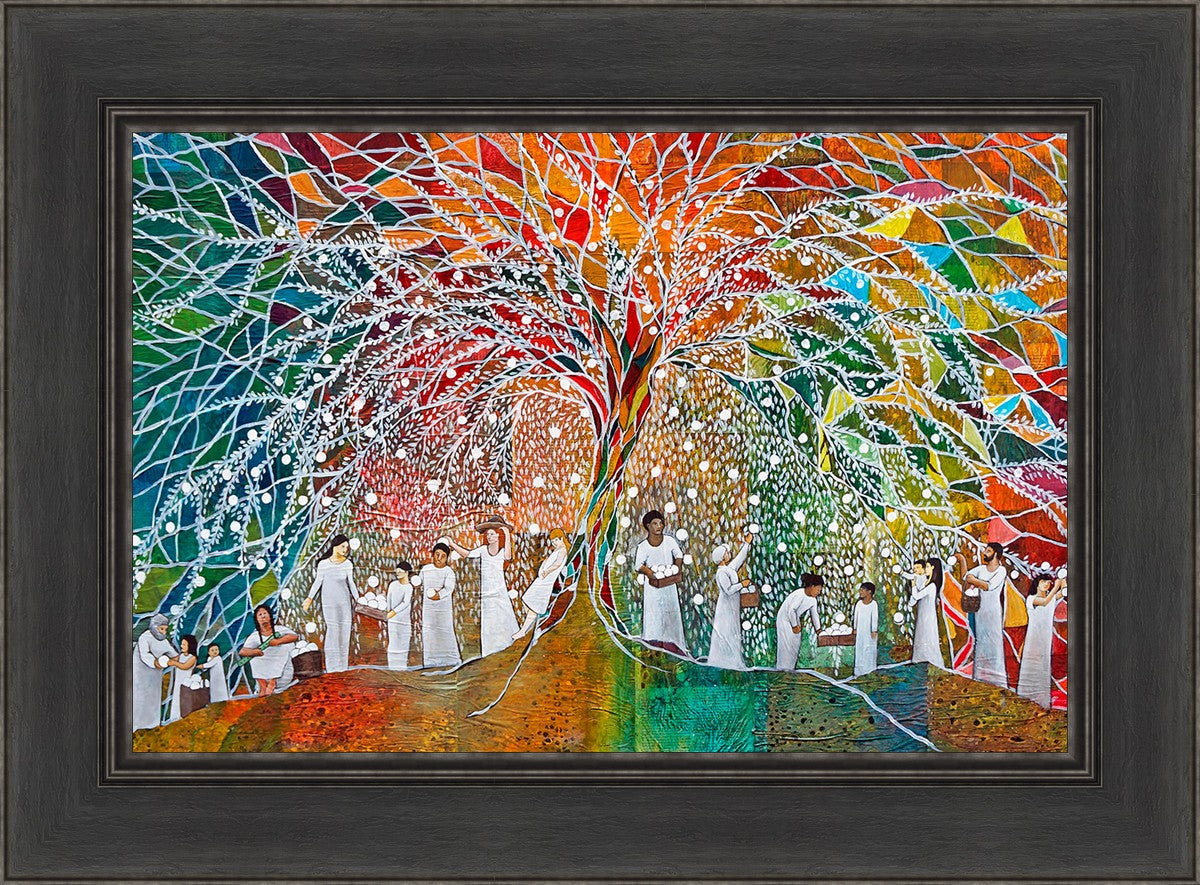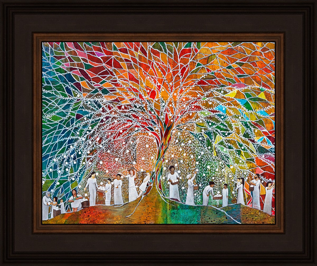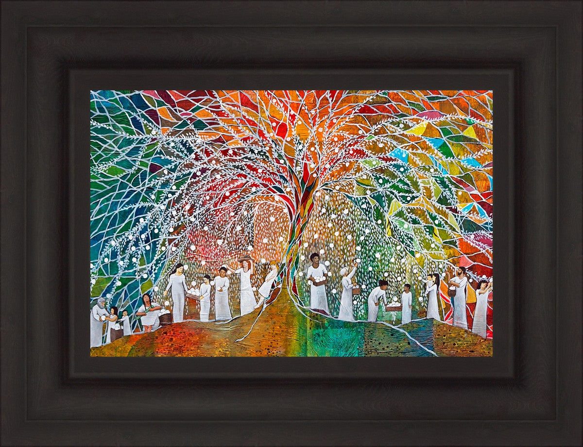 “All are alike unto God,”--I chose to address this concept on a cultural level, attempting to address the pain that racism causes many individuals. The tree and its fruit represent the love of God, and people from different races collect the glowing orbs. The snowy branches of the tree provide a framework for a myriad of colors. To me, these rainbow shards represent God’s excitement and awareness in creating diversity, and that all the colors must work together for optimal beauty. Only when all of the colors of the rainbow are combined does white appear--the hue representing purity and peace.The tree is large and all-encompassing, providing and making room for any who desire to approach and gather. God’s love extends to all of His children, and He gives us the opportunity not only to partake of His love, but to share its abundance.