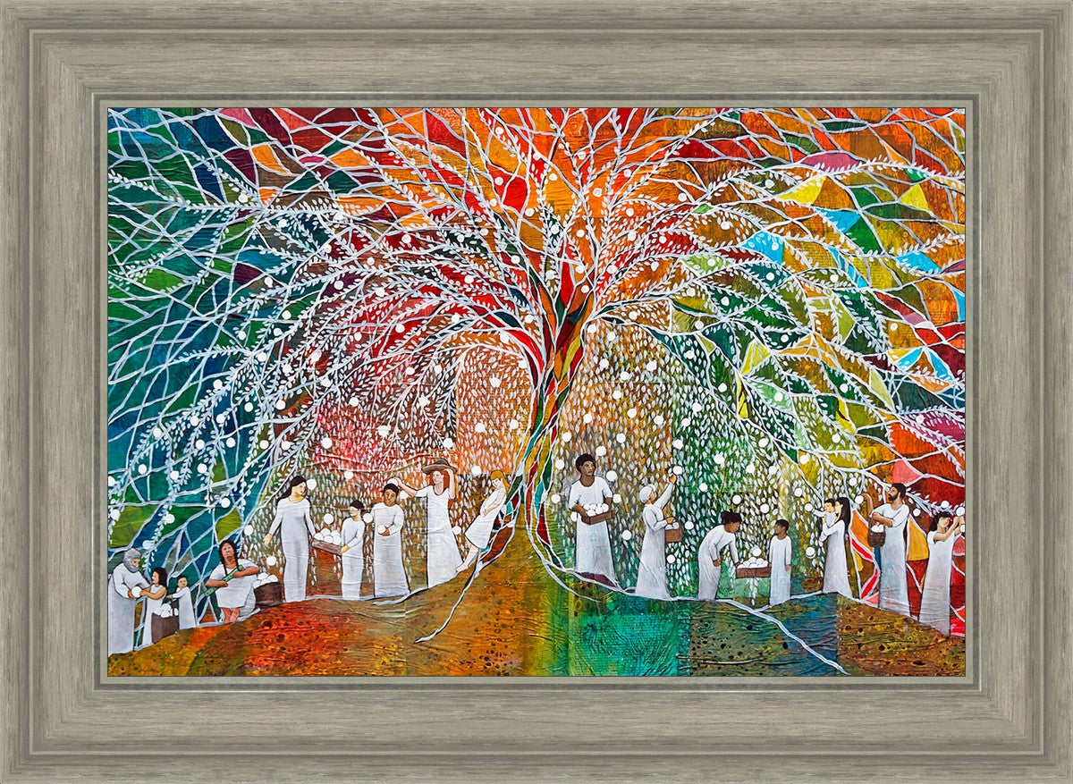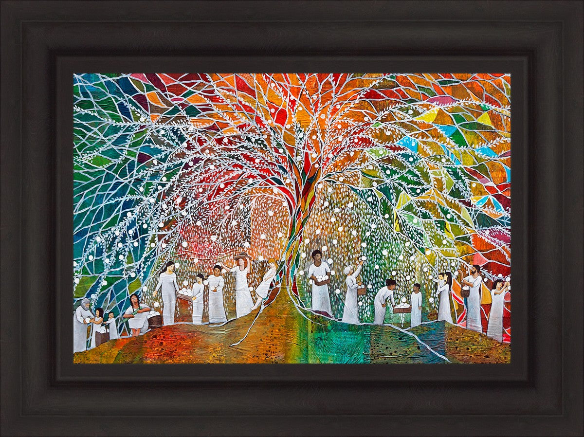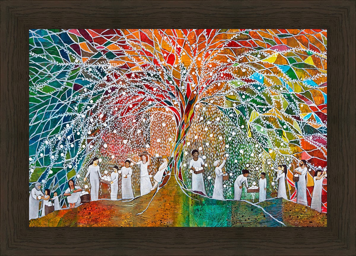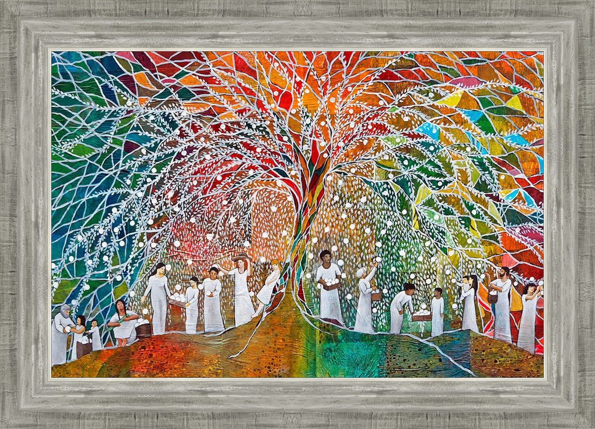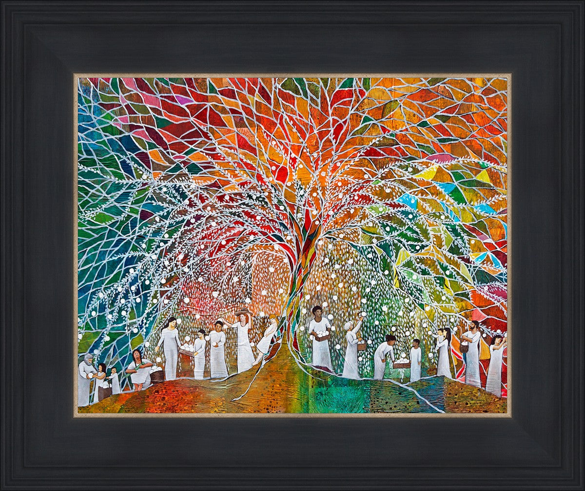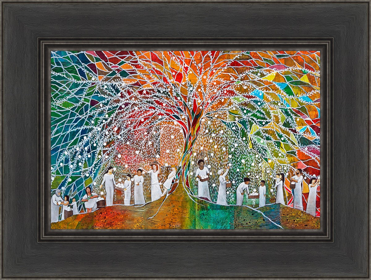 “All are alike unto God,”--I chose to address this concept on a cultural level, attempting to address the pain that racism causes many individuals. The tree and its fruit represent the love of God, and people from different races collect the glowing orbs. The snowy branches of the tree provide a framework for a myriad of colors. To me, these rainbow shards represent God’s excitement and awareness in creating diversity, and that all the colors must work together for optimal beauty. Only when all of the colors of the rainbow are combined does white appear--the hue representing purity and peace.The tree is large and all-encompassing, providing and making room for any who desire to approach and gather. God’s love extends to all of His children, and He gives us the opportunity not only to partake of His love, but to share its abundance.