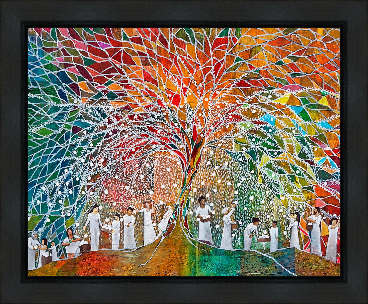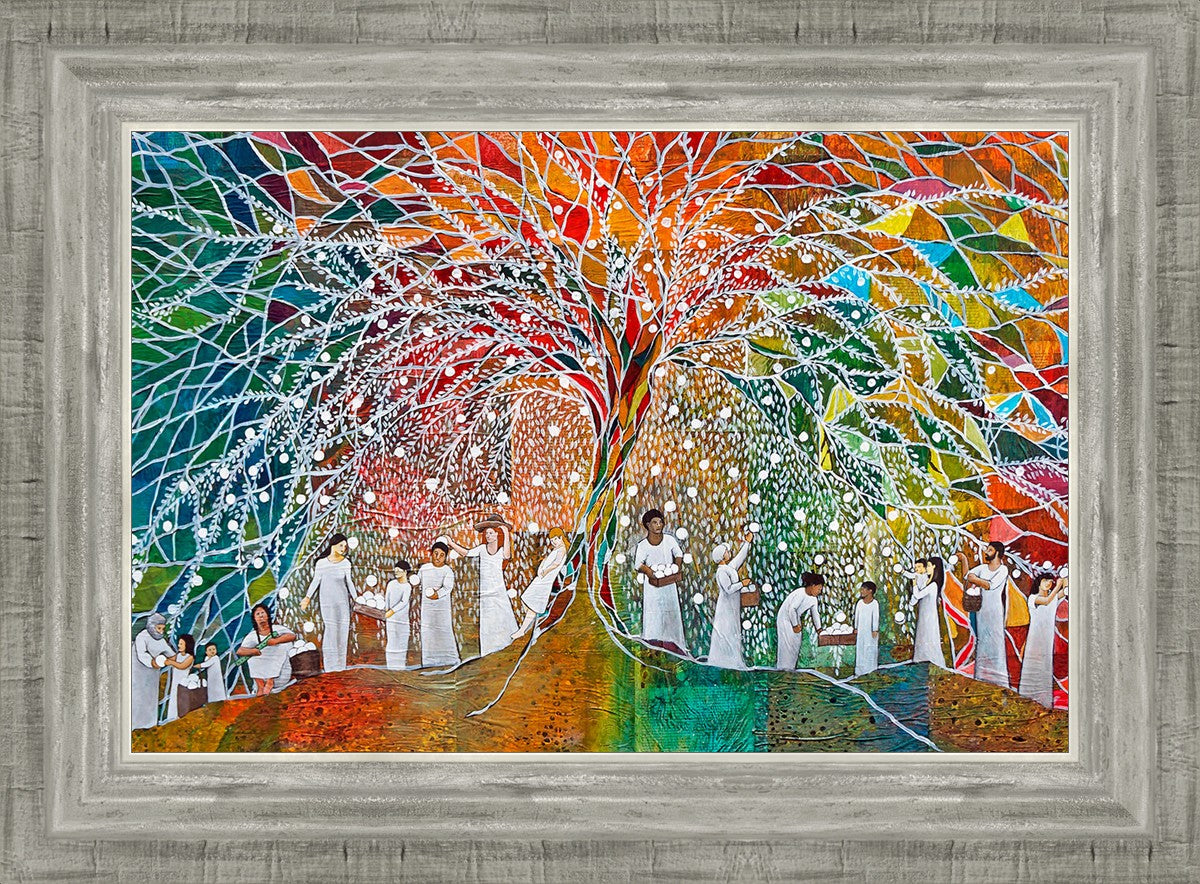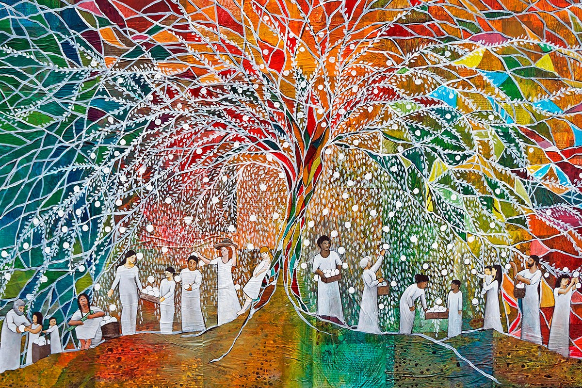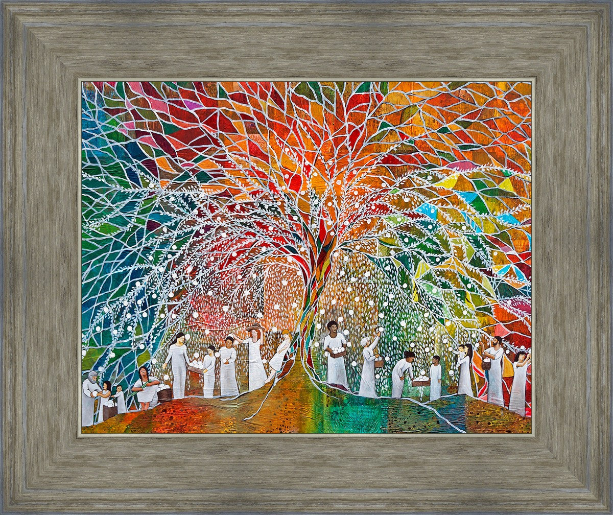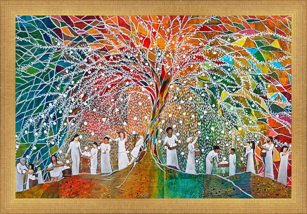 “All are alike unto God,”--I chose to address this concept on a cultural level, attempting to address the pain that racism causes many individuals. The tree and its fruit represent the love of God, and people from different races collect the glowing orbs. The snowy branches of the tree provide a framework for a myriad of colors. To me, these rainbow shards represent God’s excitement and awareness in creating diversity, and that all the colors must work together for optimal beauty. Only when all of the colors of the rainbow are combined does white appear--the hue representing purity and peace.The tree is large and all-encompassing, providing and making room for any who desire to approach and gather. God’s love extends to all of His children, and He gives us the opportunity not only to partake of His love, but to share its abundance.