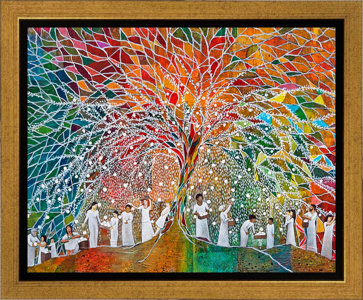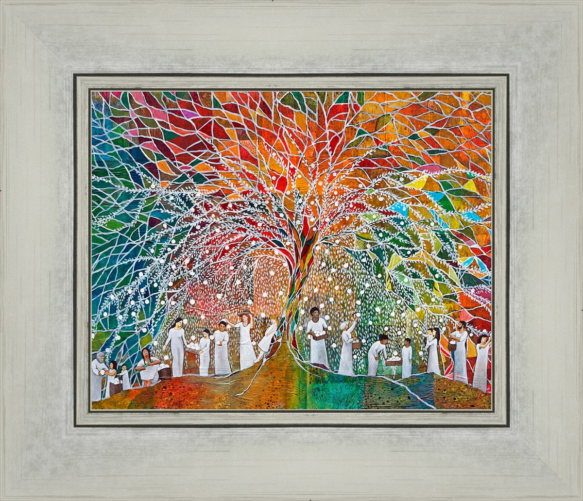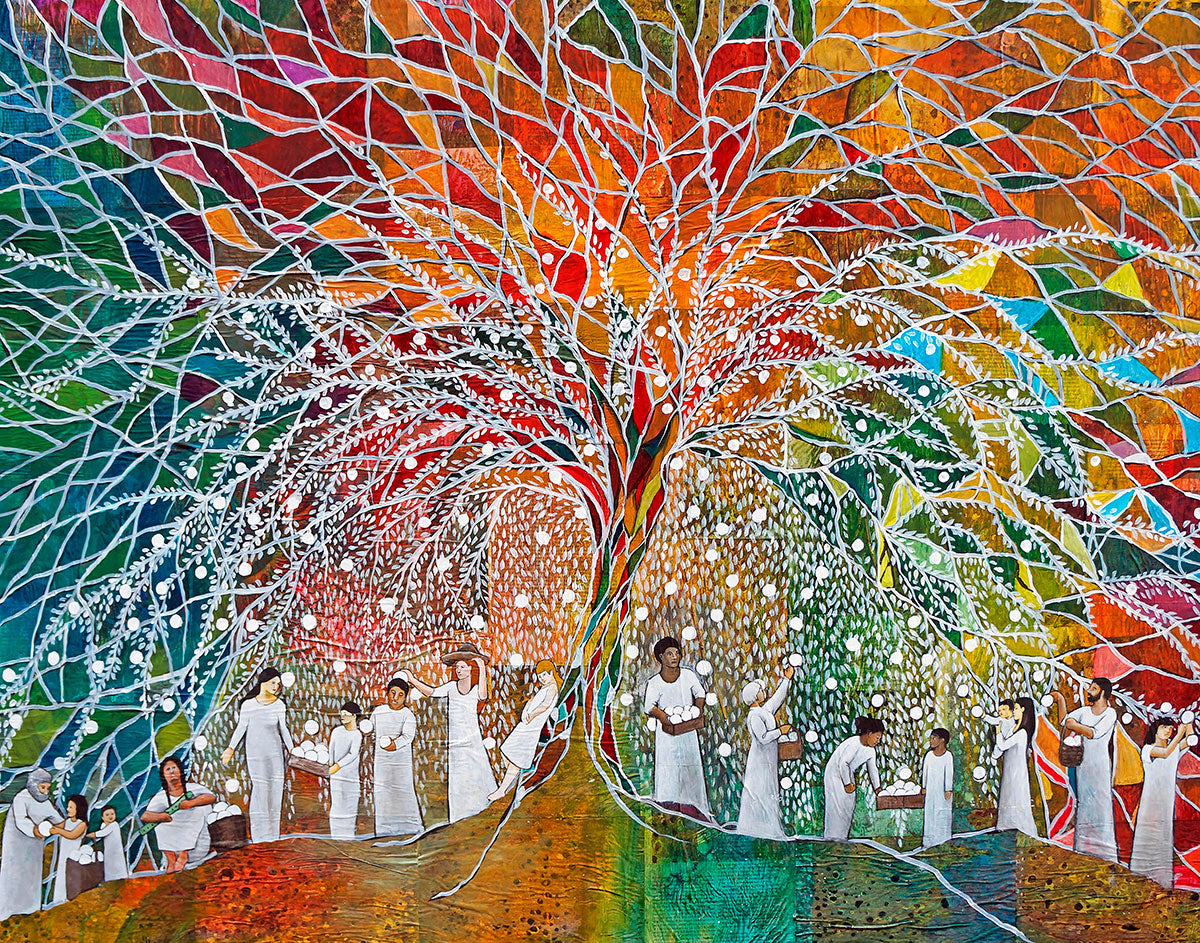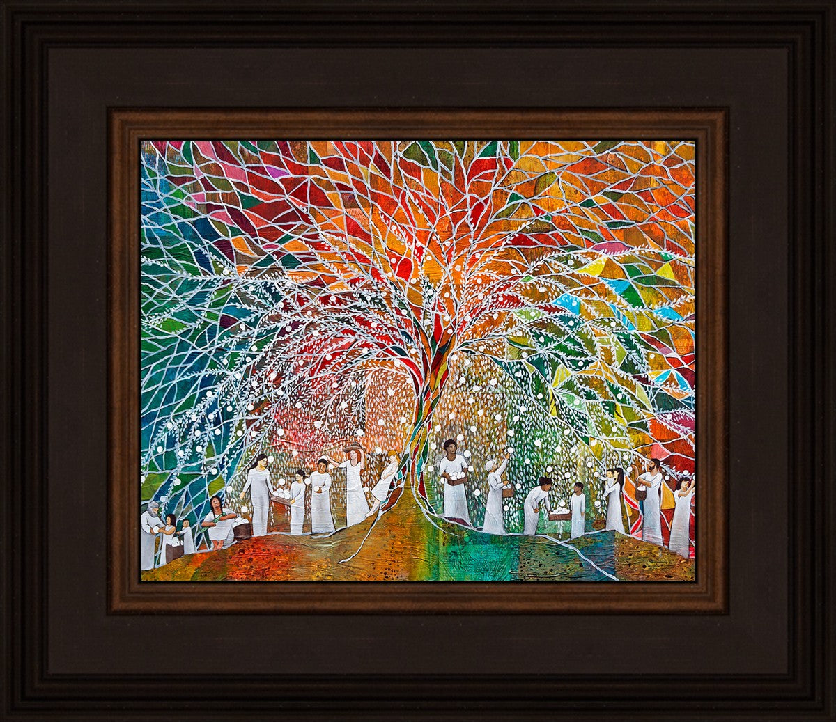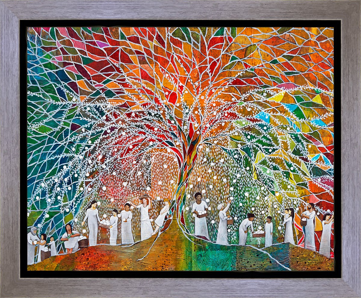 “All are alike unto God,”--I chose to address this concept on a cultural level, attempting to address the pain that racism causes many individuals. The tree and its fruit represent the love of God, and people from different races collect the glowing orbs. The snowy branches of the tree provide a framework for a myriad of colors. To me, these rainbow shards represent God’s excitement and awareness in creating diversity, and that all the colors must work together for optimal beauty. Only when all of the colors of the rainbow are combined does white appear--the hue representing purity and peace.The tree is large and all-encompassing, providing and making room for any who desire to approach and gather. God’s love extends to all of His children, and He gives us the opportunity not only to partake of His love, but to share its abundance.