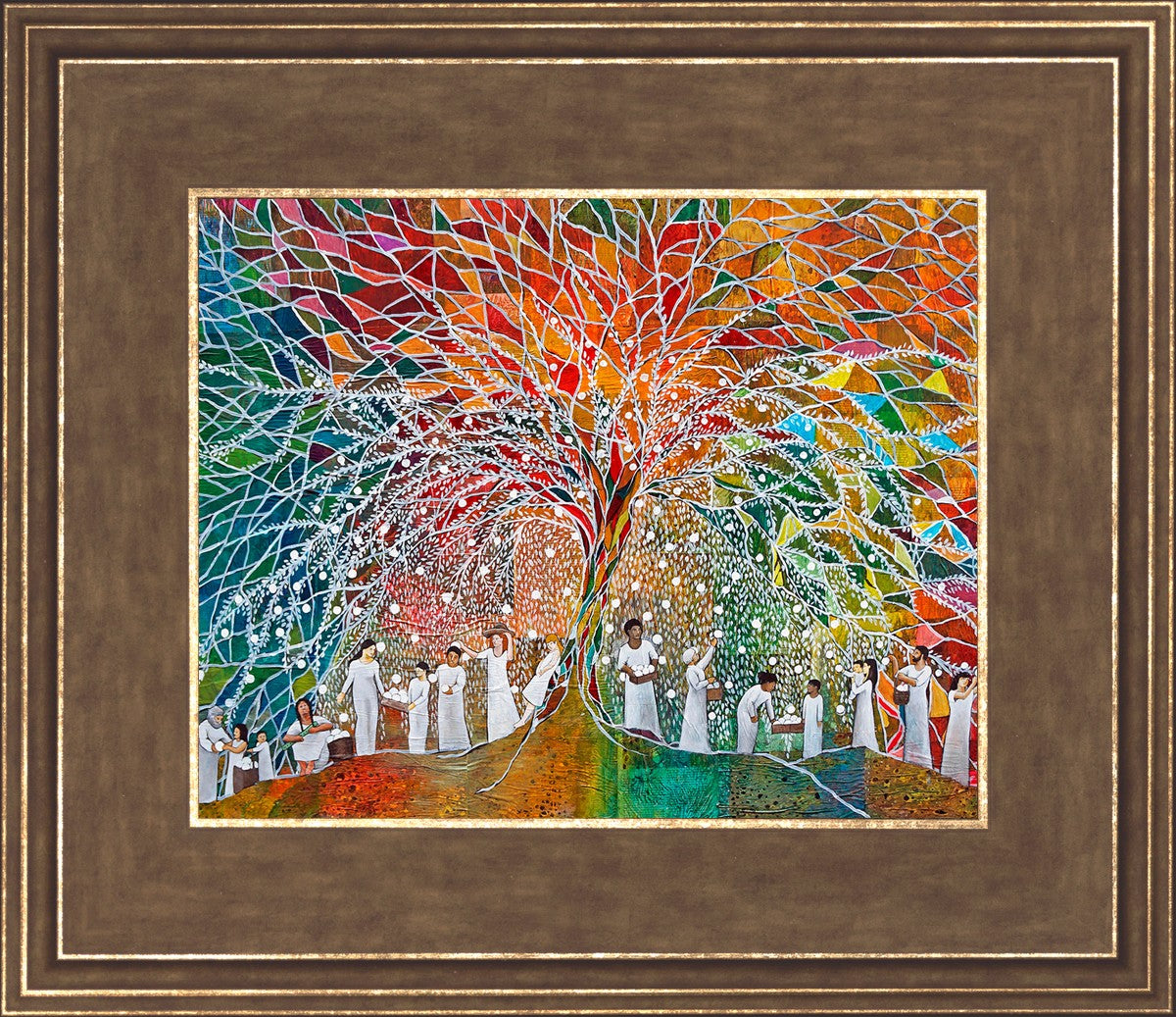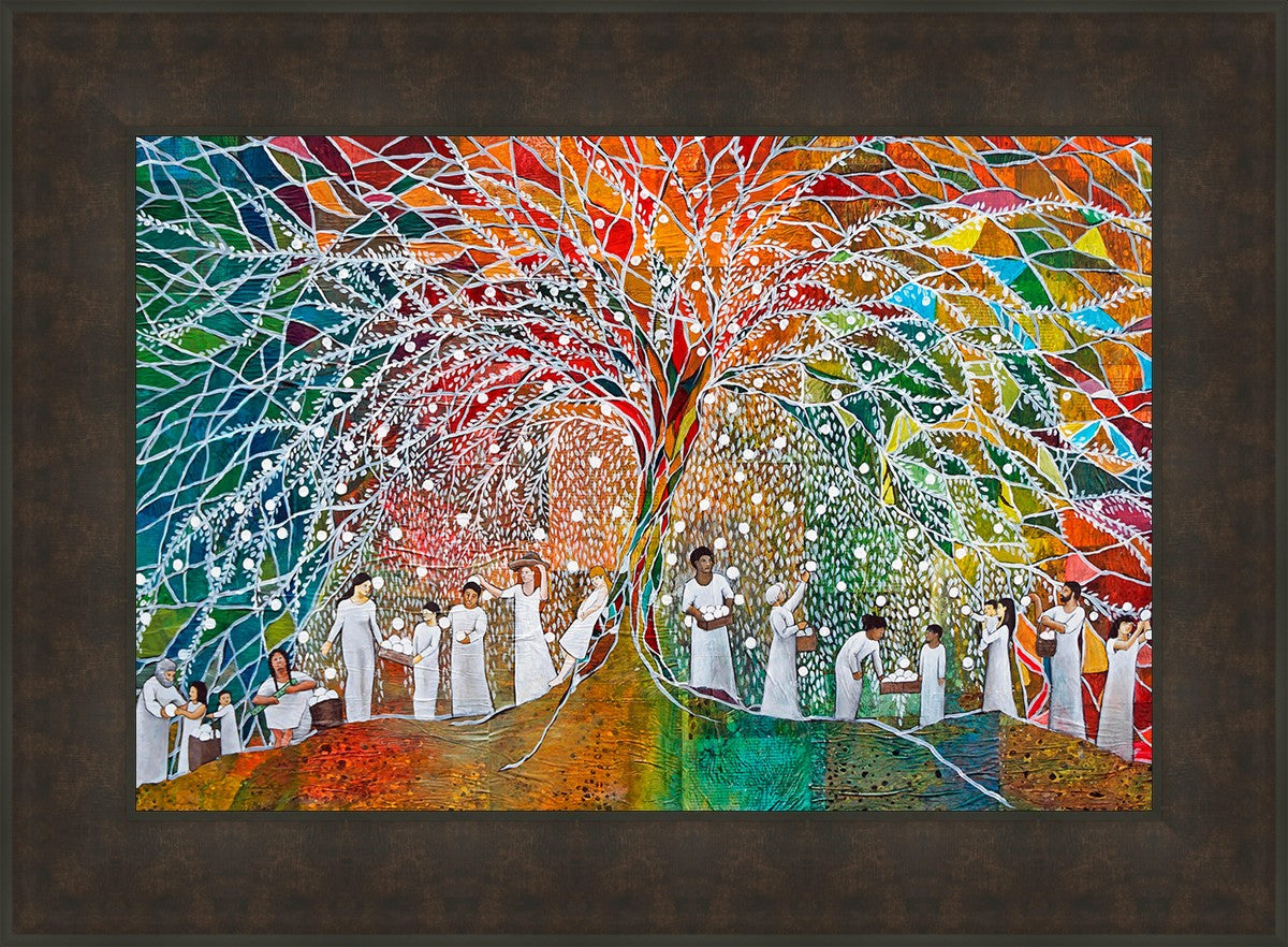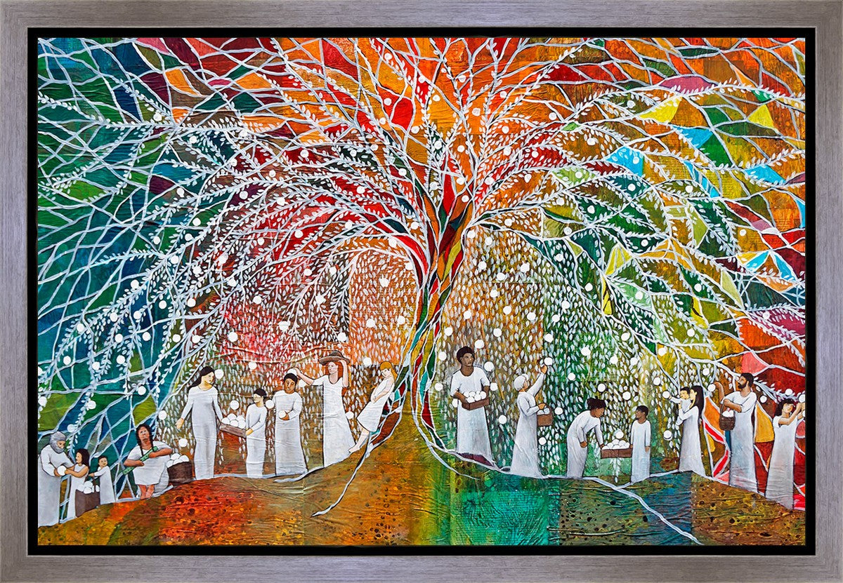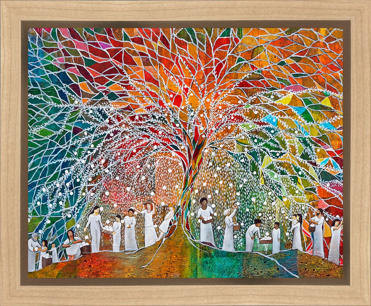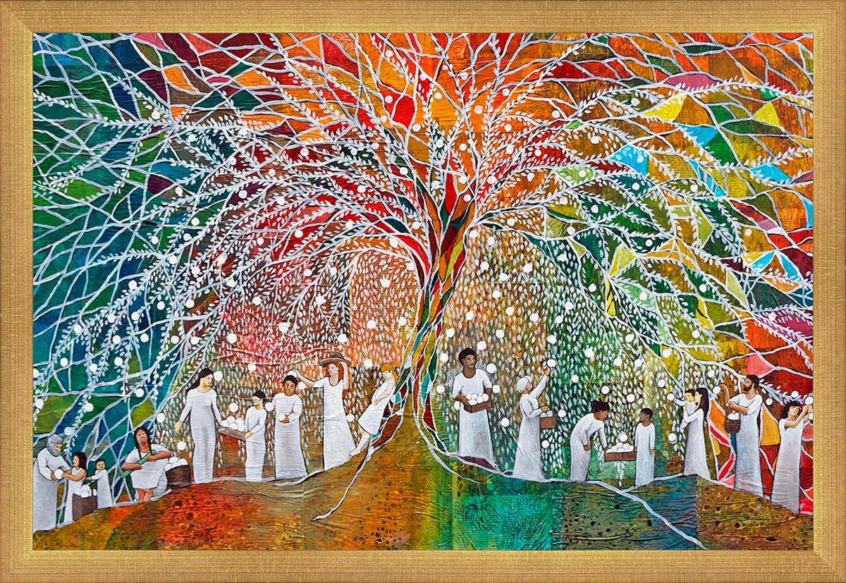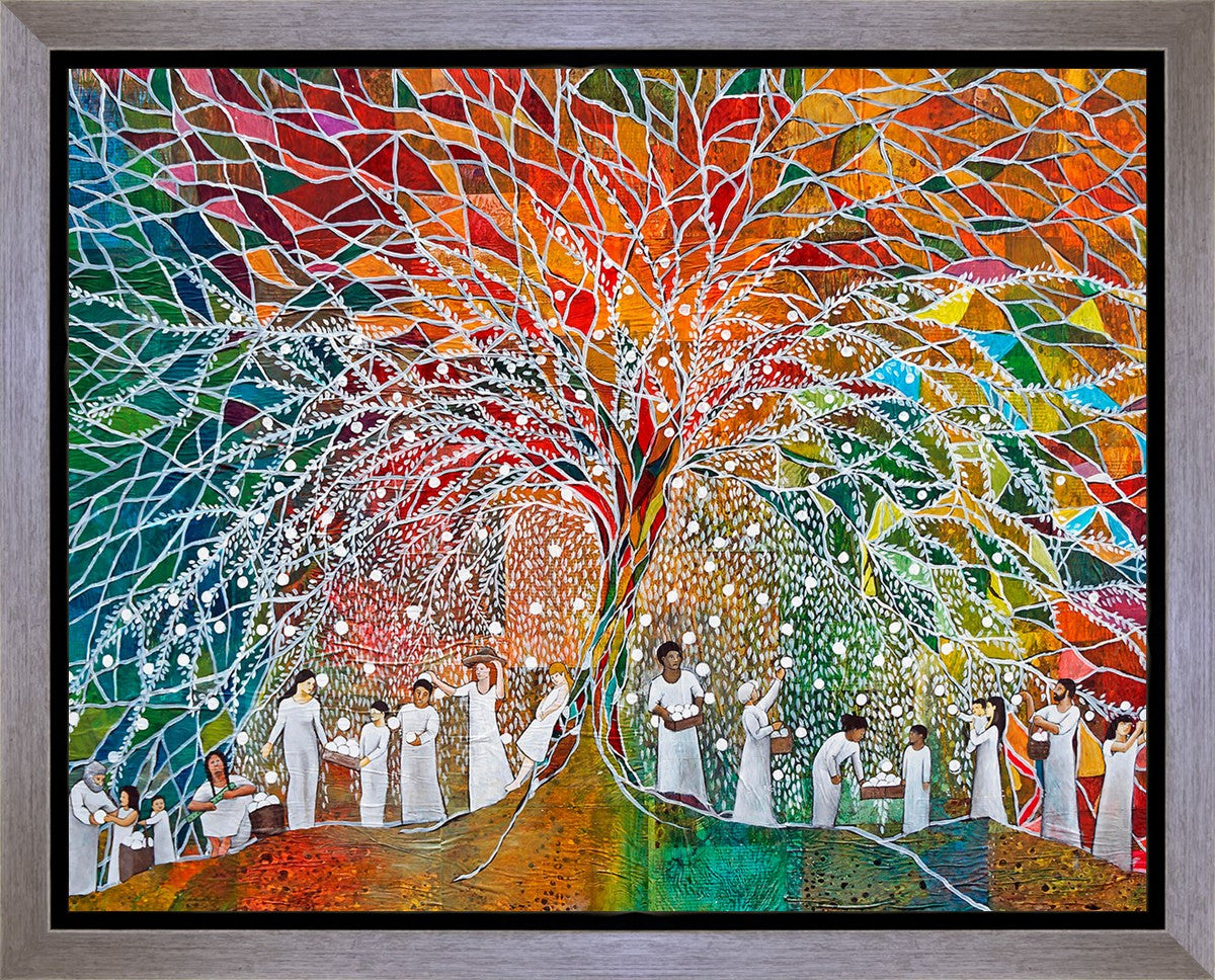 “All are alike unto God,”--I chose to address this concept on a cultural level, attempting to address the pain that racism causes many individuals. The tree and its fruit represent the love of God, and people from different races collect the glowing orbs. The snowy branches of the tree provide a framework for a myriad of colors. To me, these rainbow shards represent God’s excitement and awareness in creating diversity, and that all the colors must work together for optimal beauty. Only when all of the colors of the rainbow are combined does white appear--the hue representing purity and peace.The tree is large and all-encompassing, providing and making room for any who desire to approach and gather. God’s love extends to all of His children, and He gives us the opportunity not only to partake of His love, but to share its abundance.