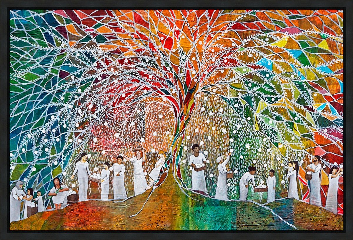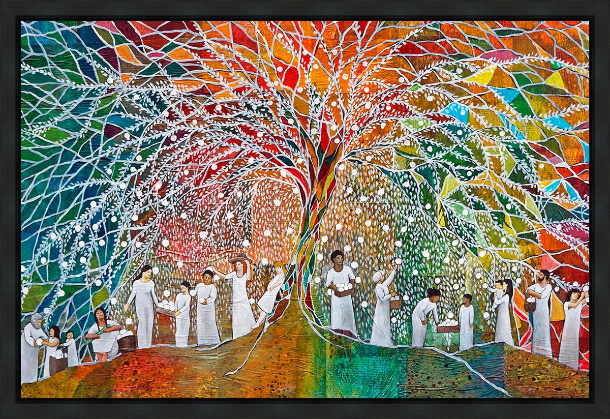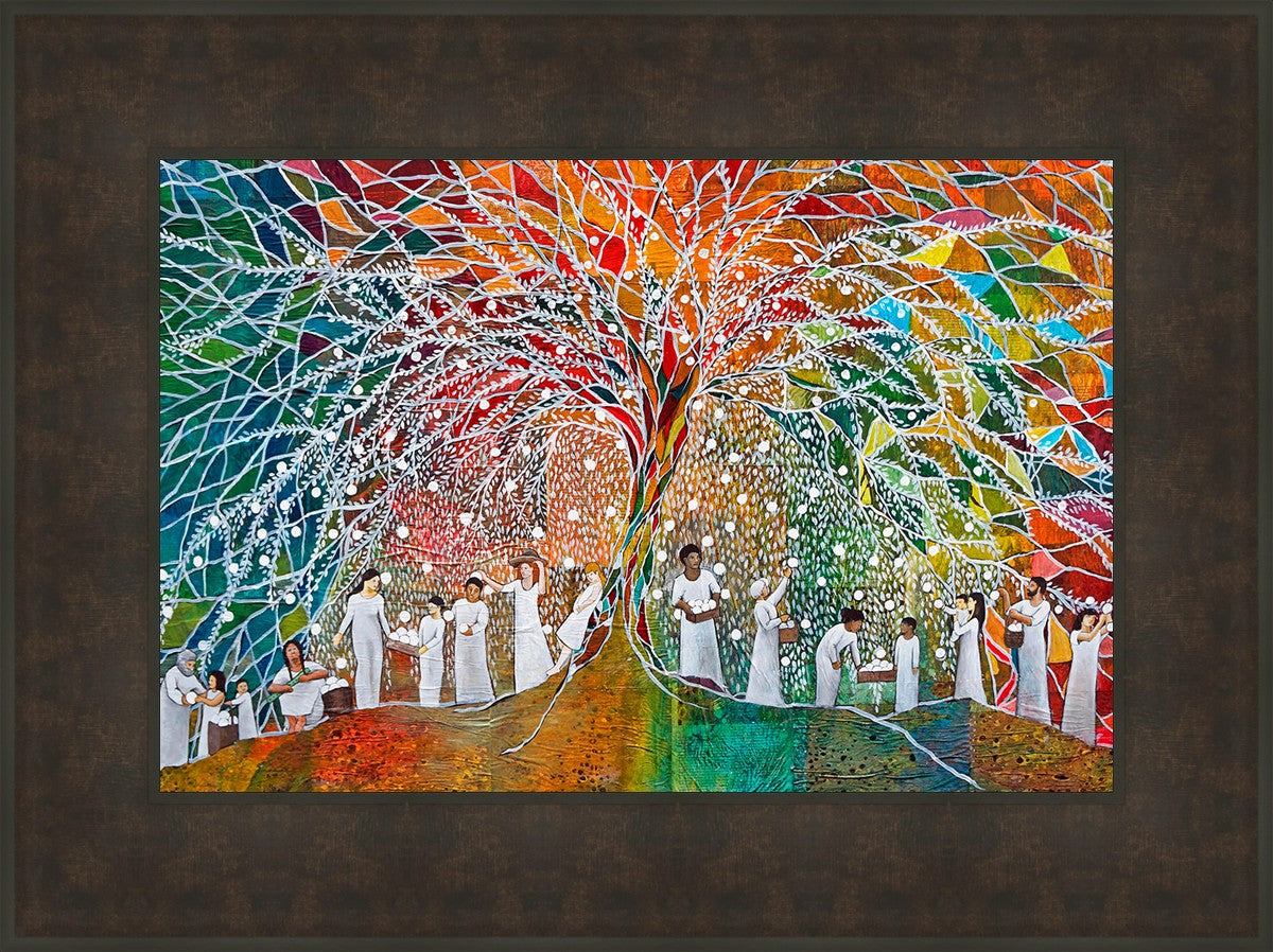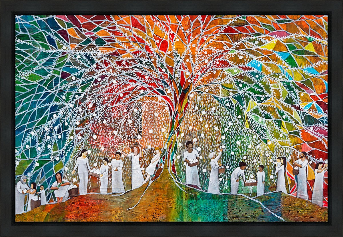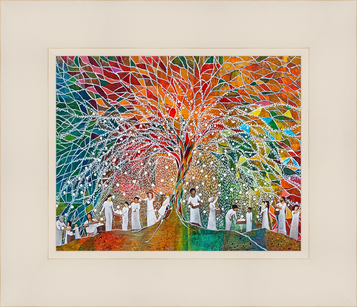 “All are alike unto God,”--I chose to address this concept on a cultural level, attempting to address the pain that racism causes many individuals. The tree and its fruit represent the love of God, and people from different races collect the glowing orbs. The snowy branches of the tree provide a framework for a myriad of colors. To me, these rainbow shards represent God’s excitement and awareness in creating diversity, and that all the colors must work together for optimal beauty. Only when all of the colors of the rainbow are combined does white appear--the hue representing purity and peace.The tree is large and all-encompassing, providing and making room for any who desire to approach and gather. God’s love extends to all of His children, and He gives us the opportunity not only to partake of His love, but to share its abundance.