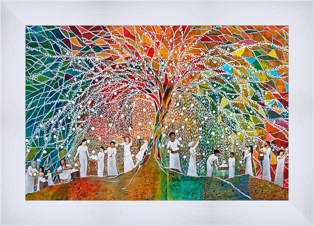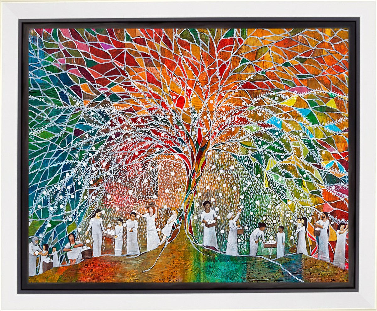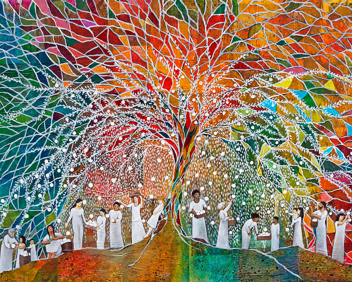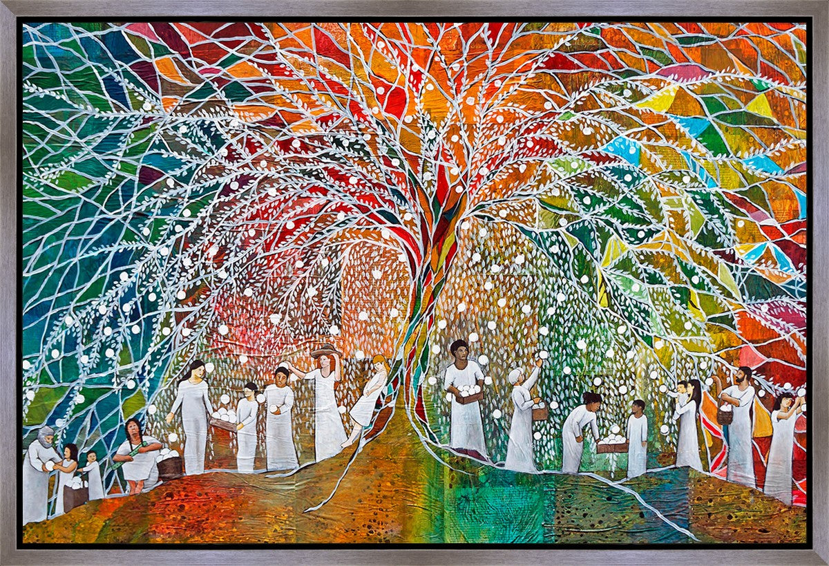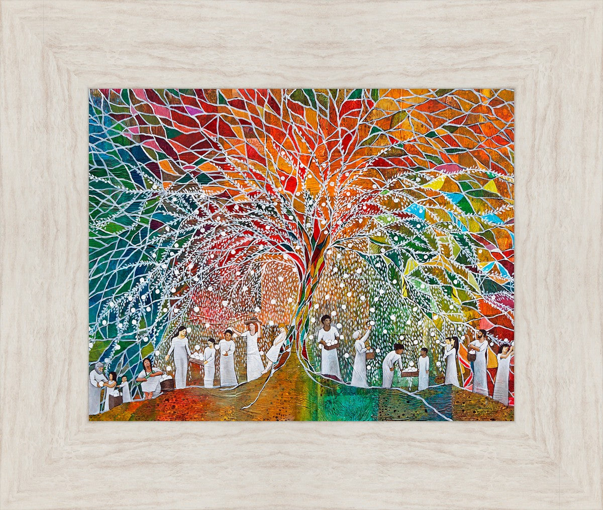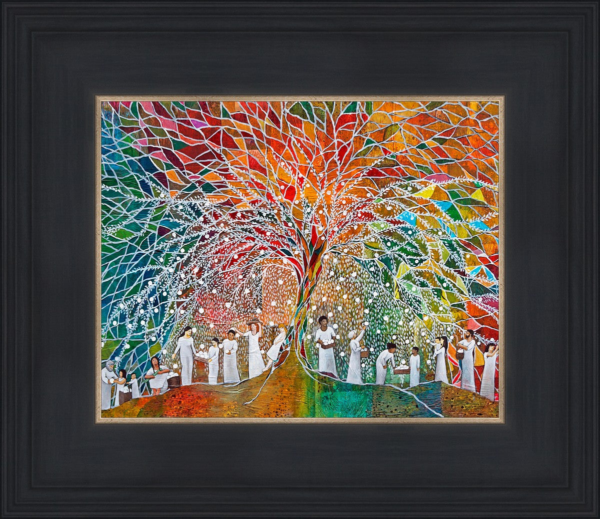 “All are alike unto God,”--I chose to address this concept on a cultural level, attempting to address the pain that racism causes many individuals. The tree and its fruit represent the love of God, and people from different races collect the glowing orbs. The snowy branches of the tree provide a framework for a myriad of colors. To me, these rainbow shards represent God’s excitement and awareness in creating diversity, and that all the colors must work together for optimal beauty. Only when all of the colors of the rainbow are combined does white appear--the hue representing purity and peace.The tree is large and all-encompassing, providing and making room for any who desire to approach and gather. God’s love extends to all of His children, and He gives us the opportunity not only to partake of His love, but to share its abundance.