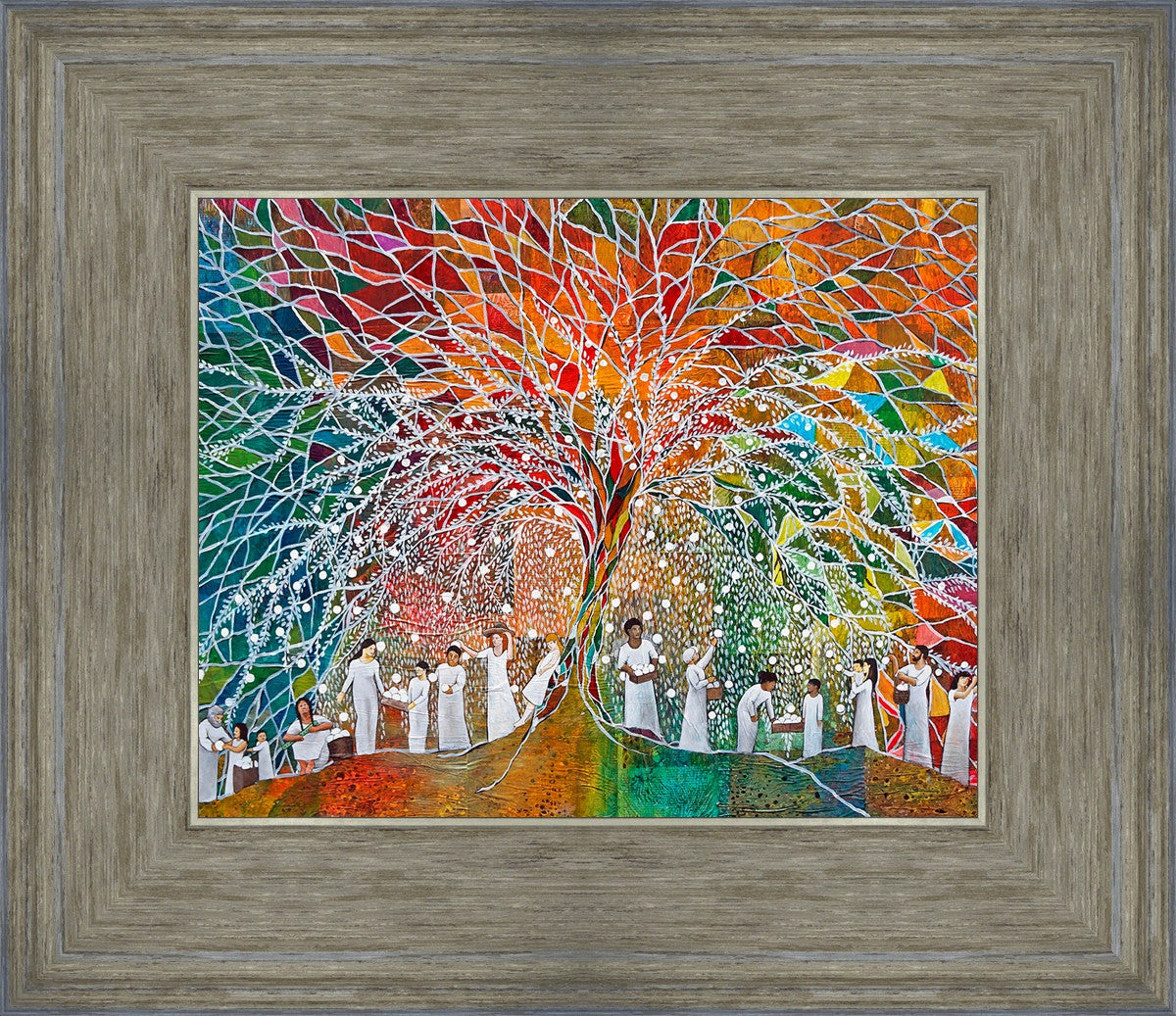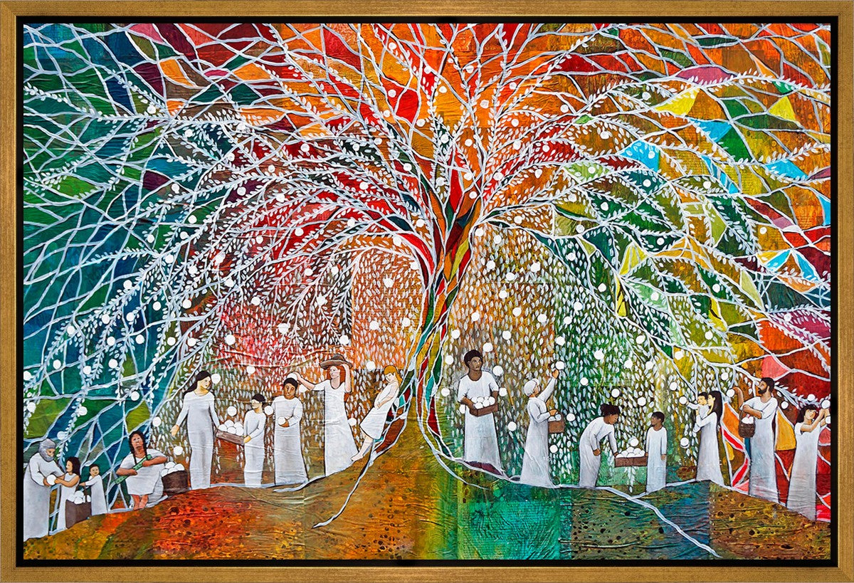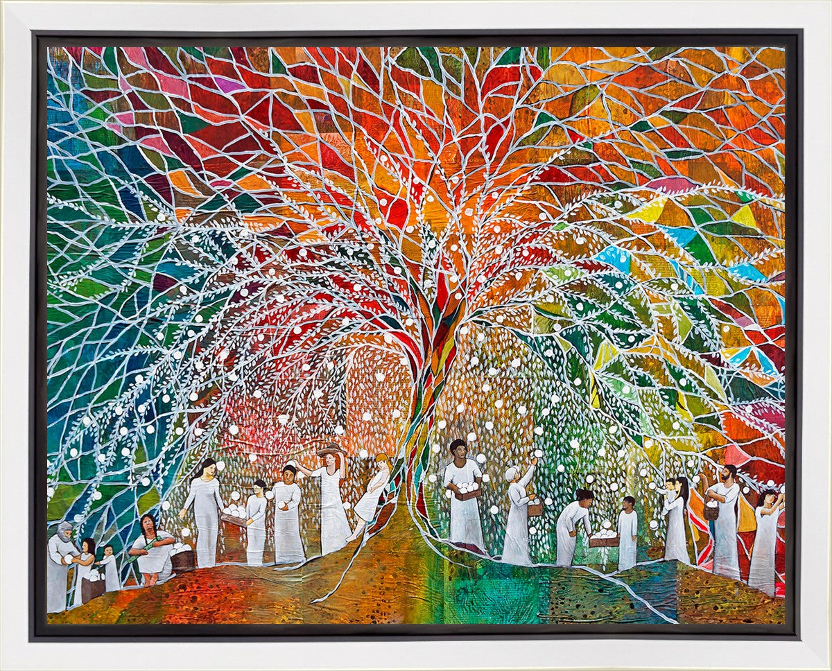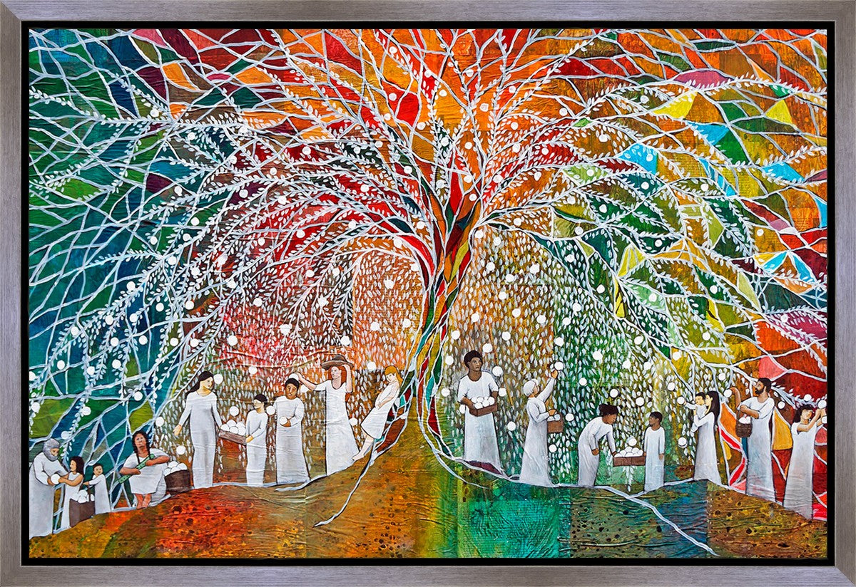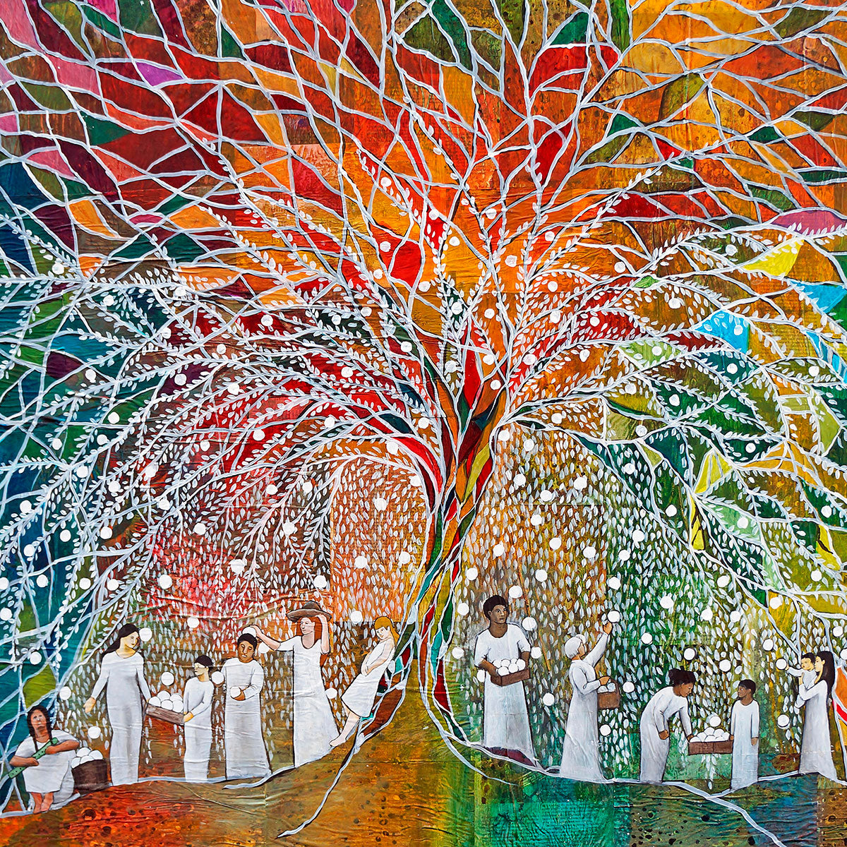 “All are alike unto God,”--I chose to address this concept on a cultural level, attempting to address the pain that racism causes many individuals. The tree and its fruit represent the love of God, and people from different races collect the glowing orbs. The snowy branches of the tree provide a framework for a myriad of colors. To me, these rainbow shards represent God’s excitement and awareness in creating diversity, and that all the colors must work together for optimal beauty. Only when all of the colors of the rainbow are combined does white appear--the hue representing purity and peace.The tree is large and all-encompassing, providing and making room for any who desire to approach and gather. God’s love extends to all of His children, and He gives us the opportunity not only to partake of His love, but to share its abundance.