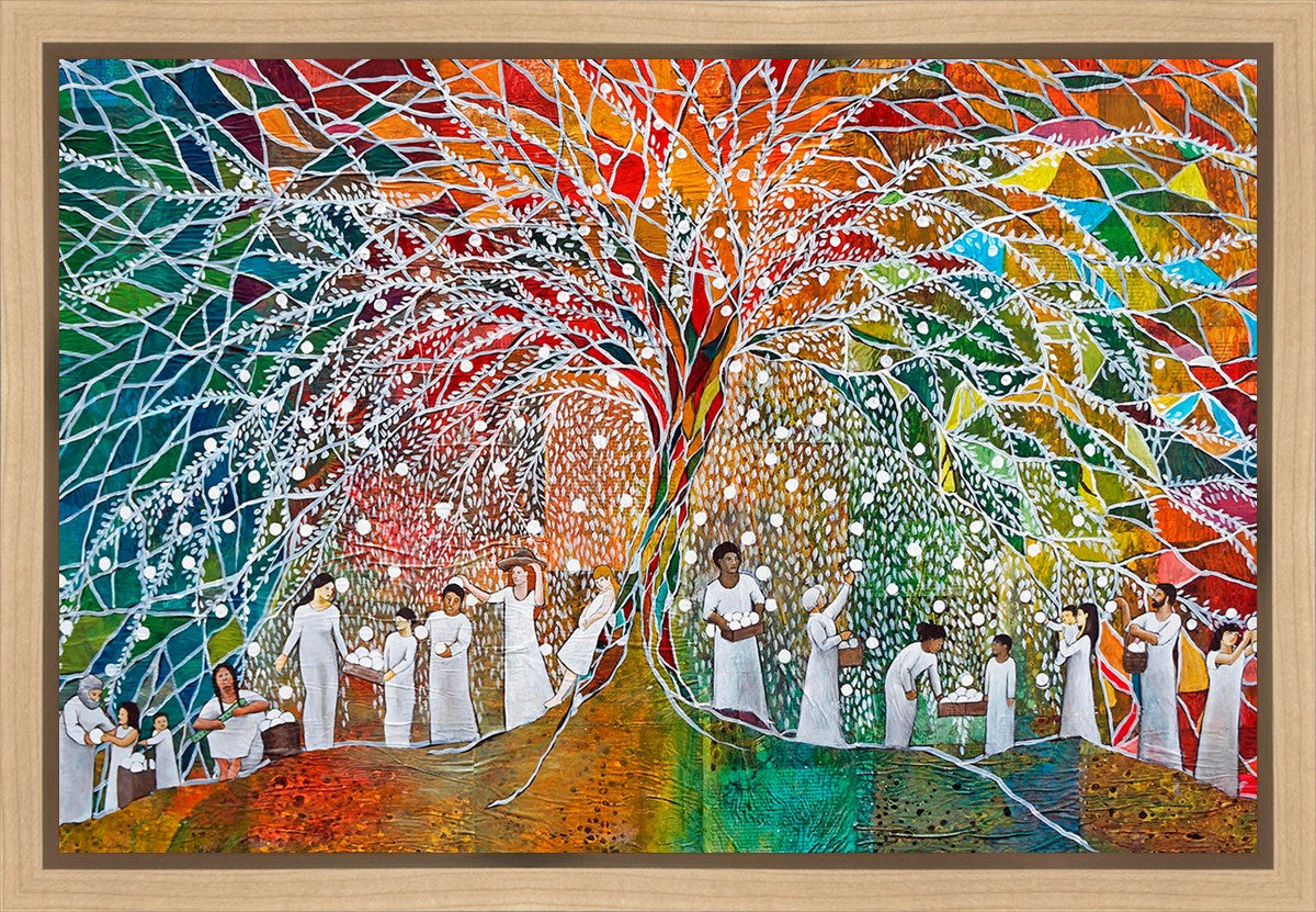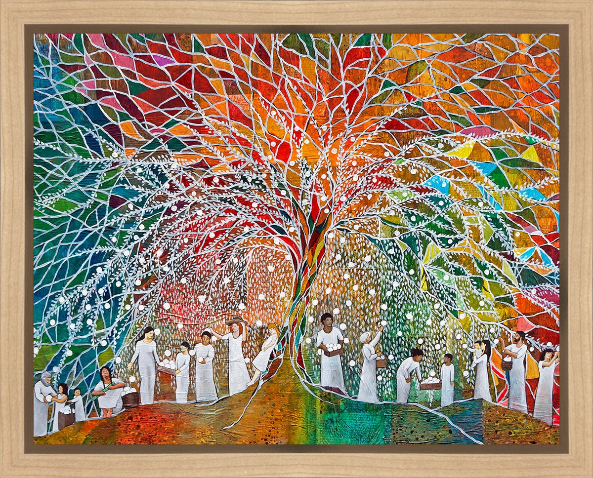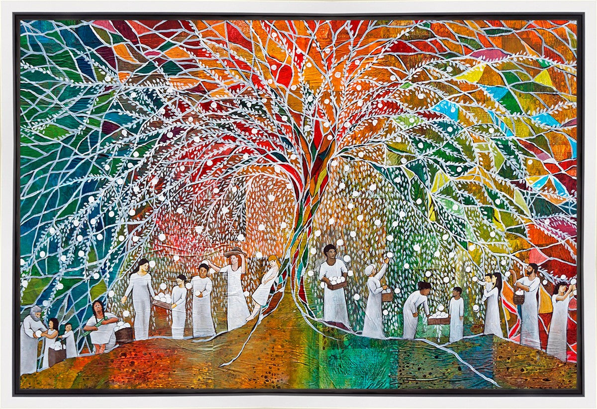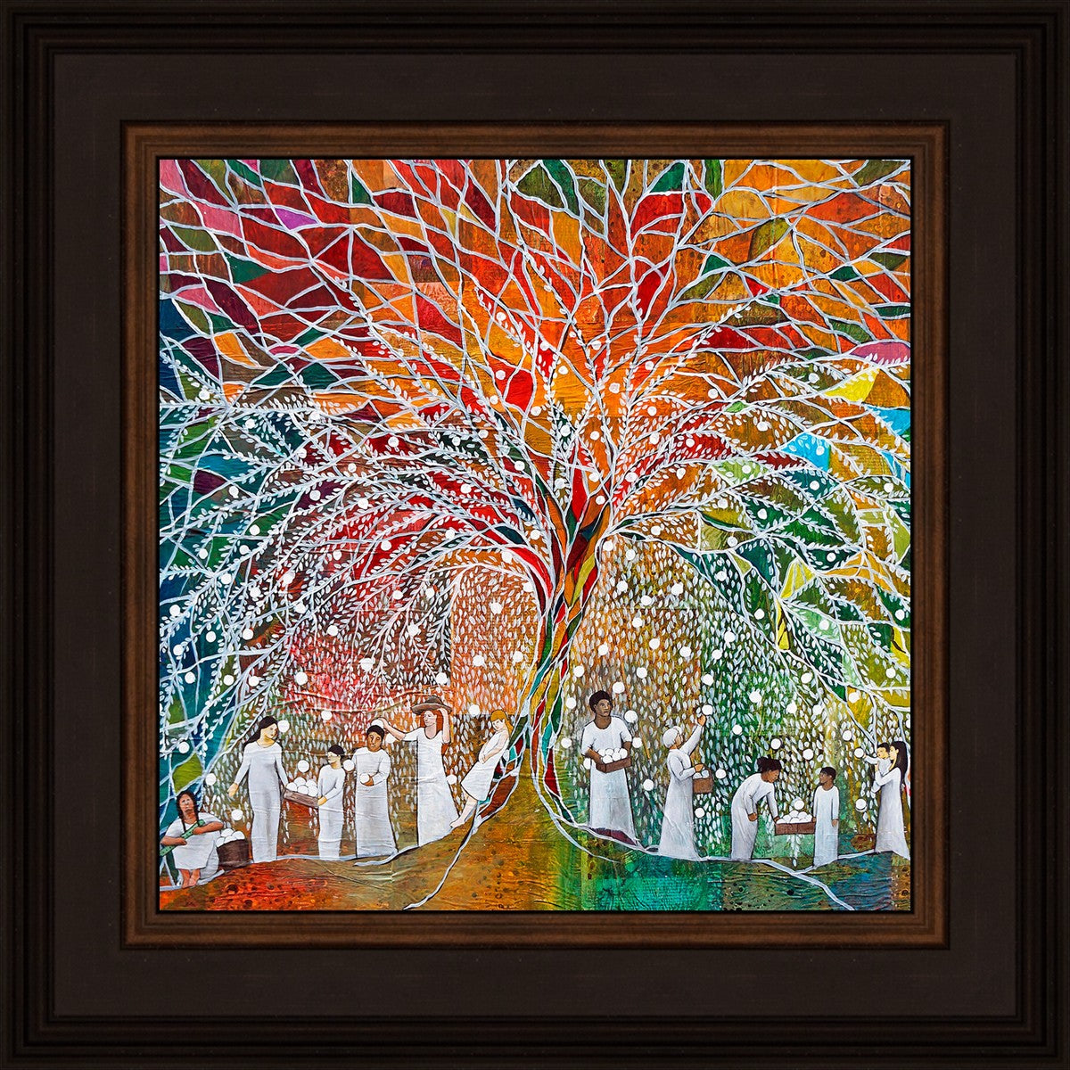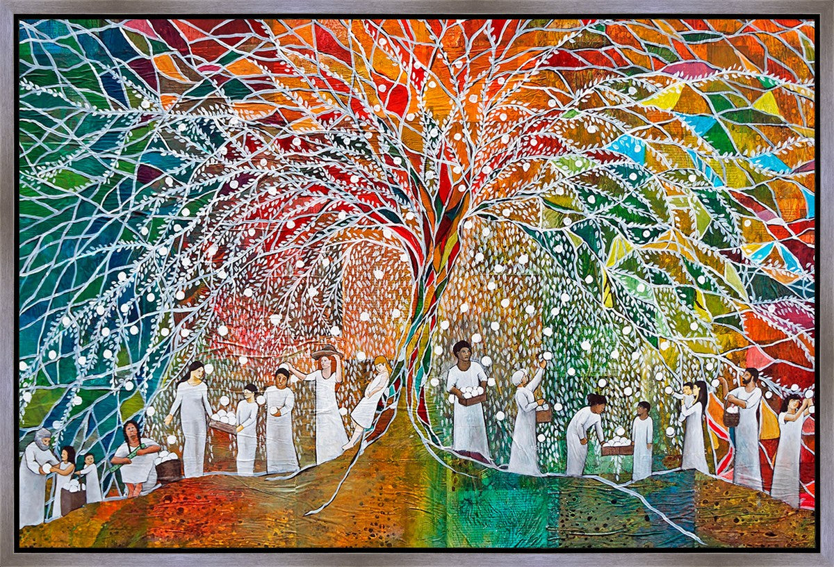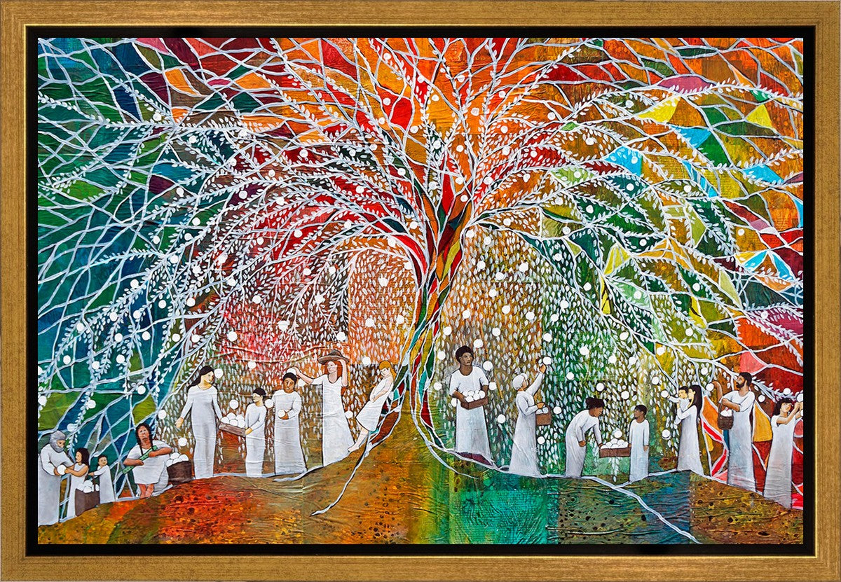 “All are alike unto God,”--I chose to address this concept on a cultural level, attempting to address the pain that racism causes many individuals. The tree and its fruit represent the love of God, and people from different races collect the glowing orbs. The snowy branches of the tree provide a framework for a myriad of colors. To me, these rainbow shards represent God’s excitement and awareness in creating diversity, and that all the colors must work together for optimal beauty. Only when all of the colors of the rainbow are combined does white appear--the hue representing purity and peace.The tree is large and all-encompassing, providing and making room for any who desire to approach and gather. God’s love extends to all of His children, and He gives us the opportunity not only to partake of His love, but to share its abundance.