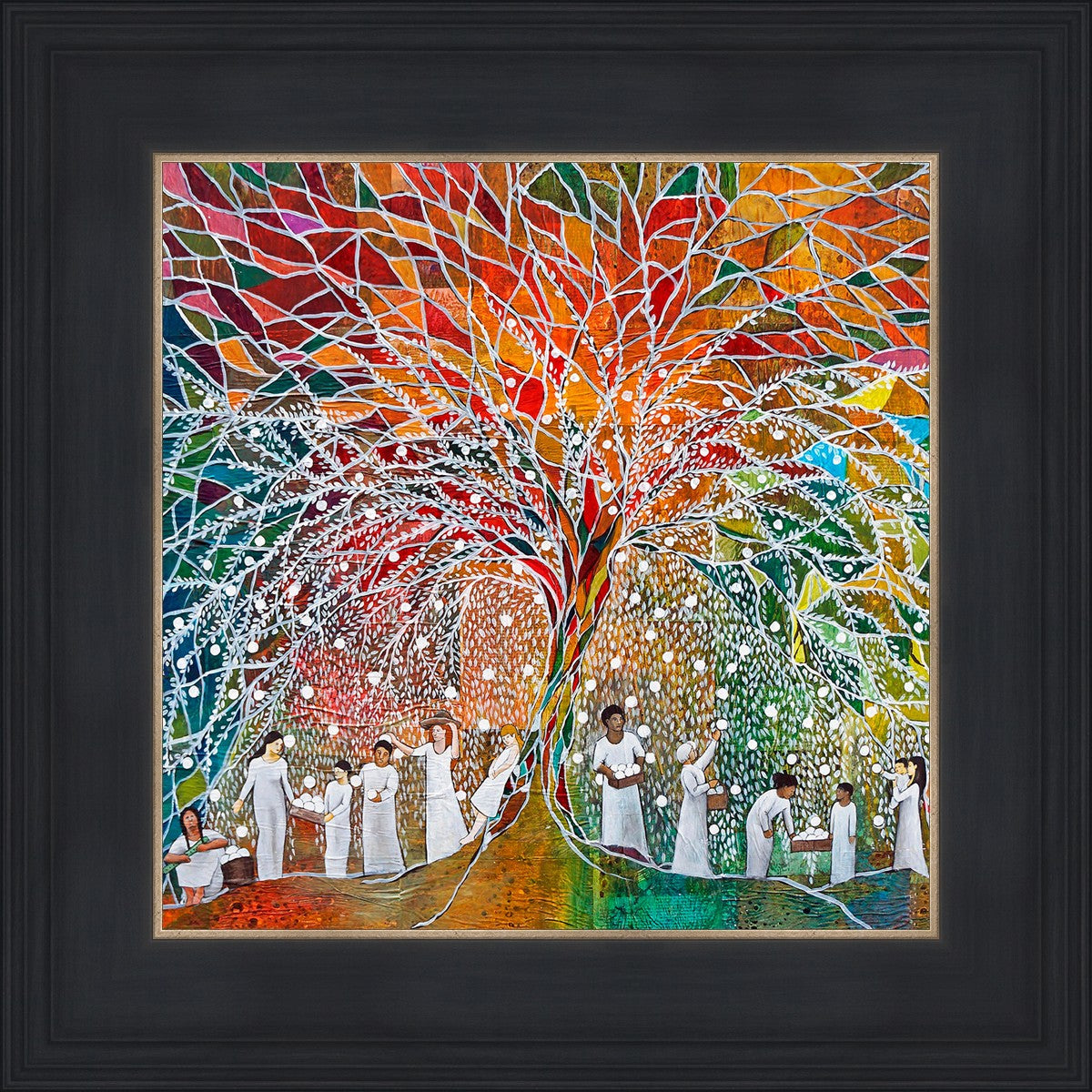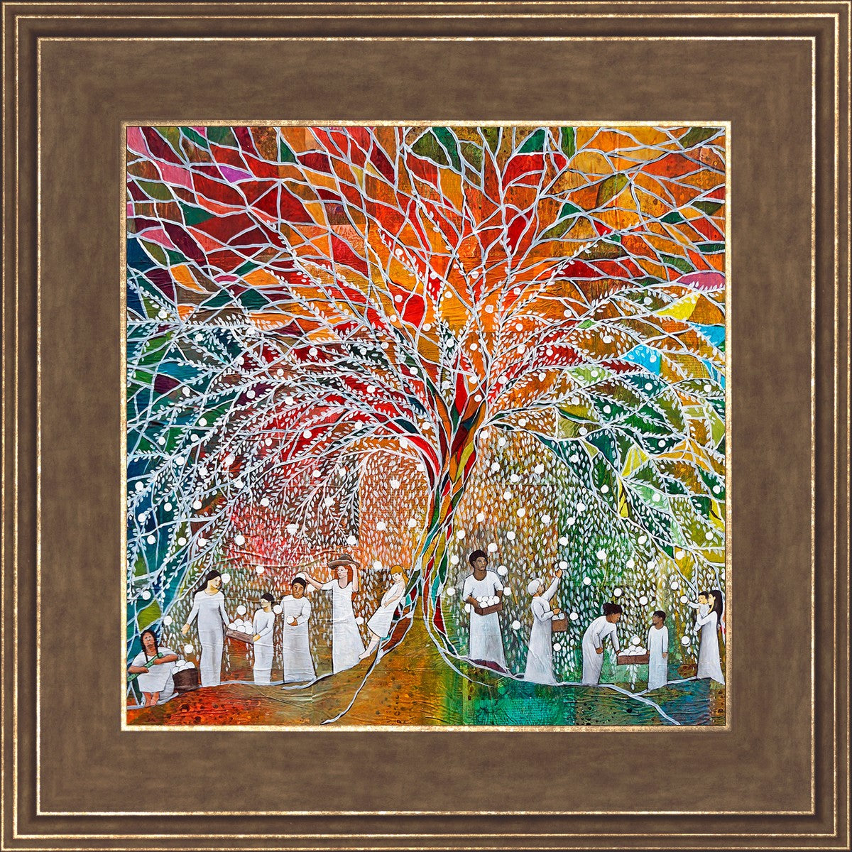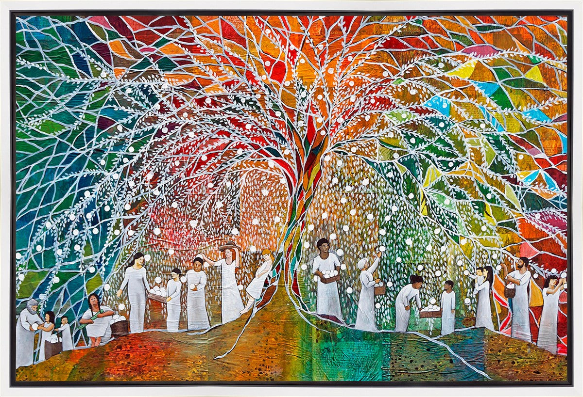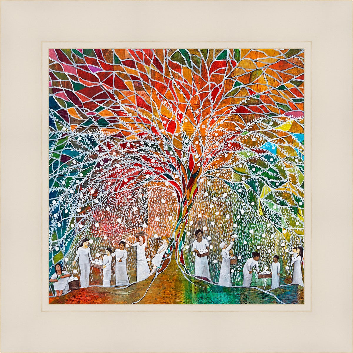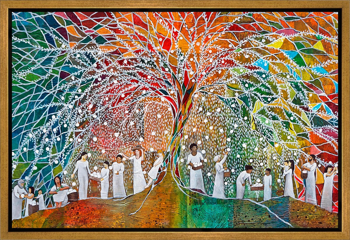 “All are alike unto God,”--I chose to address this concept on a cultural level, attempting to address the pain that racism causes many individuals. The tree and its fruit represent the love of God, and people from different races collect the glowing orbs. The snowy branches of the tree provide a framework for a myriad of colors. To me, these rainbow shards represent God’s excitement and awareness in creating diversity, and that all the colors must work together for optimal beauty. Only when all of the colors of the rainbow are combined does white appear--the hue representing purity and peace.The tree is large and all-encompassing, providing and making room for any who desire to approach and gather. God’s love extends to all of His children, and He gives us the opportunity not only to partake of His love, but to share its abundance.