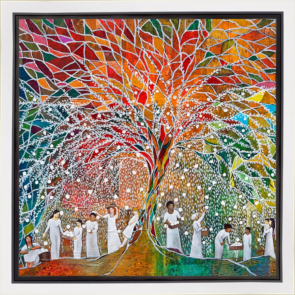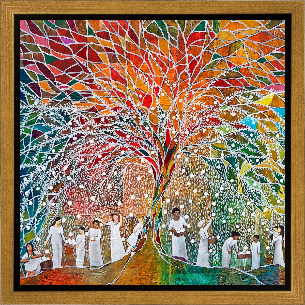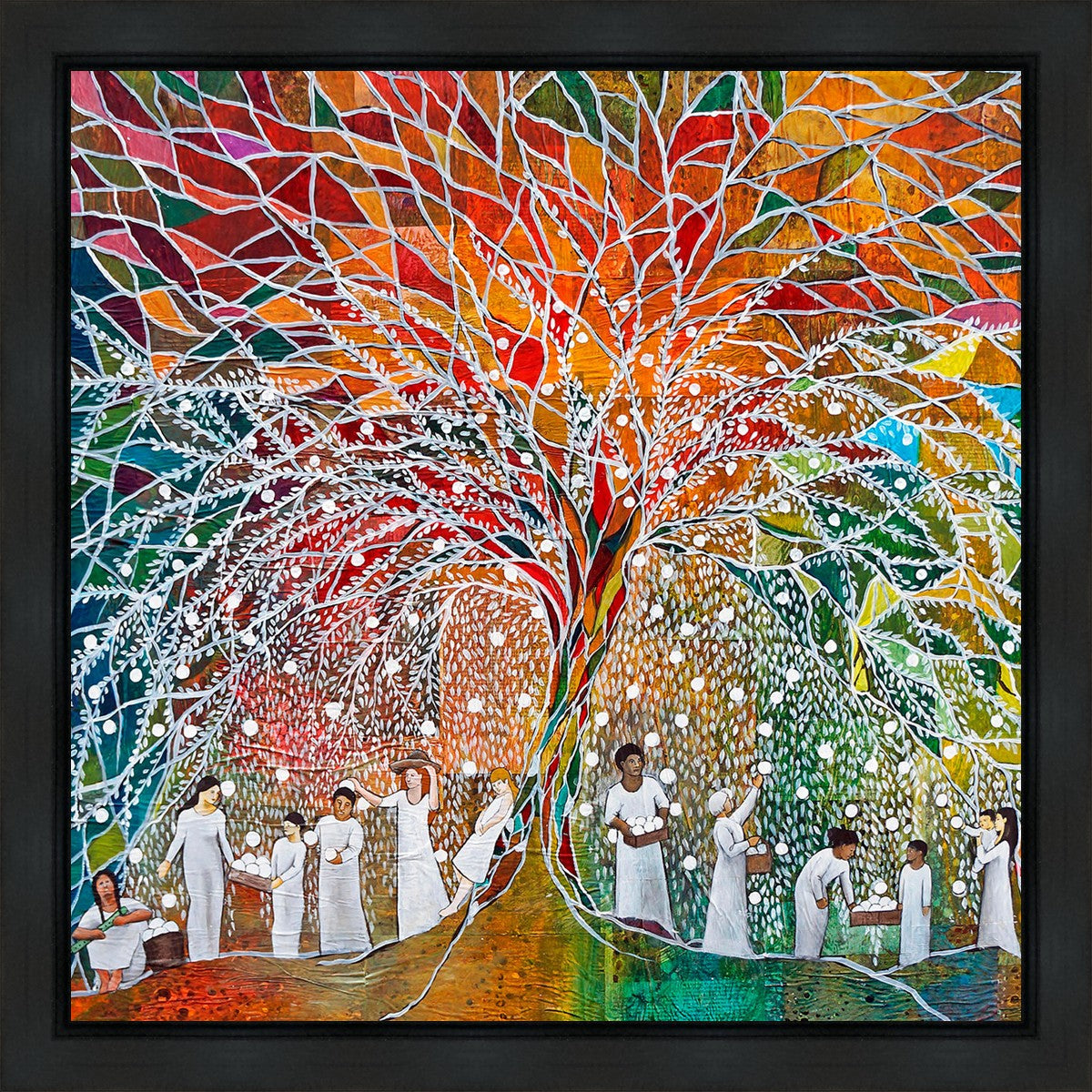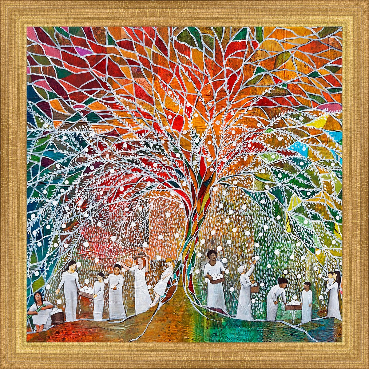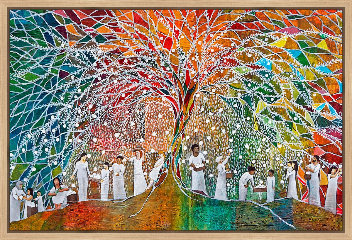 “All are alike unto God,”--I chose to address this concept on a cultural level, attempting to address the pain that racism causes many individuals. The tree and its fruit represent the love of God, and people from different races collect the glowing orbs. The snowy branches of the tree provide a framework for a myriad of colors. To me, these rainbow shards represent God’s excitement and awareness in creating diversity, and that all the colors must work together for optimal beauty. Only when all of the colors of the rainbow are combined does white appear--the hue representing purity and peace.The tree is large and all-encompassing, providing and making room for any who desire to approach and gather. God’s love extends to all of His children, and He gives us the opportunity not only to partake of His love, but to share its abundance.