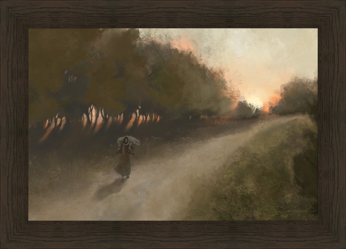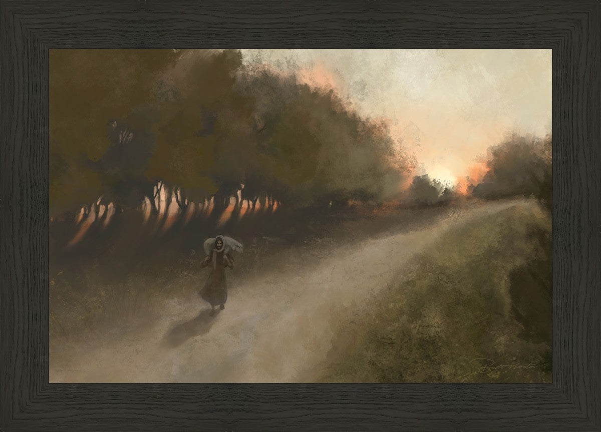 Inspired by the New Testament parable of the Lost Sheep, this piece is a reminder that Christ leaves the 99 the search for the one. This piece depicts the Good Shepherd after a long day of searching, coming home with his precious lost sheep. This piece was created during some scary and potentially life threatening pregnancy complications the artist experienced with her second daughter . The dark, moody colors echo the fear and uncertainty the artist had to navigate while also reconciling her faith that the situation was in God’s hands. When the artist completed the piece, it was a confirmation to her that like the sheep, Christ would carry her through this.