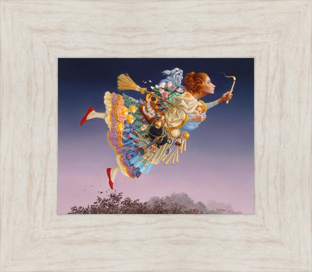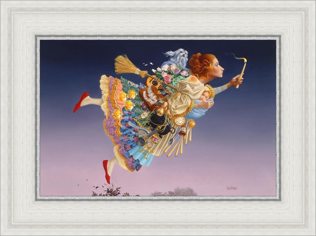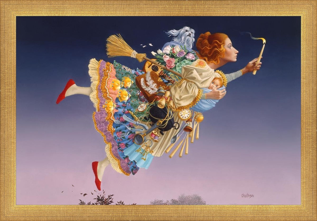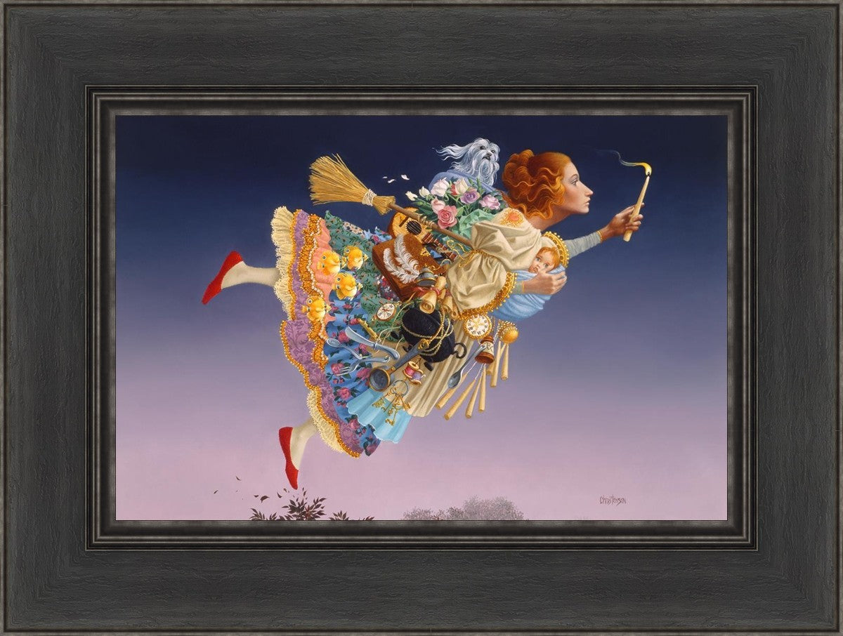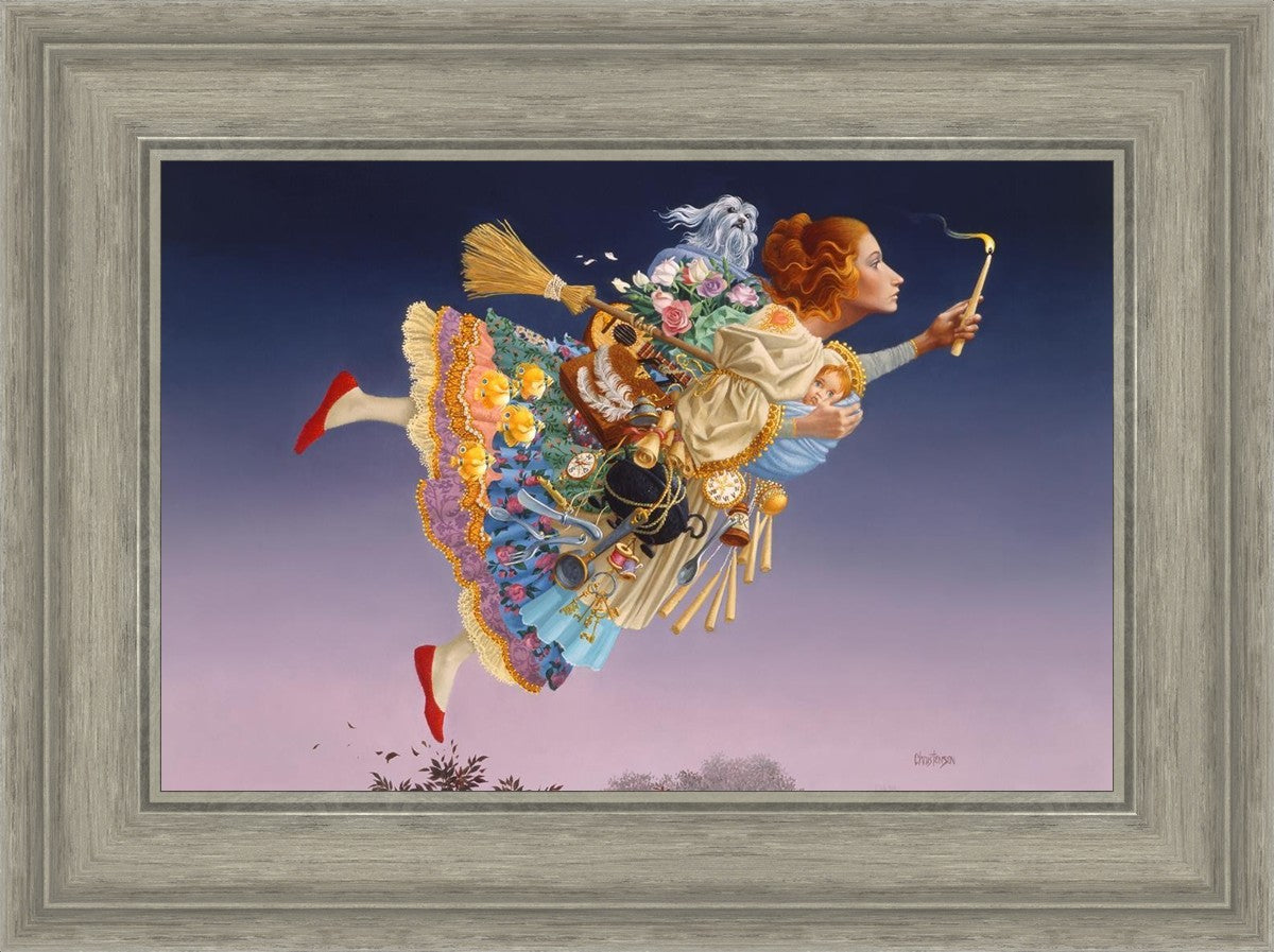 This painting is an homage to artist James Christensen's wife, Carole. He began to contemplate all her roles in life and the many weighty responsibilities she shouldered as a full-time wife and mother of five young children. Women everywhere relate to the need to confidently soar above life’s troubles and challenges. In a given day she may shuttle the children, prepare a gourmet feast, keep to hectic time schedules and more, but she always keeps her head up and carries the light of hope to those around her. A delightful gift to honor a wife, mother, grandmother, sister or any heroic woman in your life.
