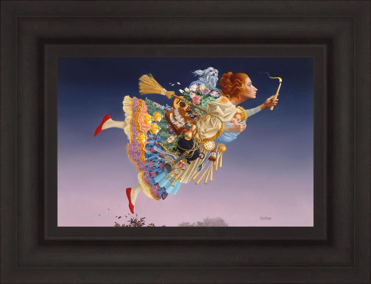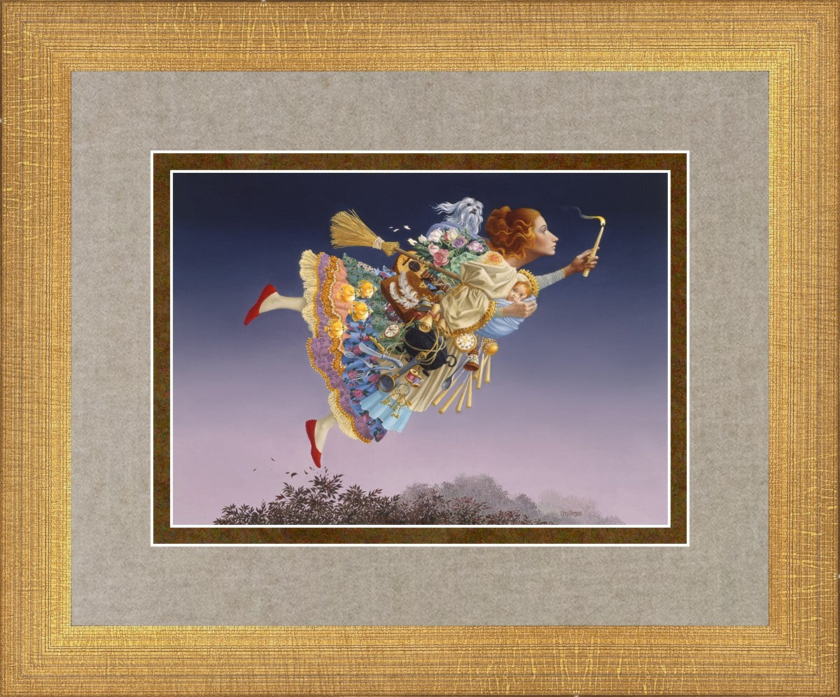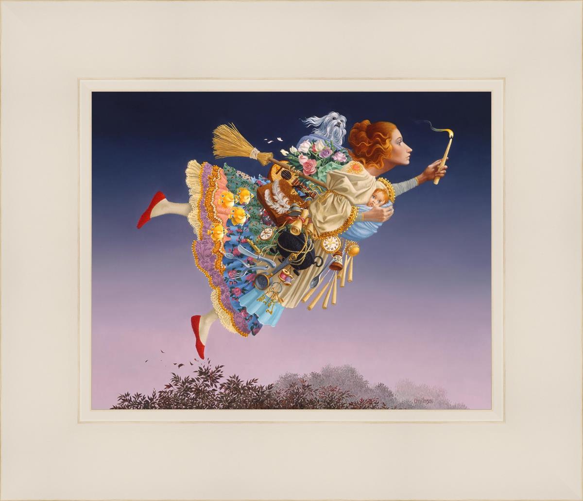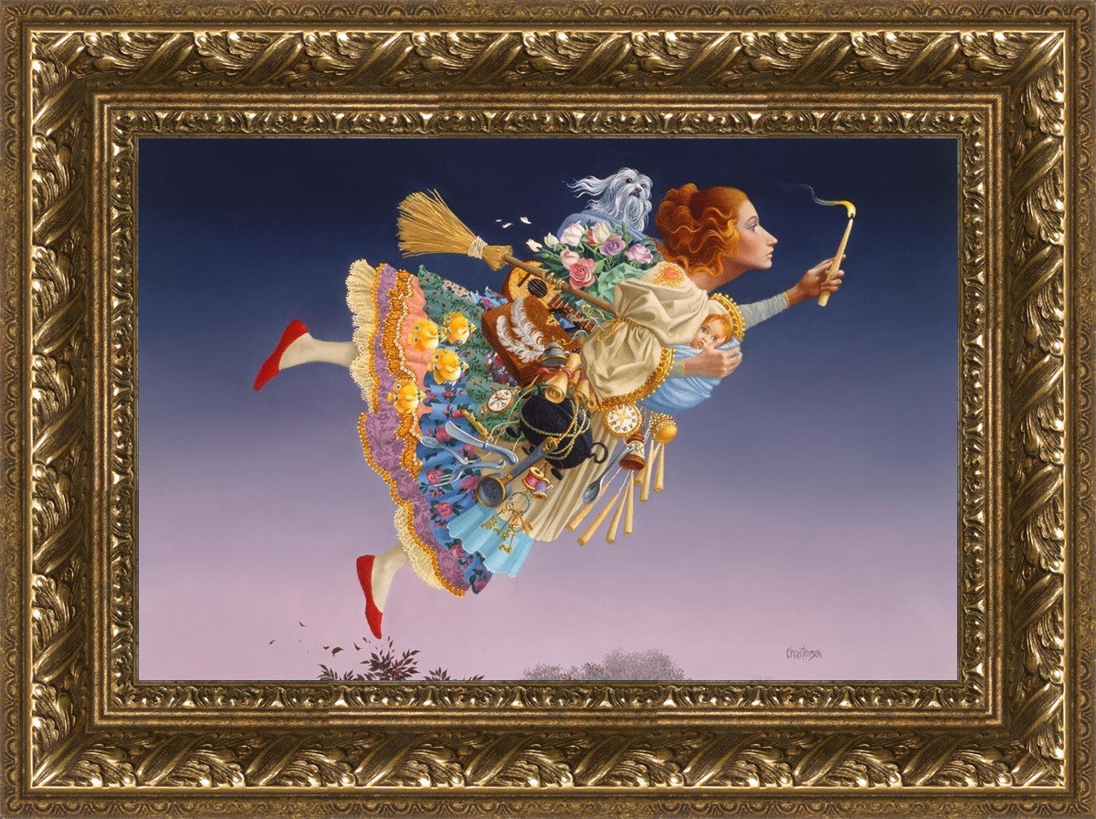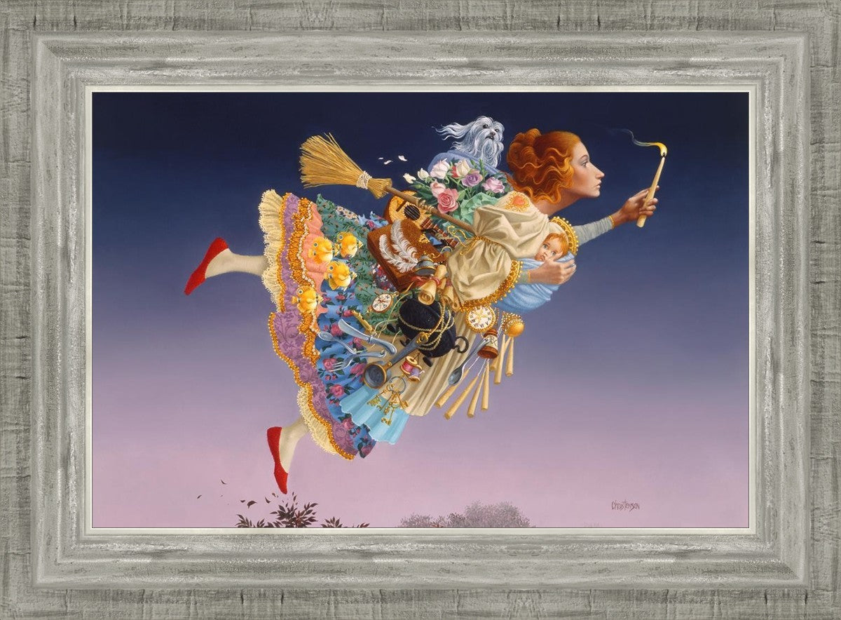 This painting is an homage to artist James Christensen's wife, Carole. He began to contemplate all her roles in life and the many weighty responsibilities she shouldered as a full-time wife and mother of five young children. Women everywhere relate to the need to confidently soar above life’s troubles and challenges. In a given day she may shuttle the children, prepare a gourmet feast, keep to hectic time schedules and more, but she always keeps her head up and carries the light of hope to those around her. A delightful gift to honor a wife, mother, grandmother, sister or any heroic woman in your life.