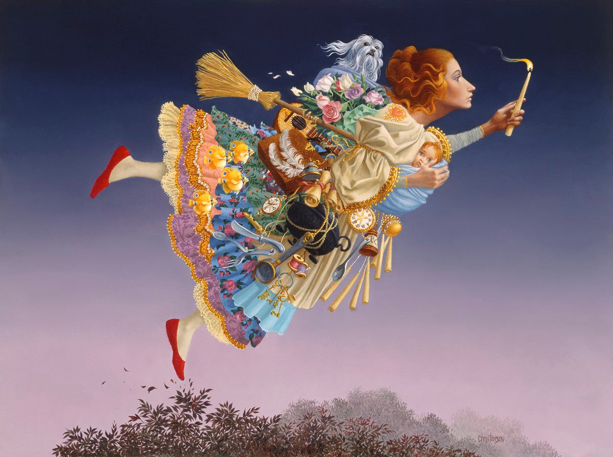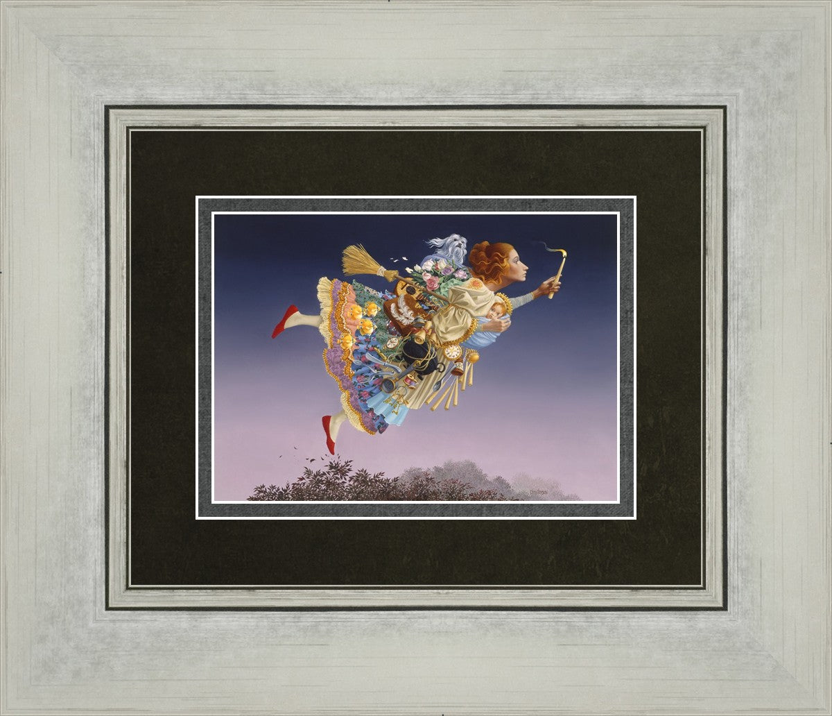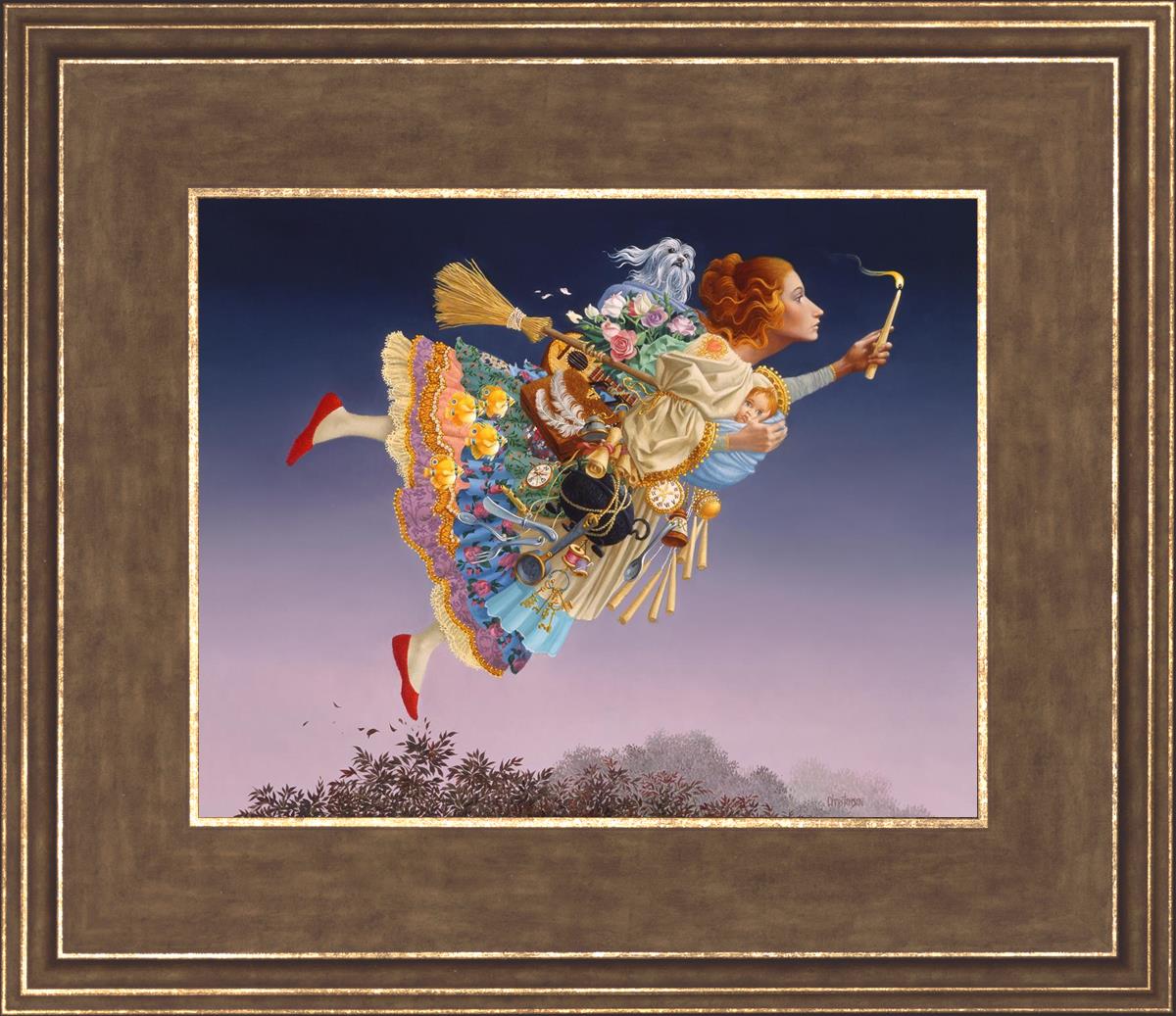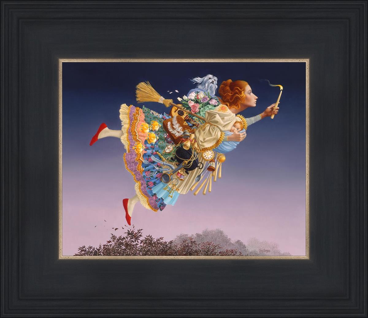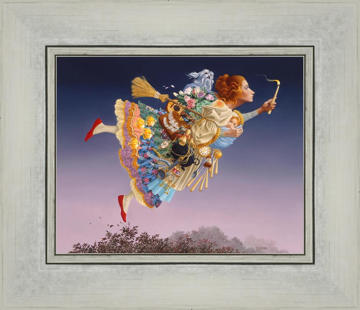 This painting is an homage to artist James Christensen's wife, Carole. He began to contemplate all her roles in life and the many weighty responsibilities she shouldered as a full-time wife and mother of five young children. Women everywhere relate to the need to confidently soar above life’s troubles and challenges. In a given day she may shuttle the children, prepare a gourmet feast, keep to hectic time schedules and more, but she always keeps her head up and carries the light of hope to those around her. A delightful gift to honor a wife, mother, grandmother, sister or any heroic woman in your life.