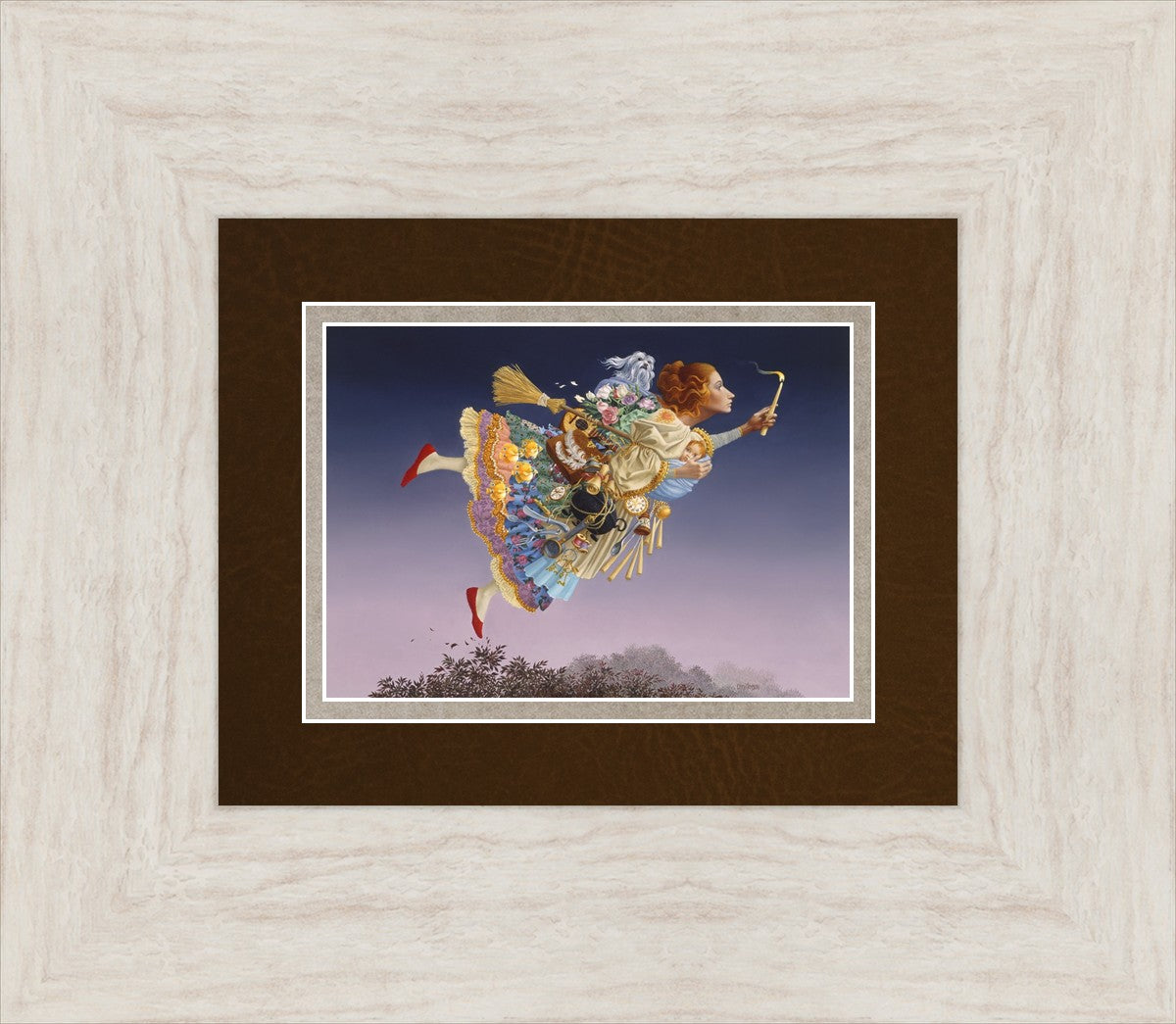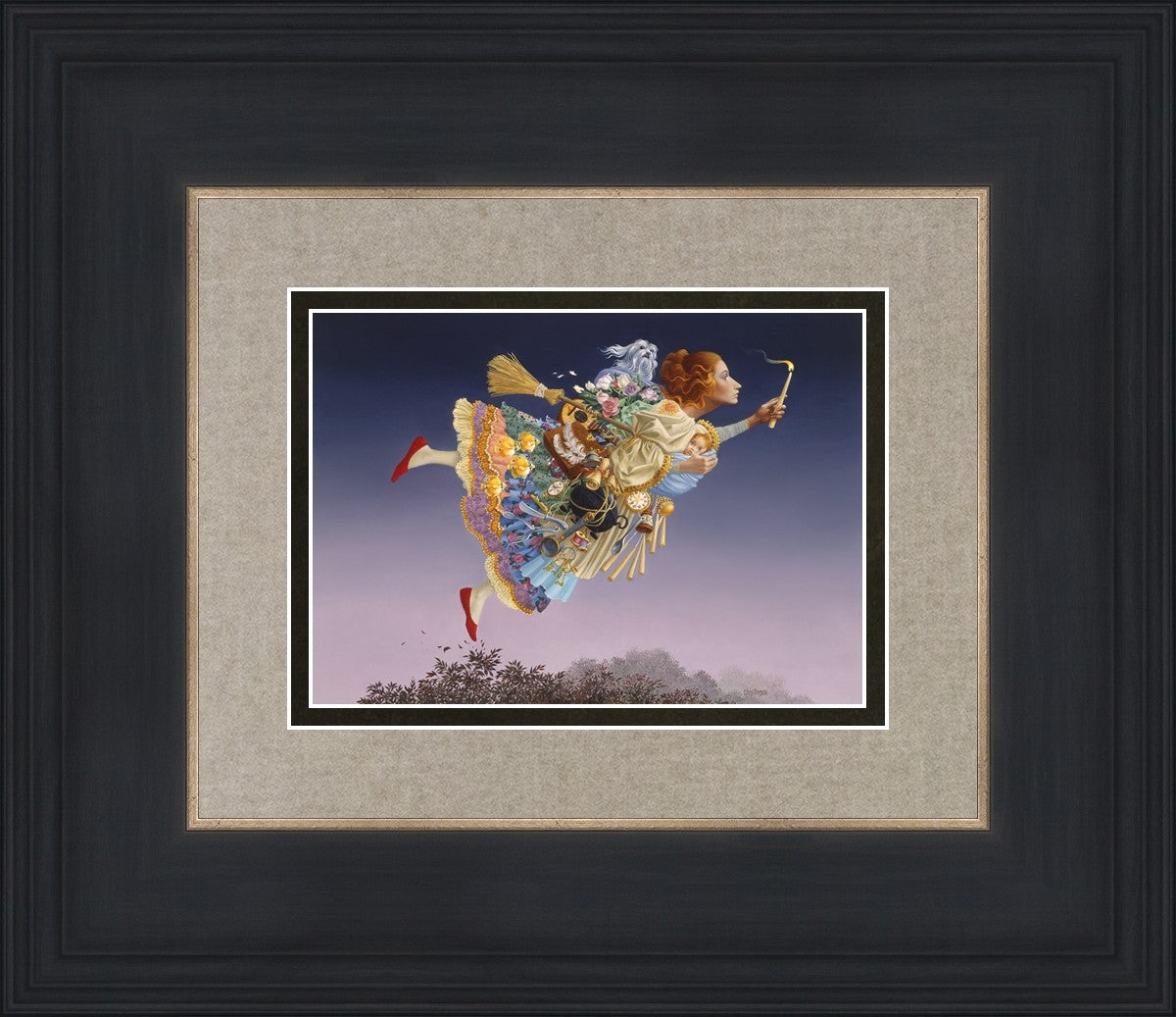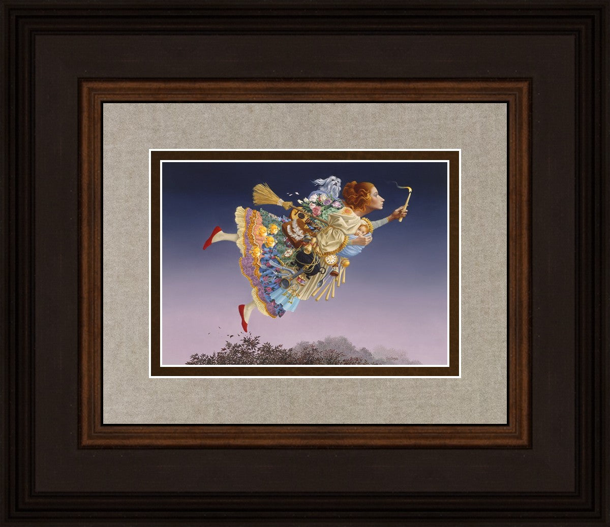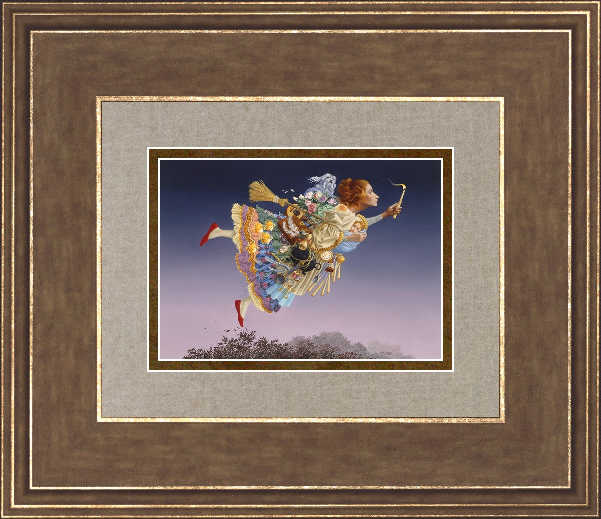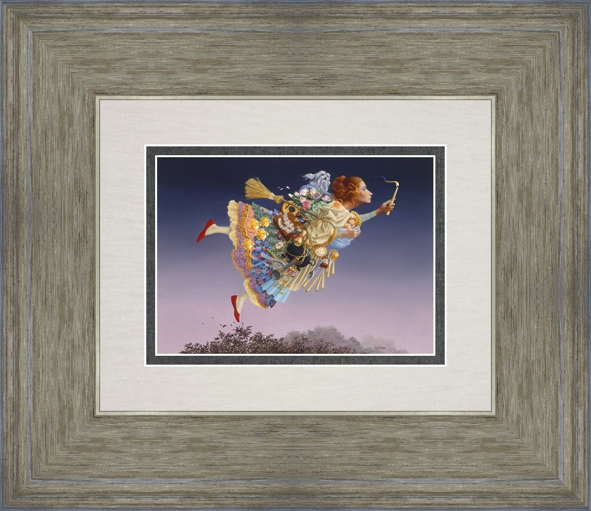 This painting is an homage to artist James Christensen's wife, Carole. He began to contemplate all her roles in life and the many weighty responsibilities she shouldered as a full-time wife and mother of five young children. Women everywhere relate to the need to confidently soar above life’s troubles and challenges. In a given day she may shuttle the children, prepare a gourmet feast, keep to hectic time schedules and more, but she always keeps her head up and carries the light of hope to those around her. A delightful gift to honor a wife, mother, grandmother, sister or any heroic woman in your life.