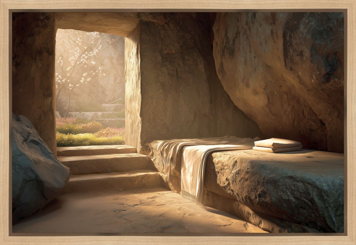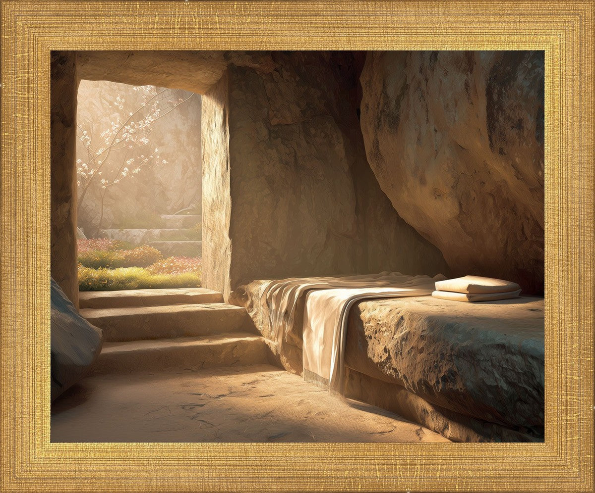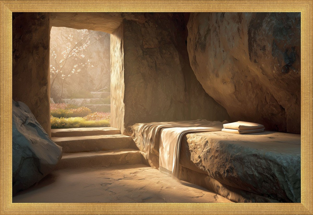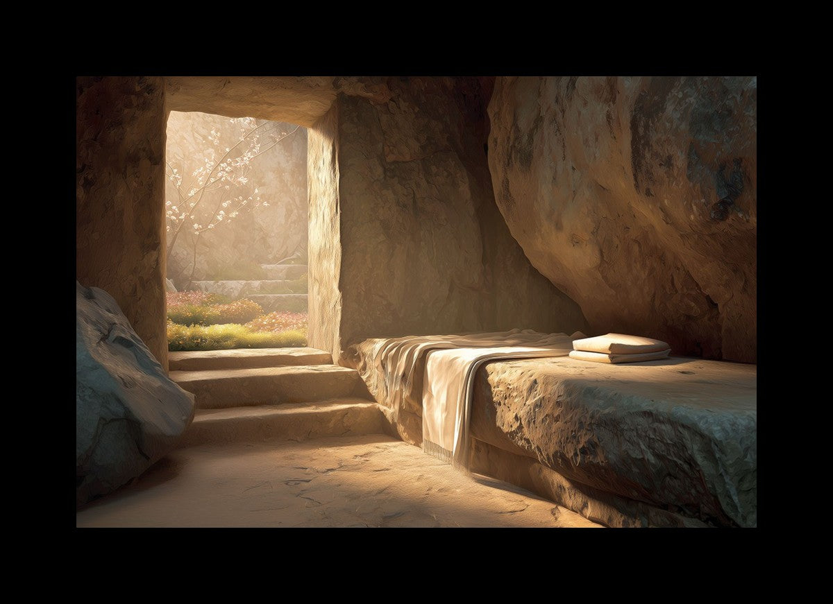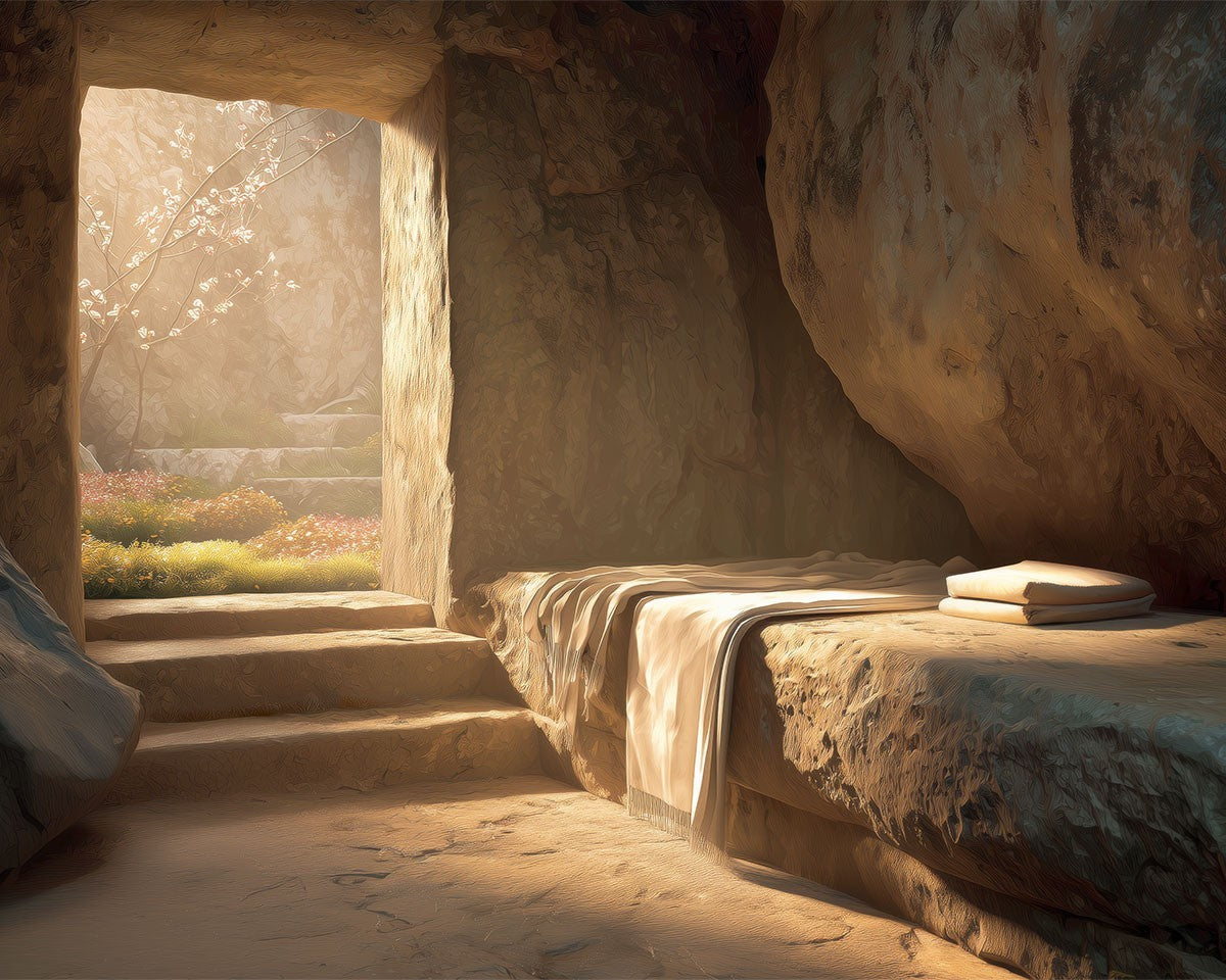 The empty tomb on Easter morning, with linens and folded cloth.