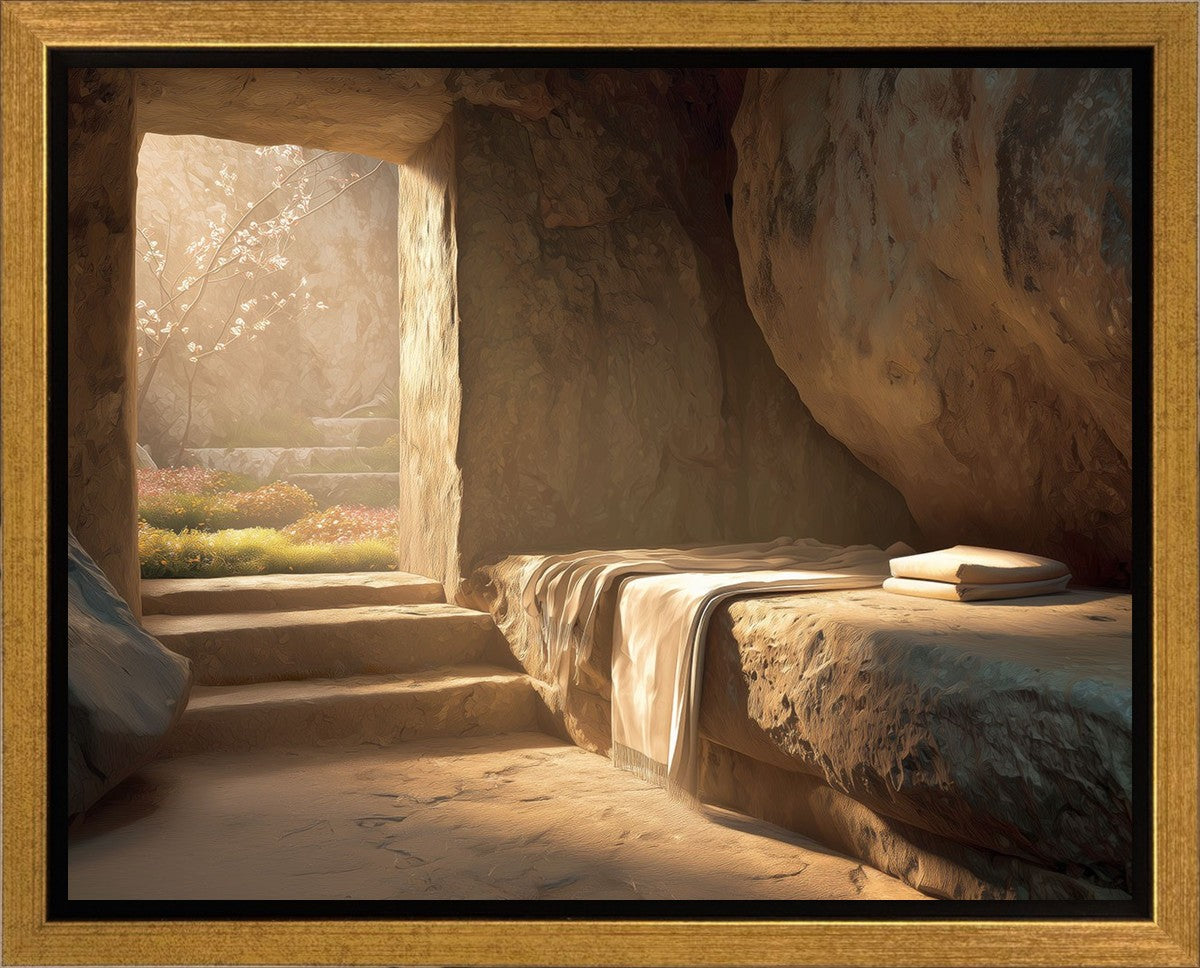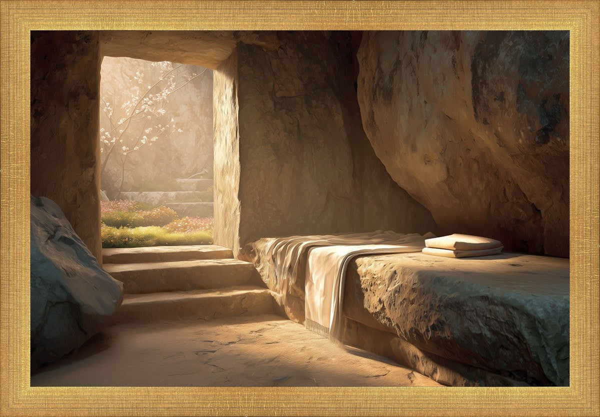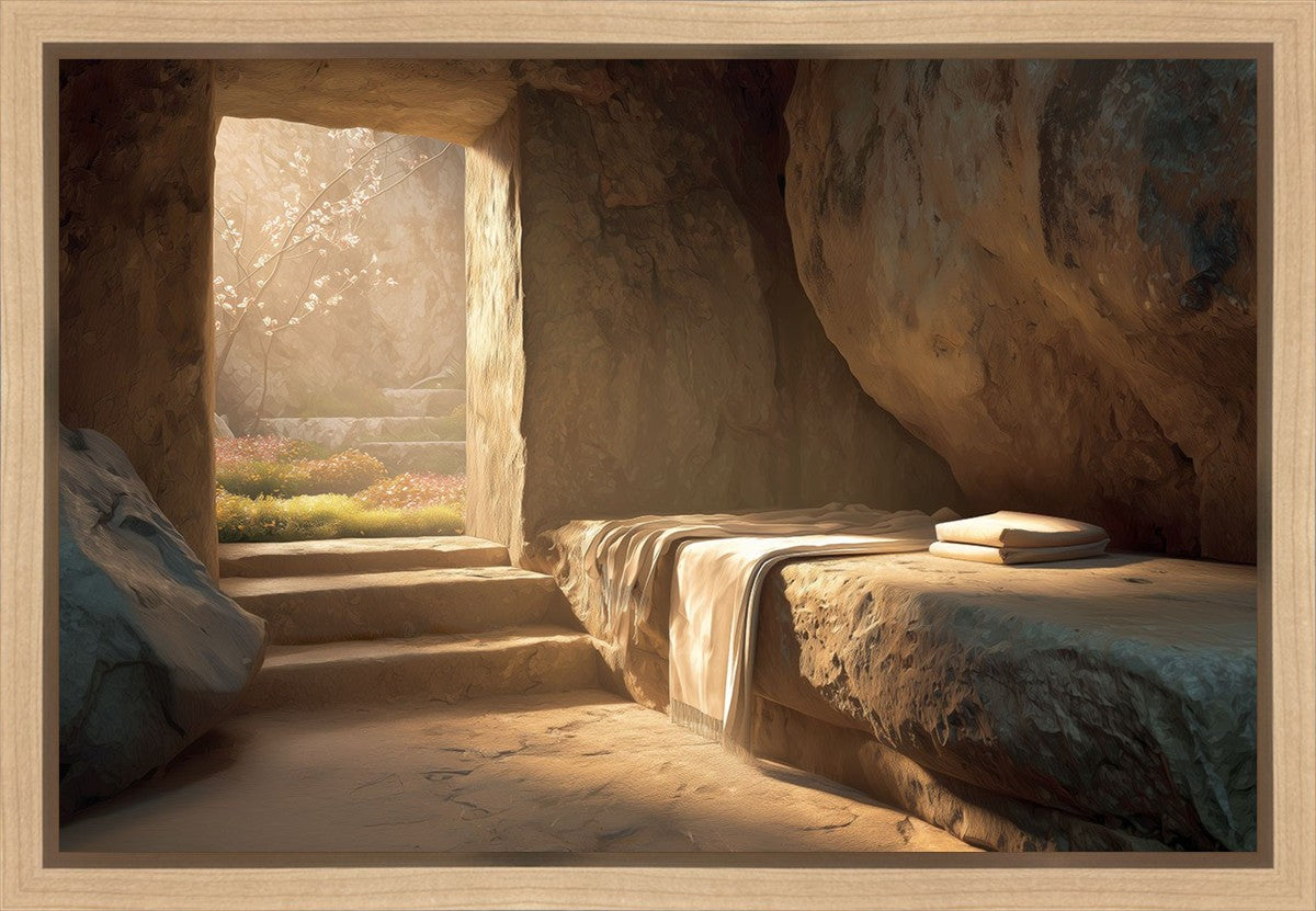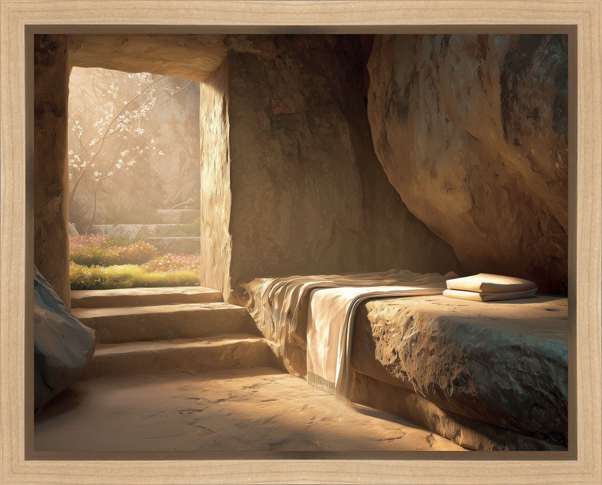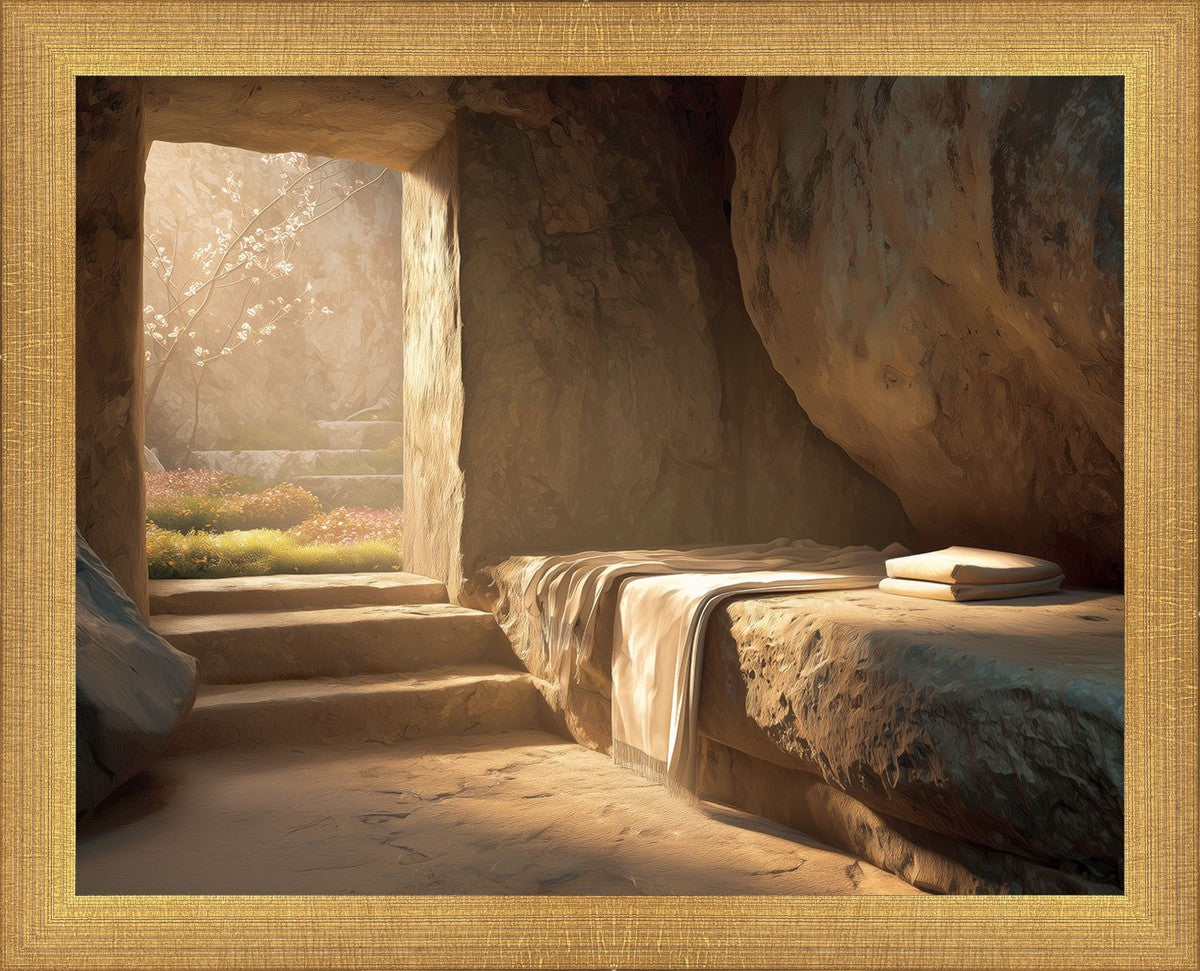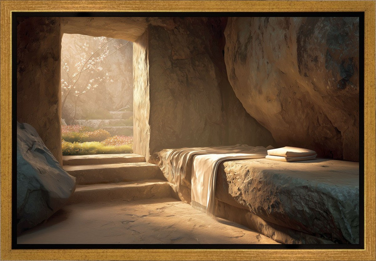 The empty tomb on Easter morning, with linens and folded cloth.