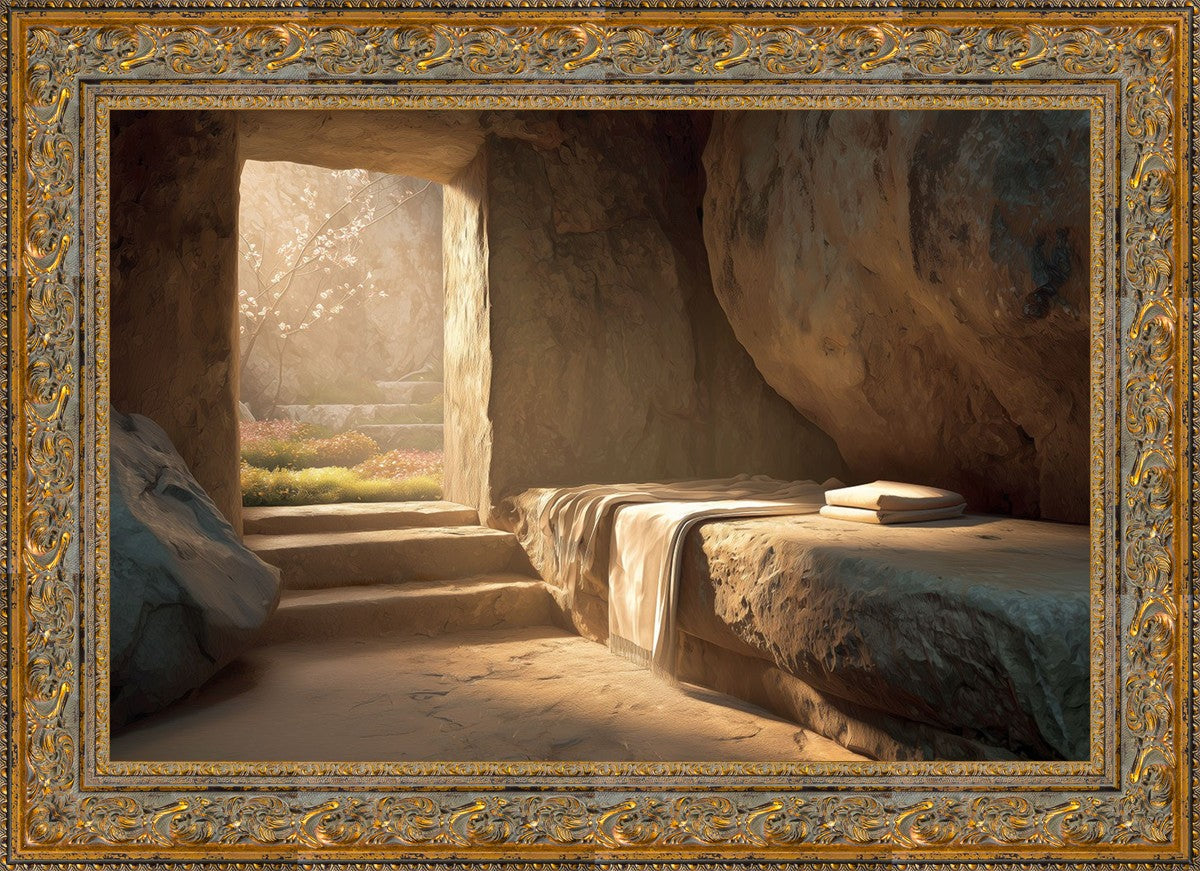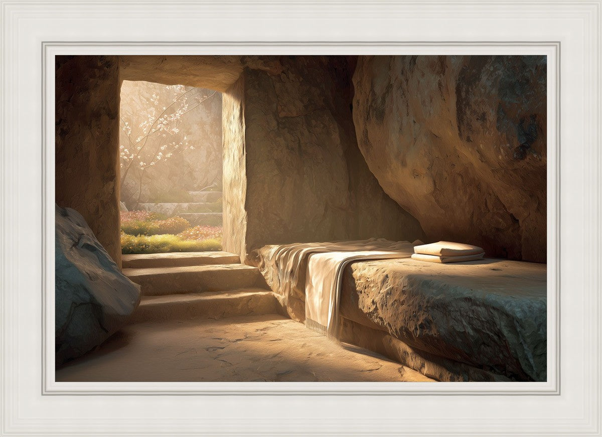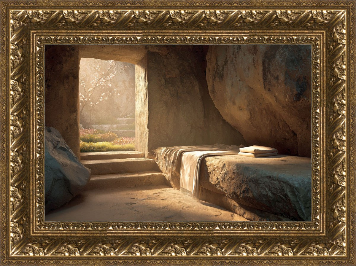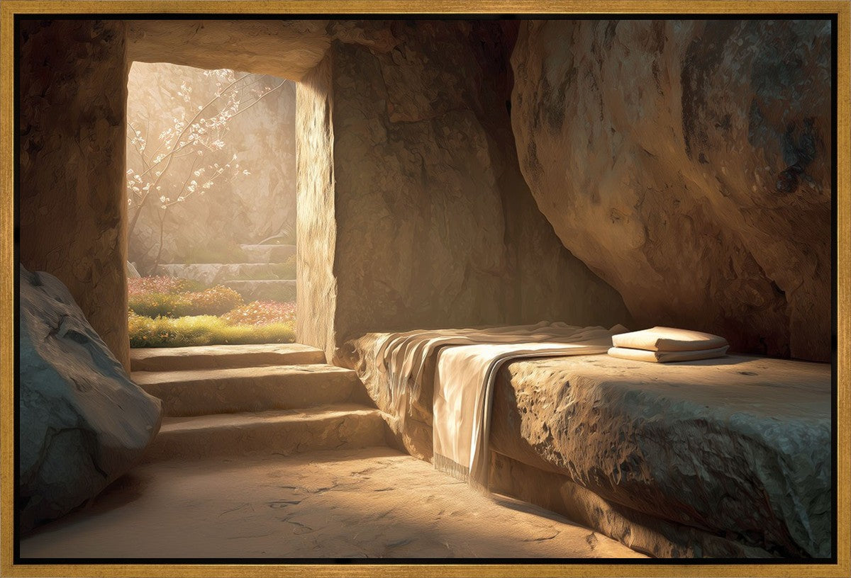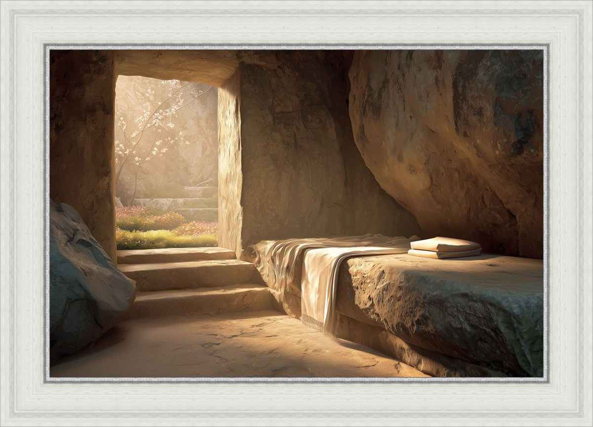 The empty tomb on Easter morning, with linens and folded cloth.