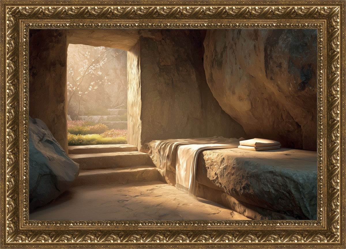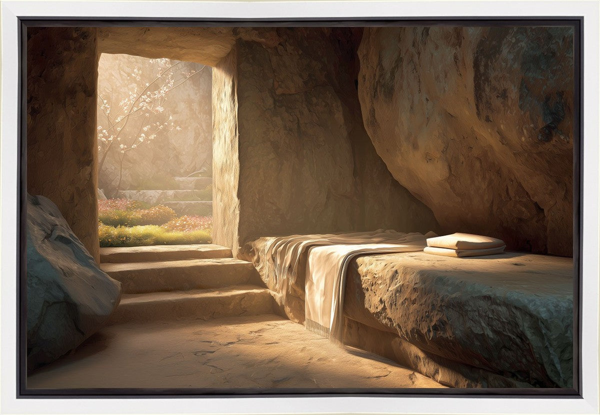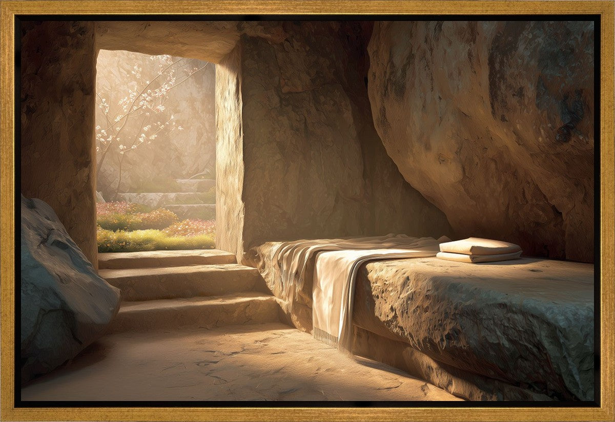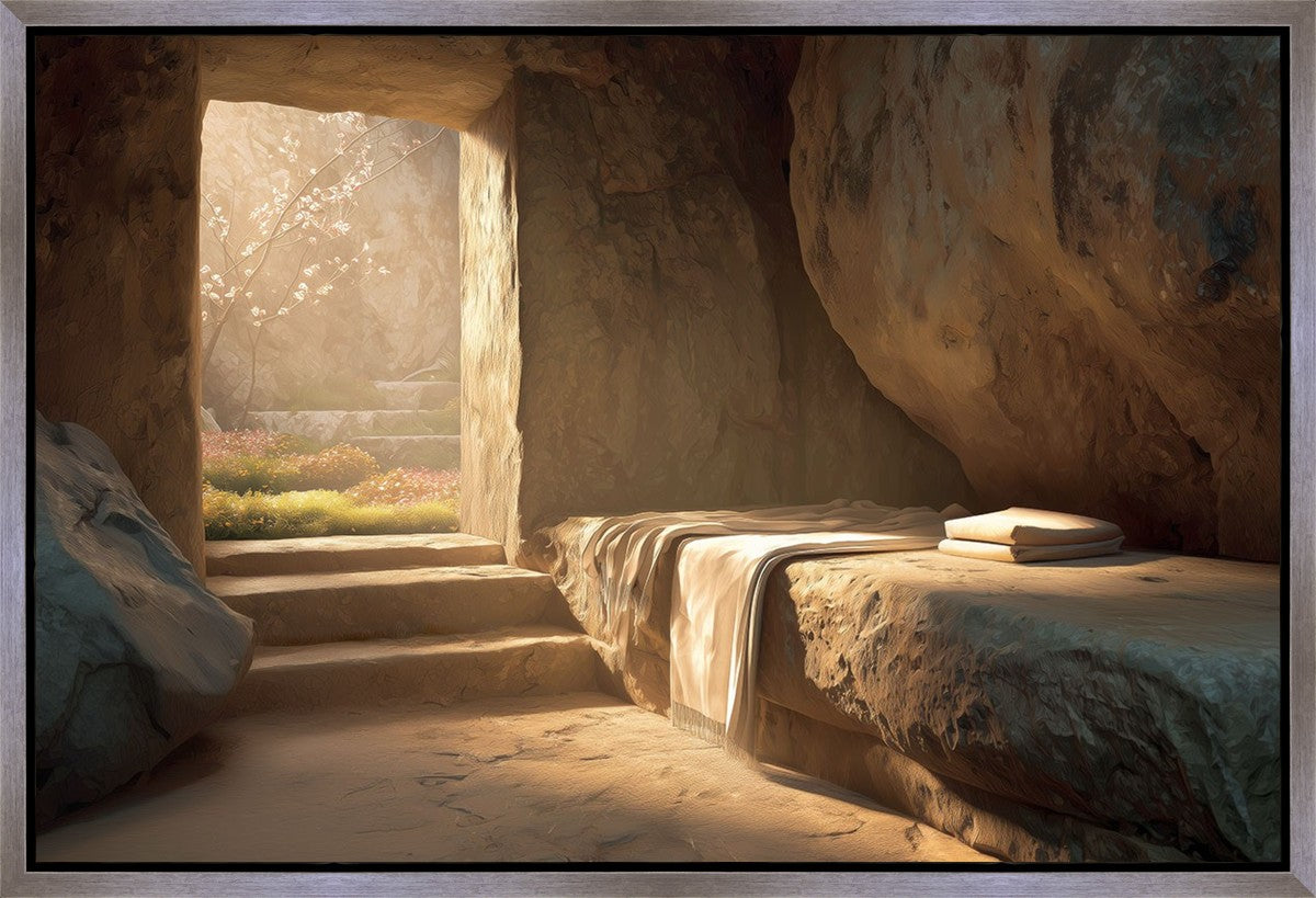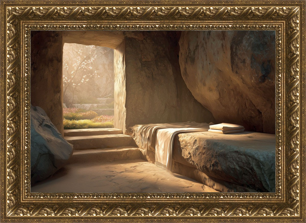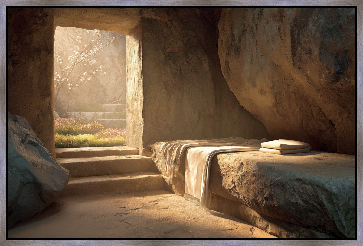 The empty tomb on Easter morning, with linens and folded cloth.
