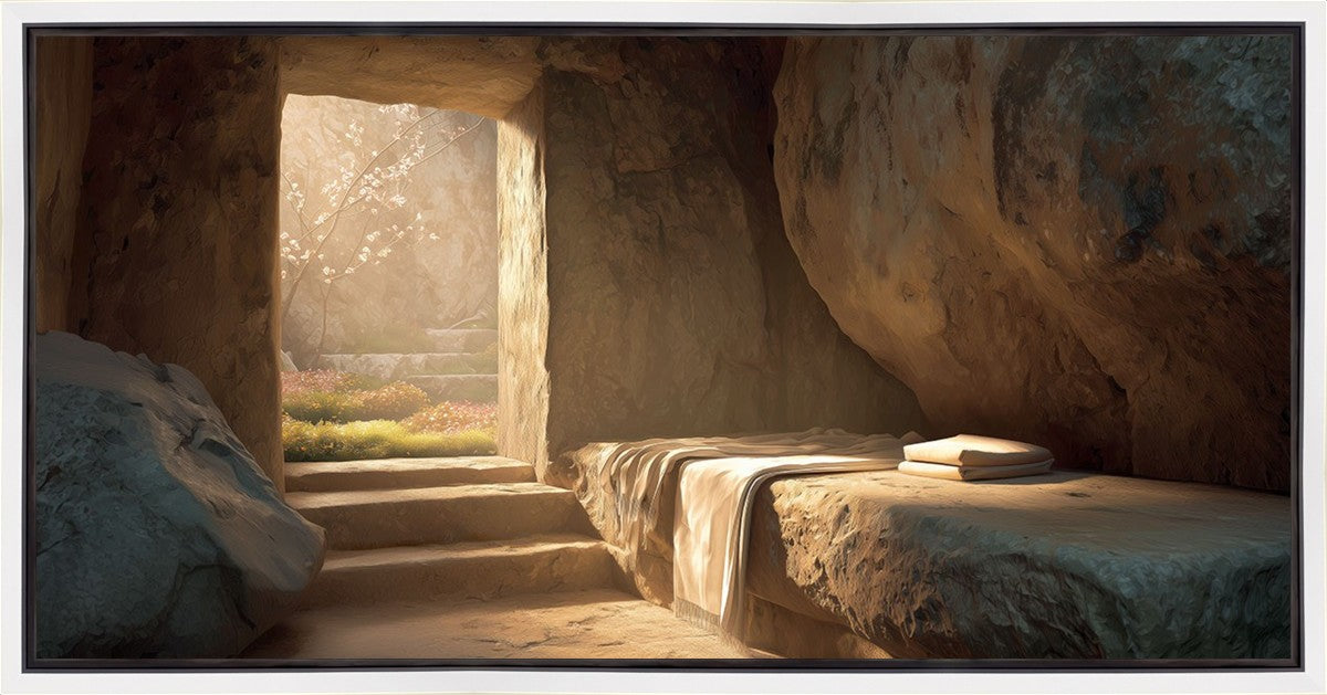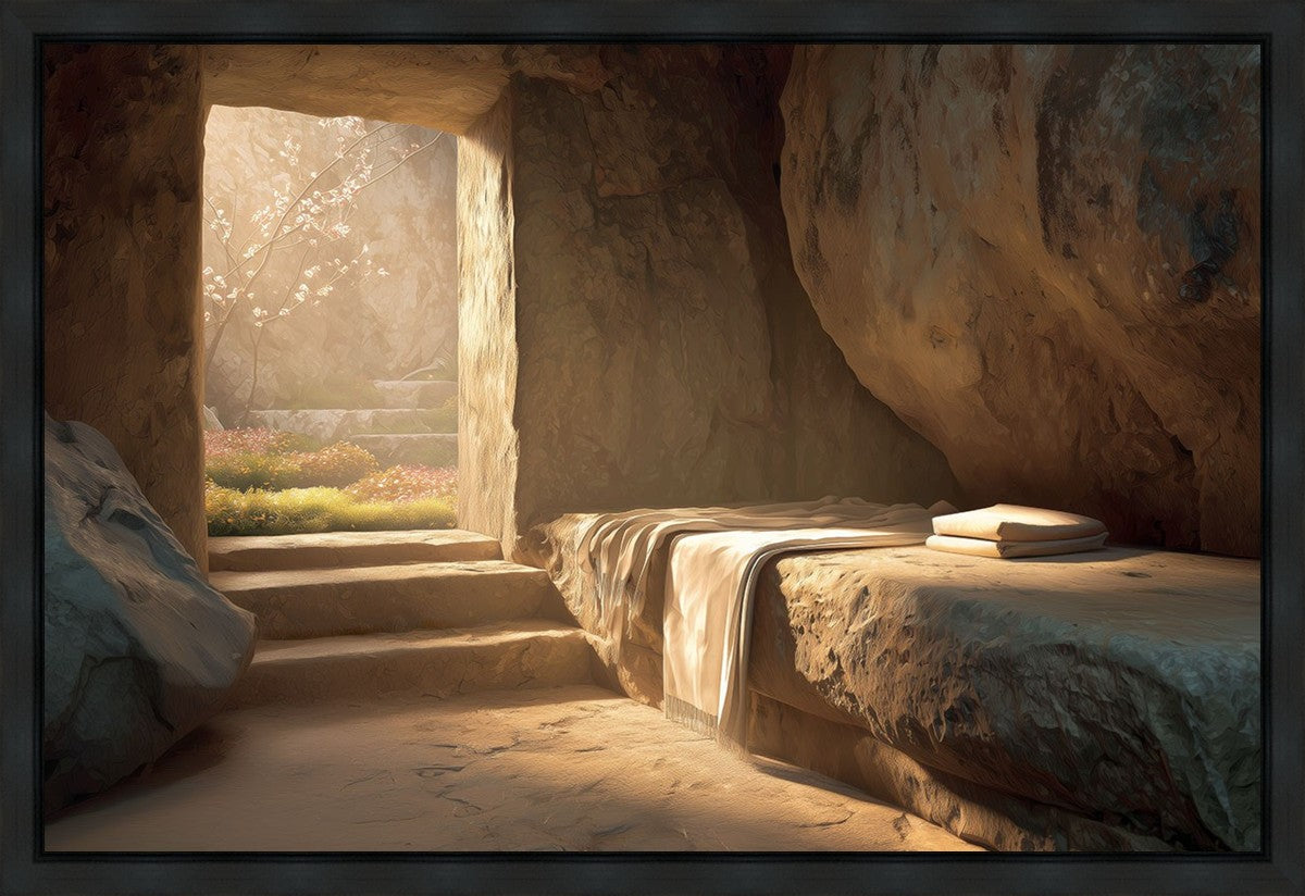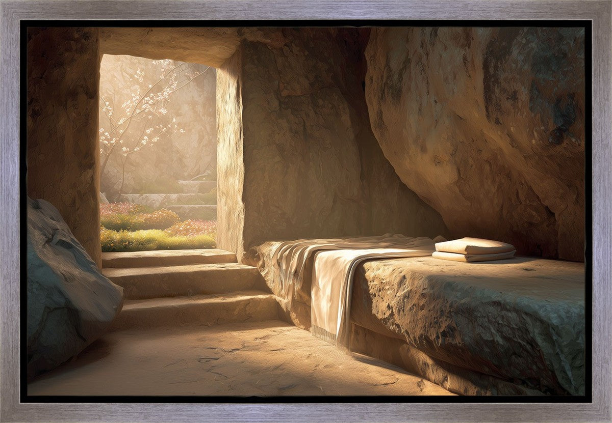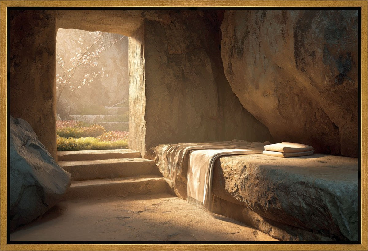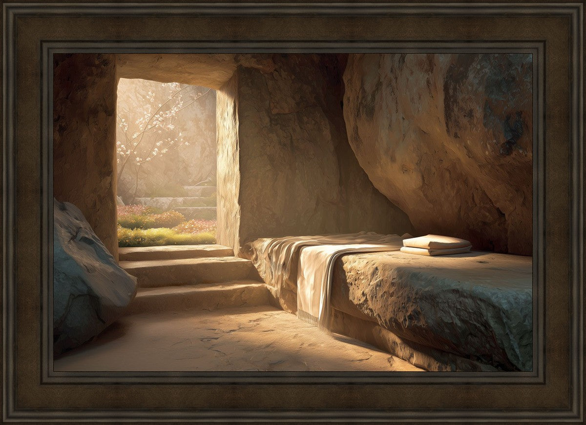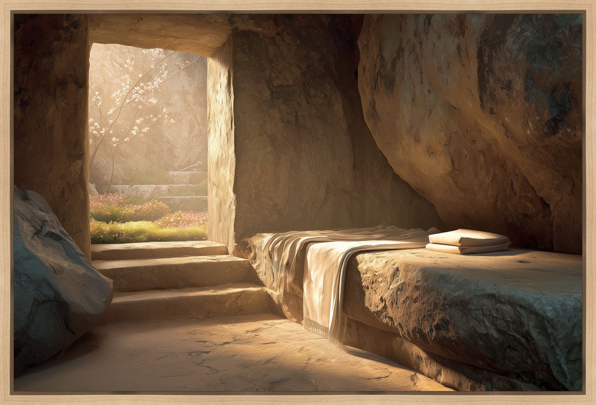 The empty tomb on Easter morning, with linens and folded cloth.