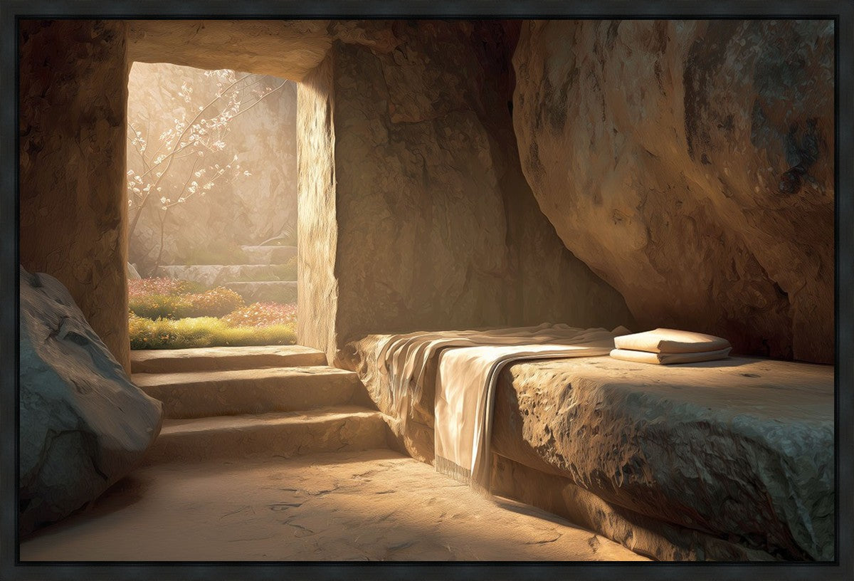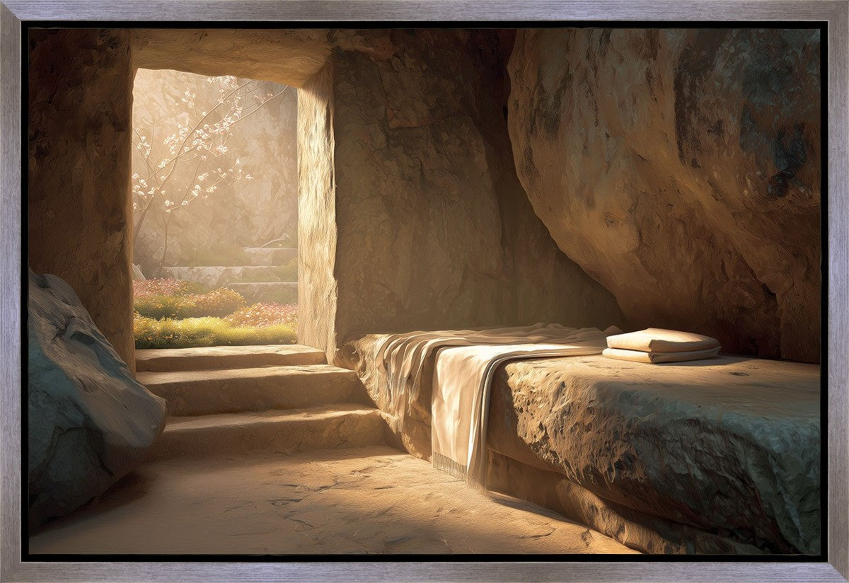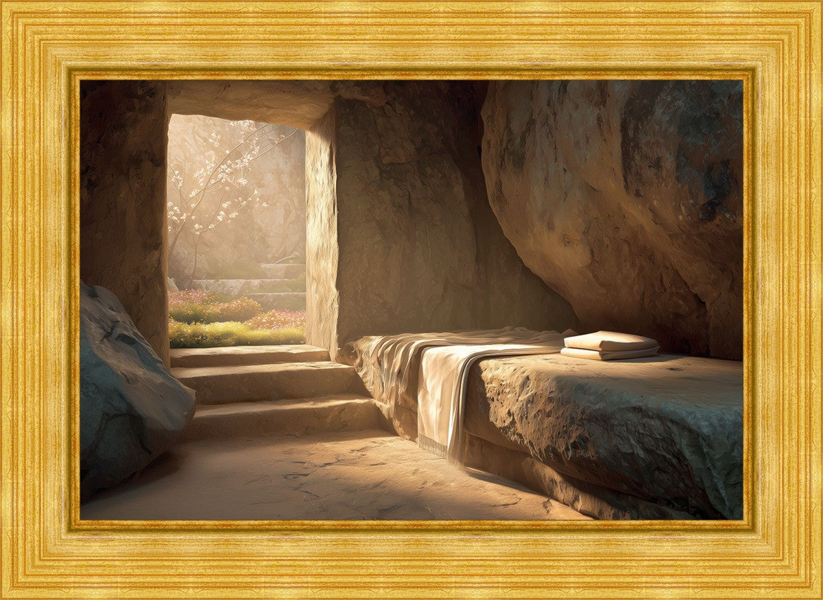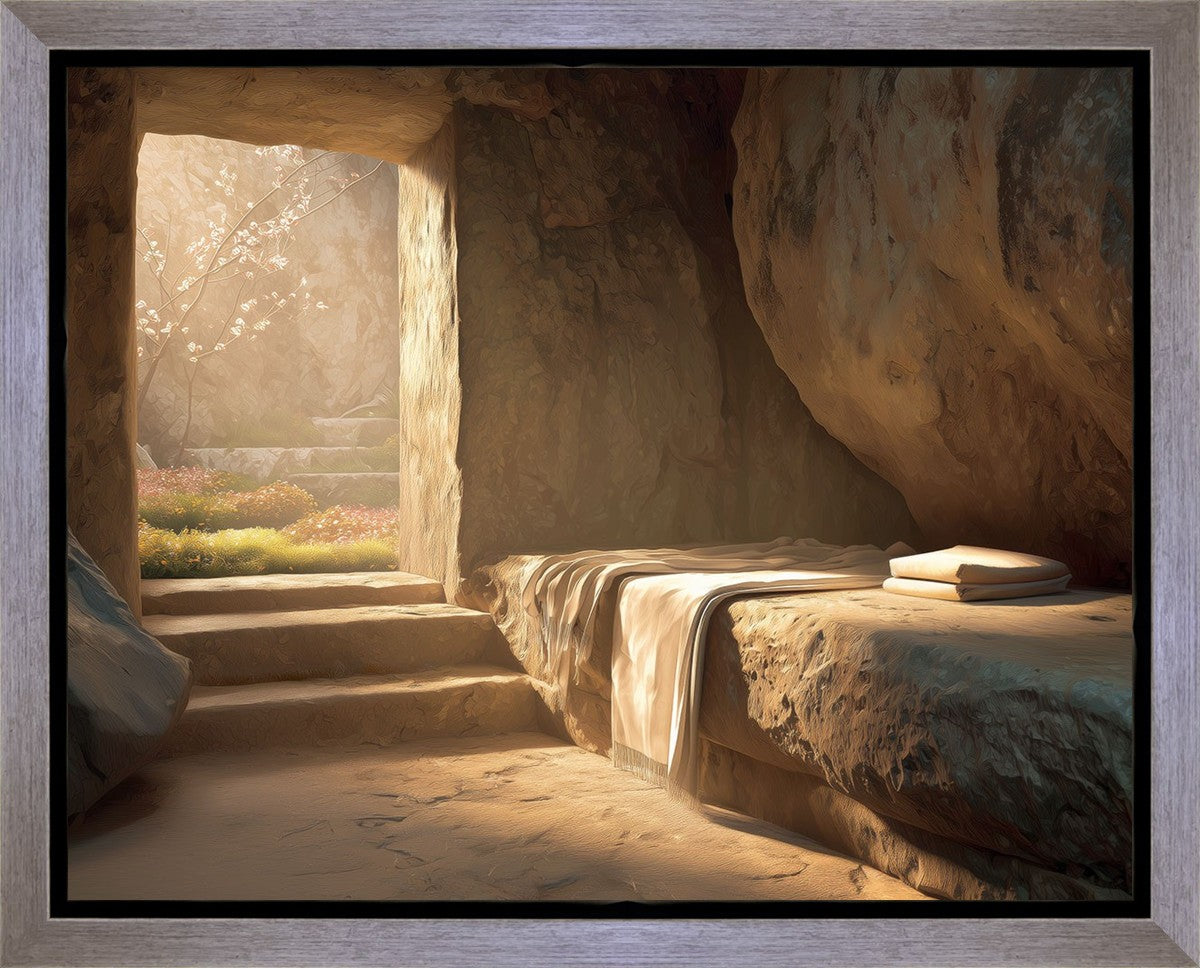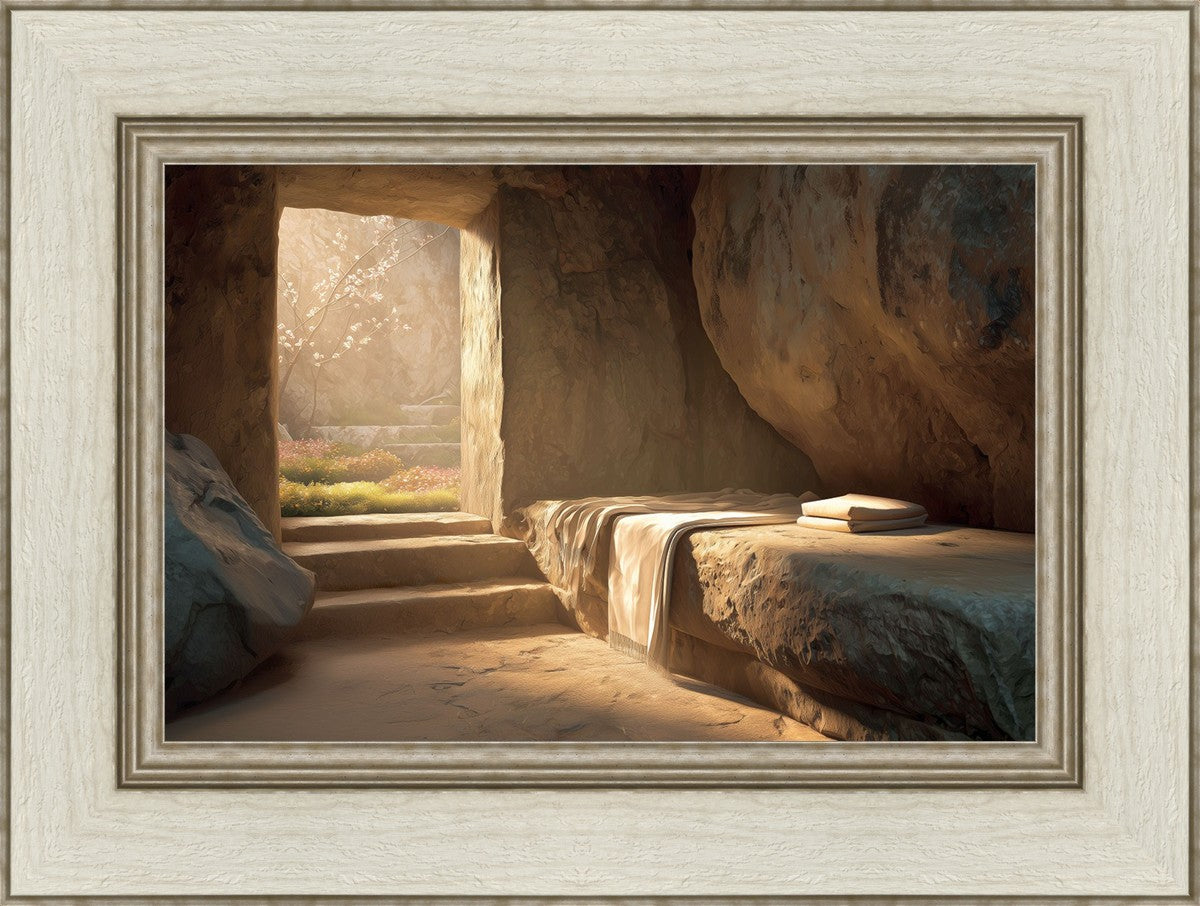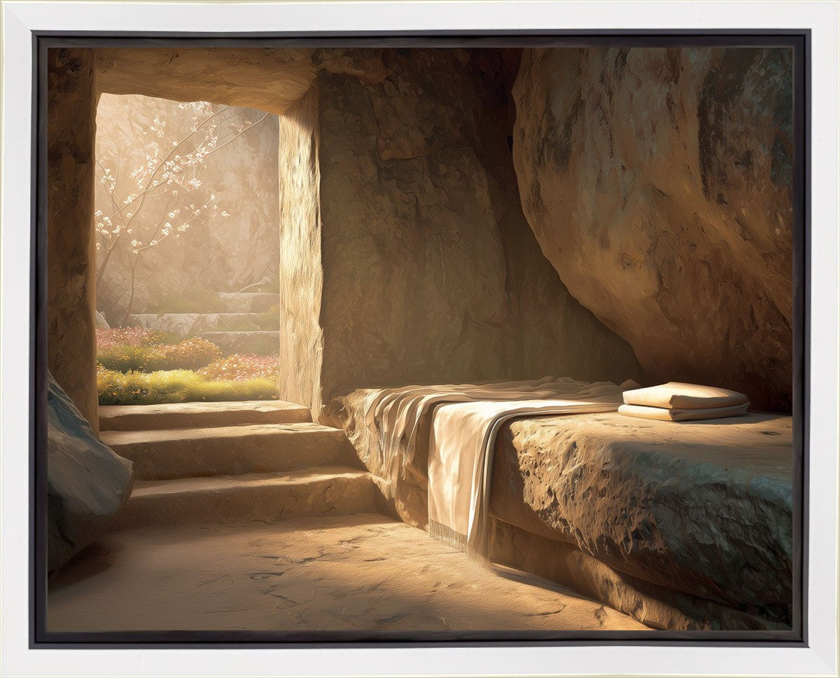 The empty tomb on Easter morning, with linens and folded cloth.