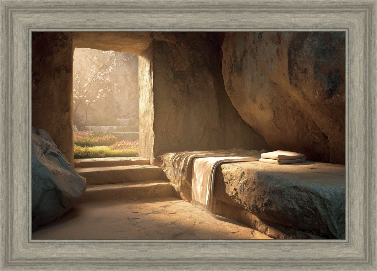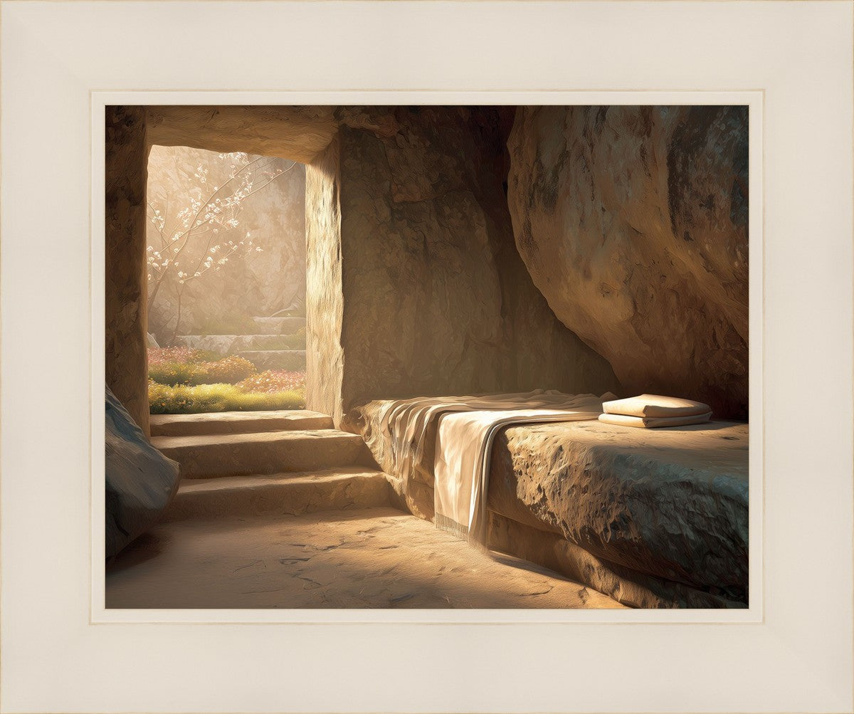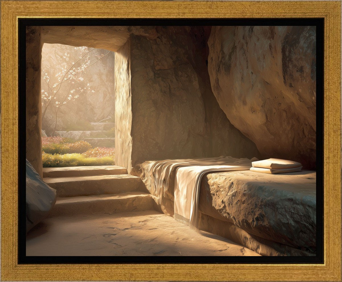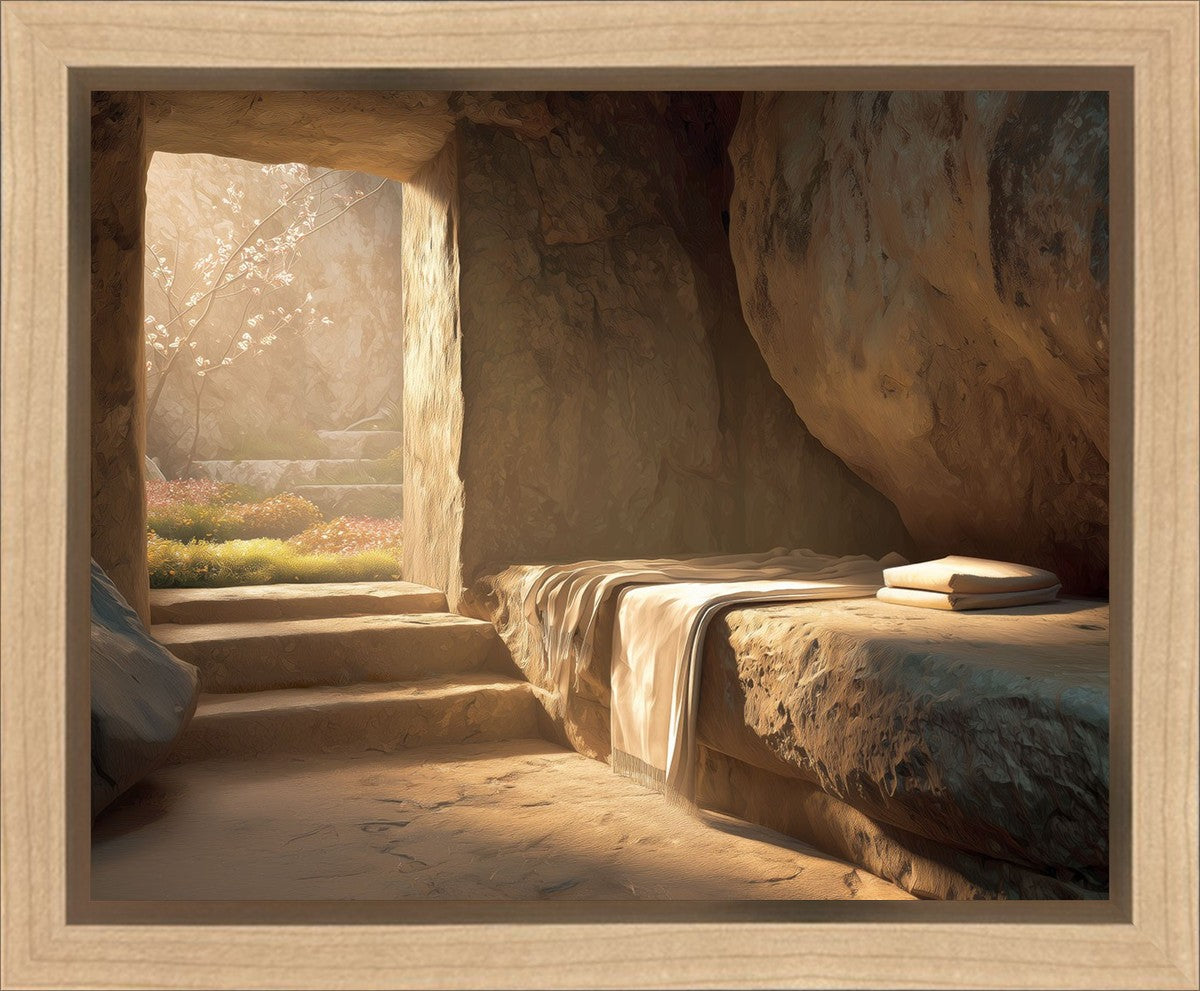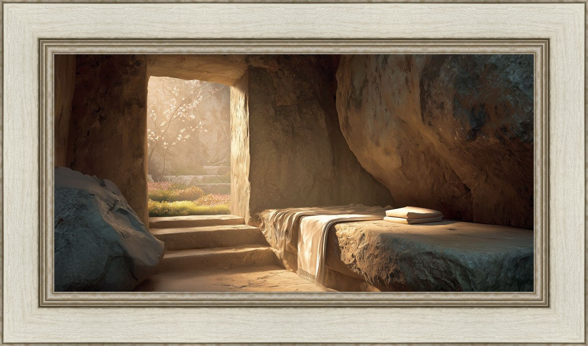 The empty tomb on Easter morning, with linens and folded cloth.