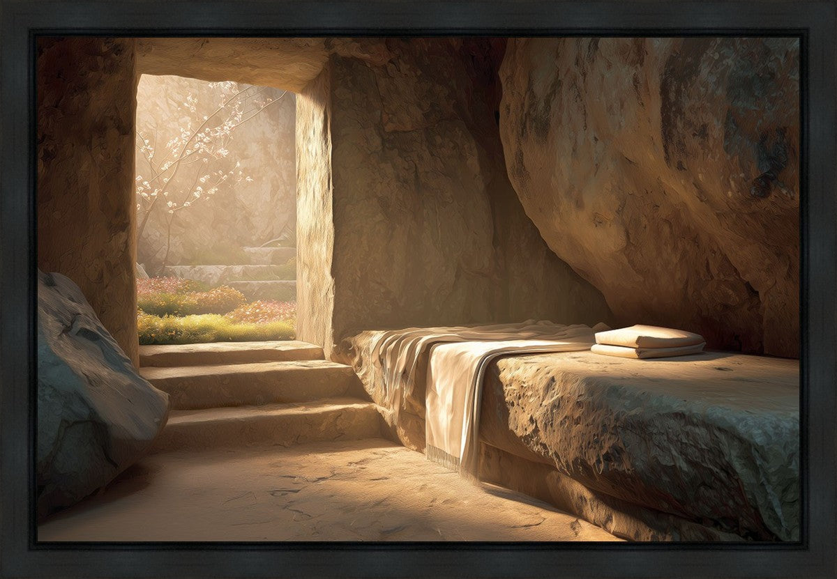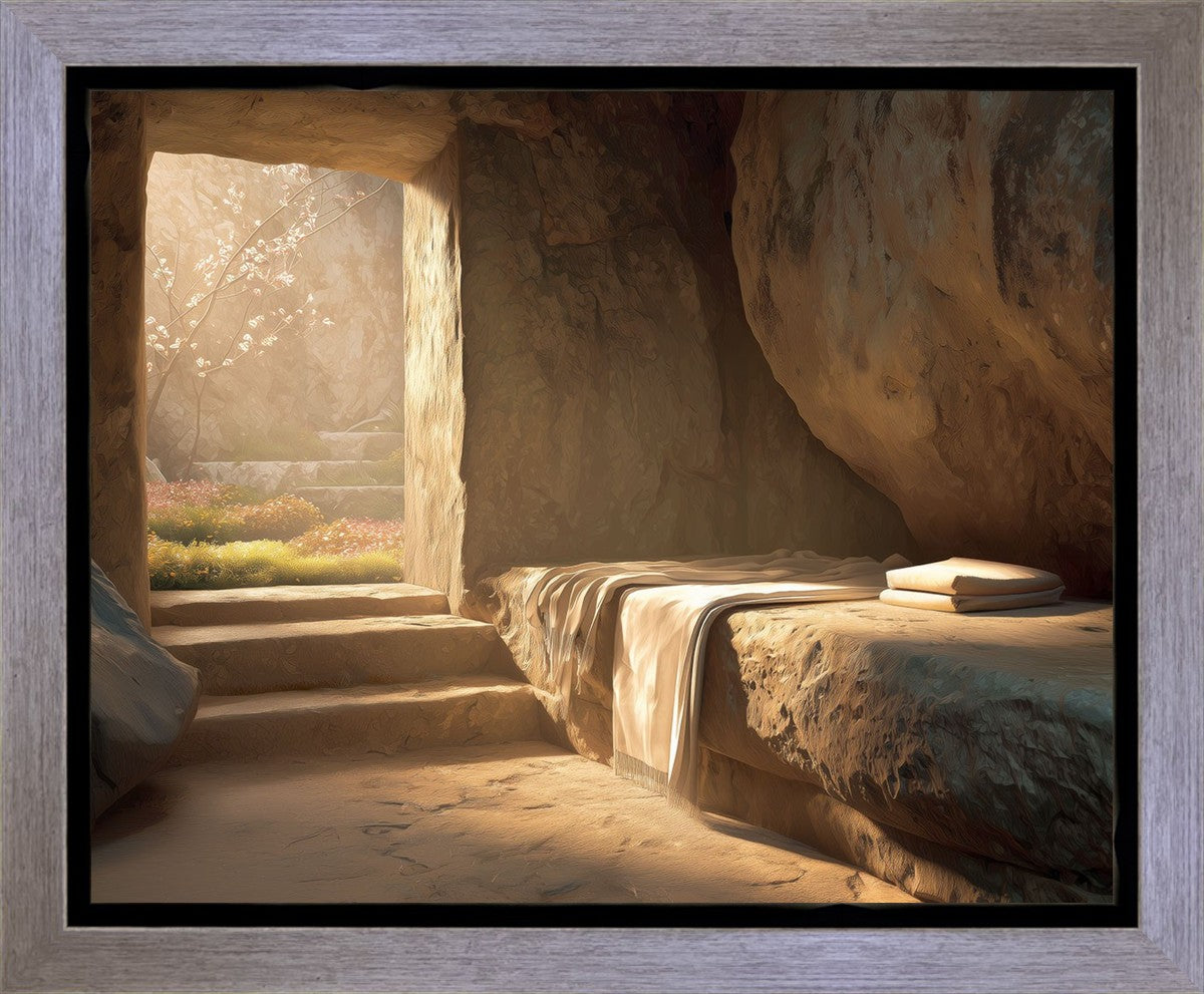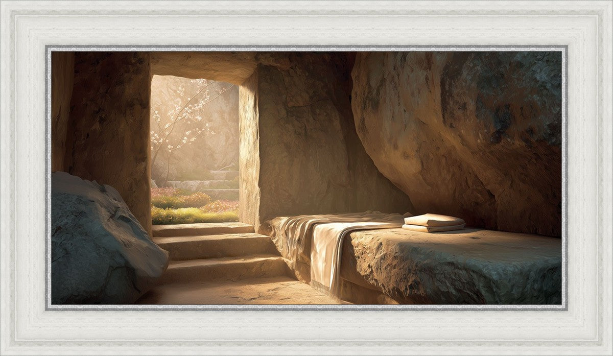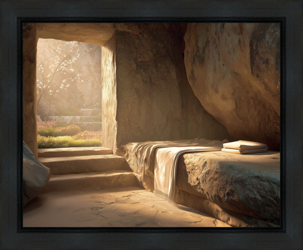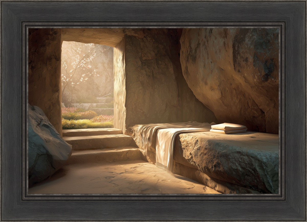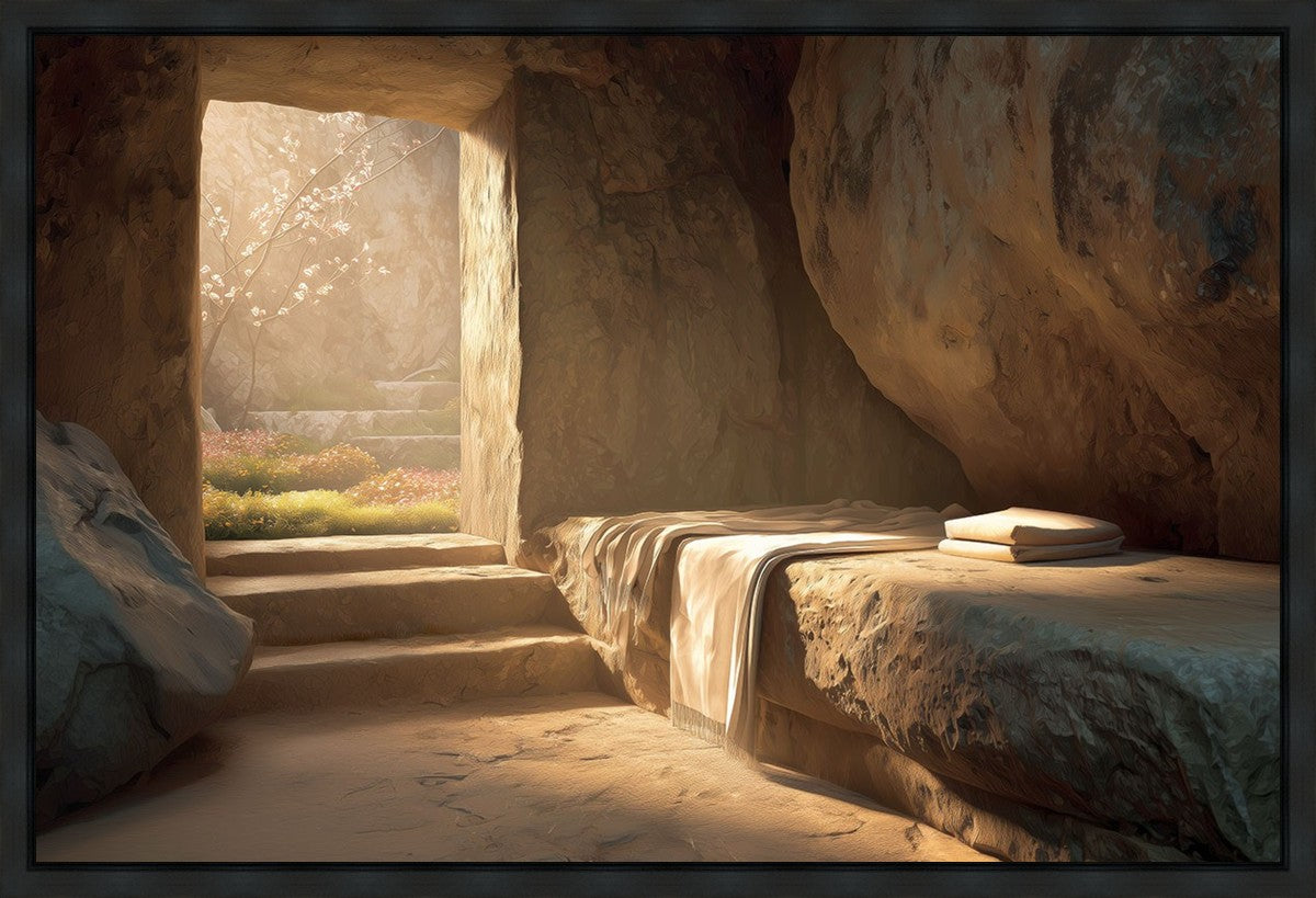 The empty tomb on Easter morning, with linens and folded cloth.