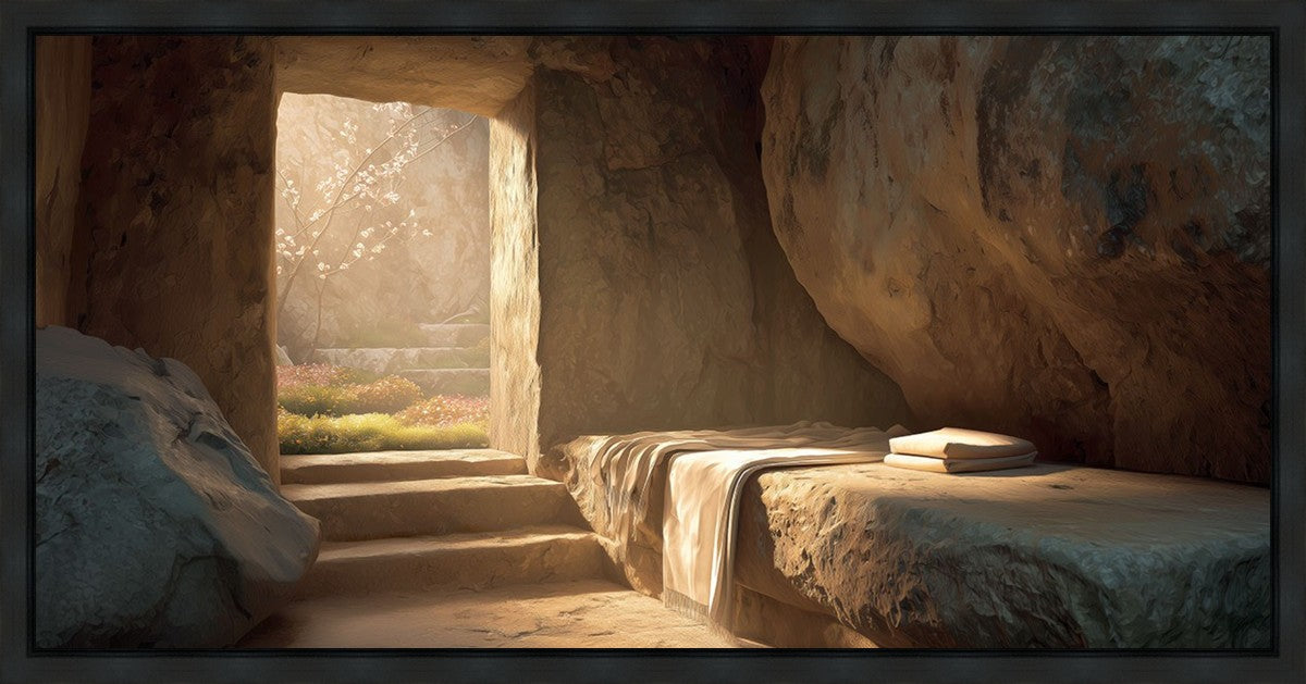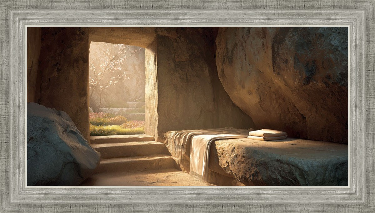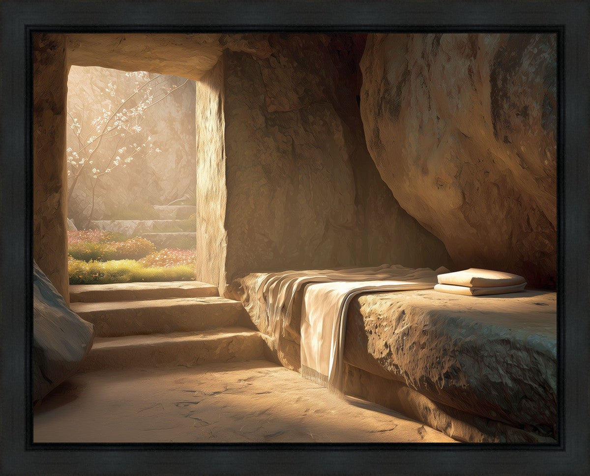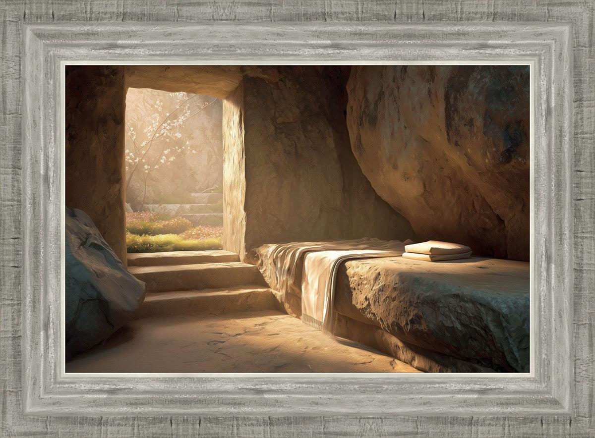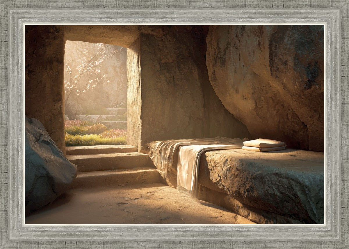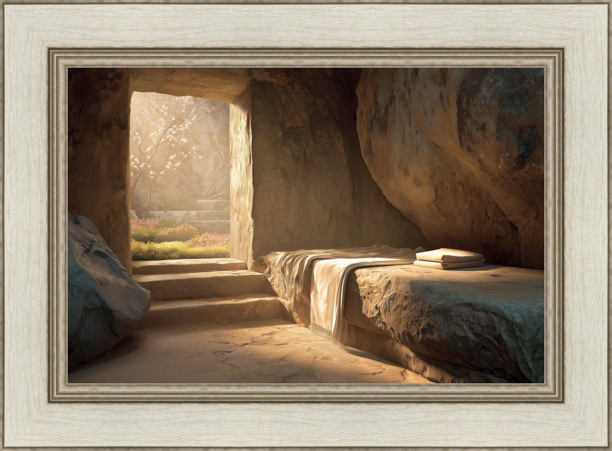 The empty tomb on Easter morning, with linens and folded cloth.