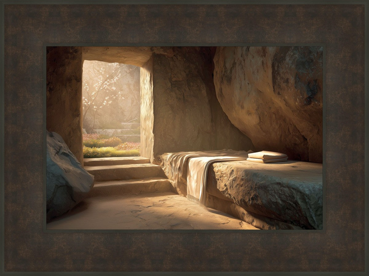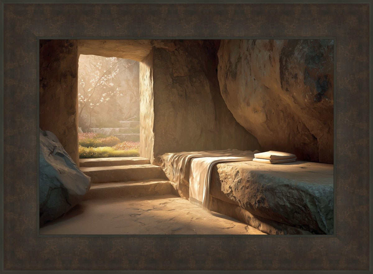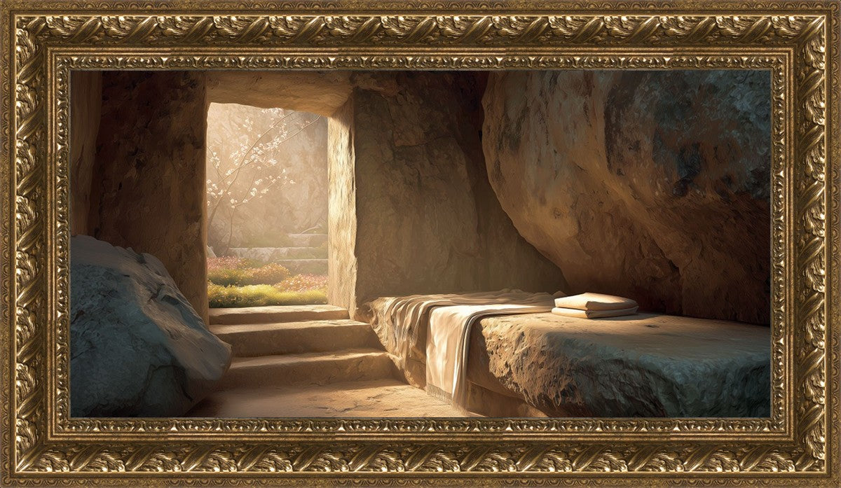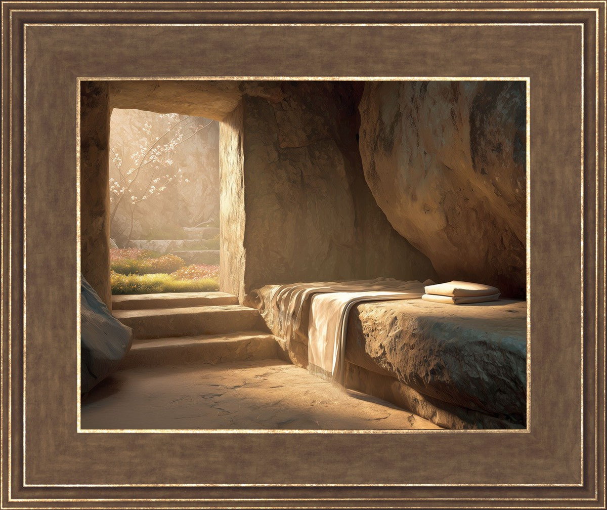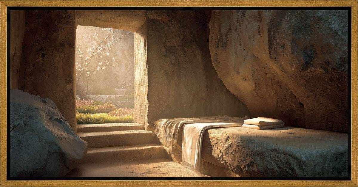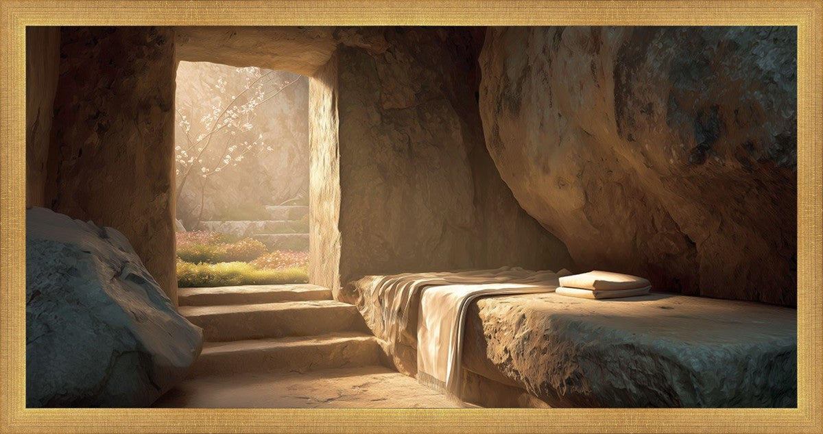 The empty tomb on Easter morning, with linens and folded cloth.