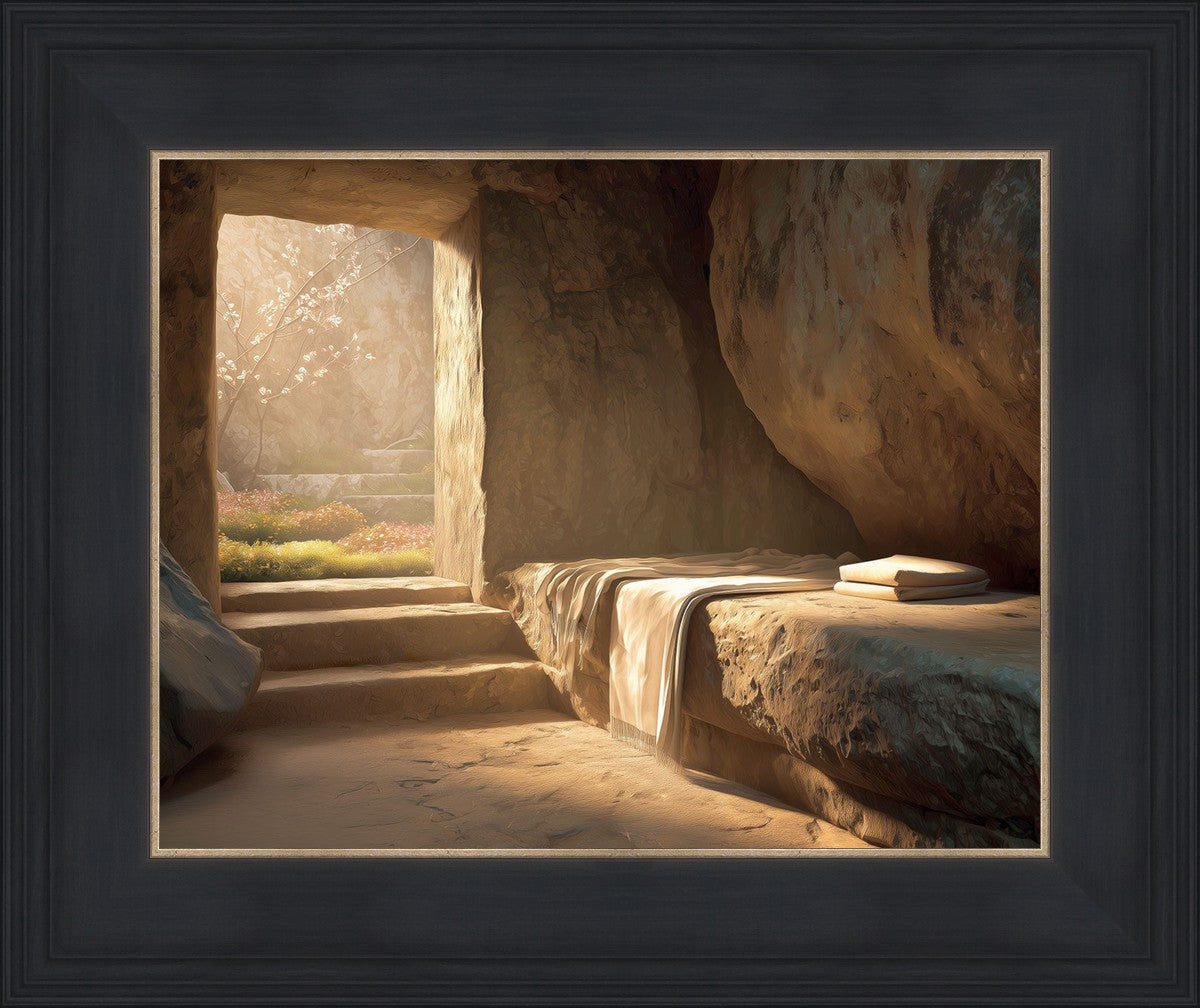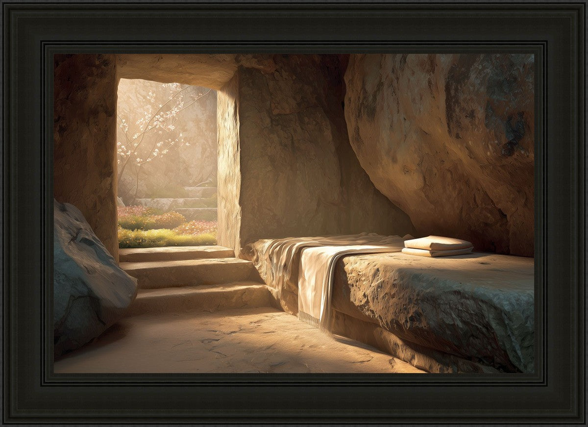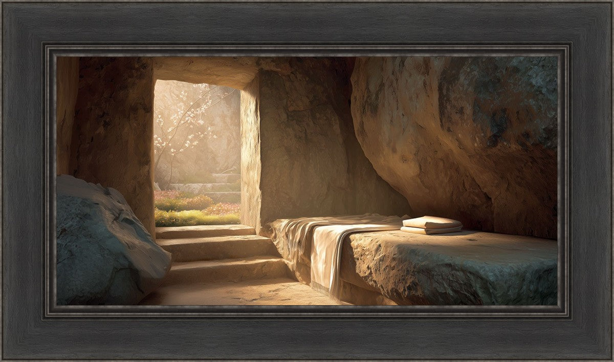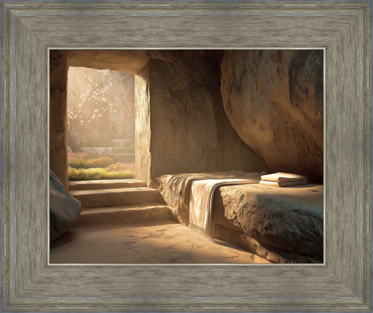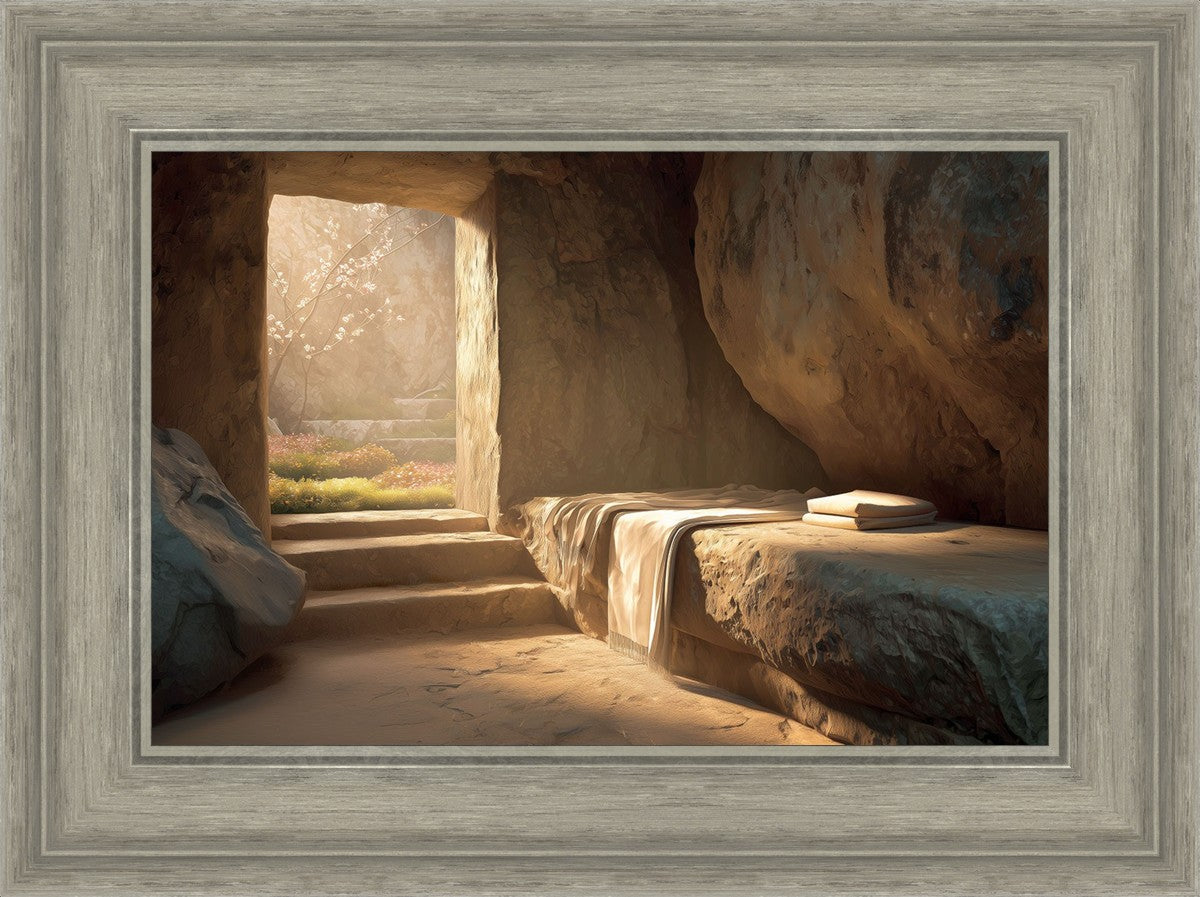 The empty tomb on Easter morning, with linens and folded cloth.