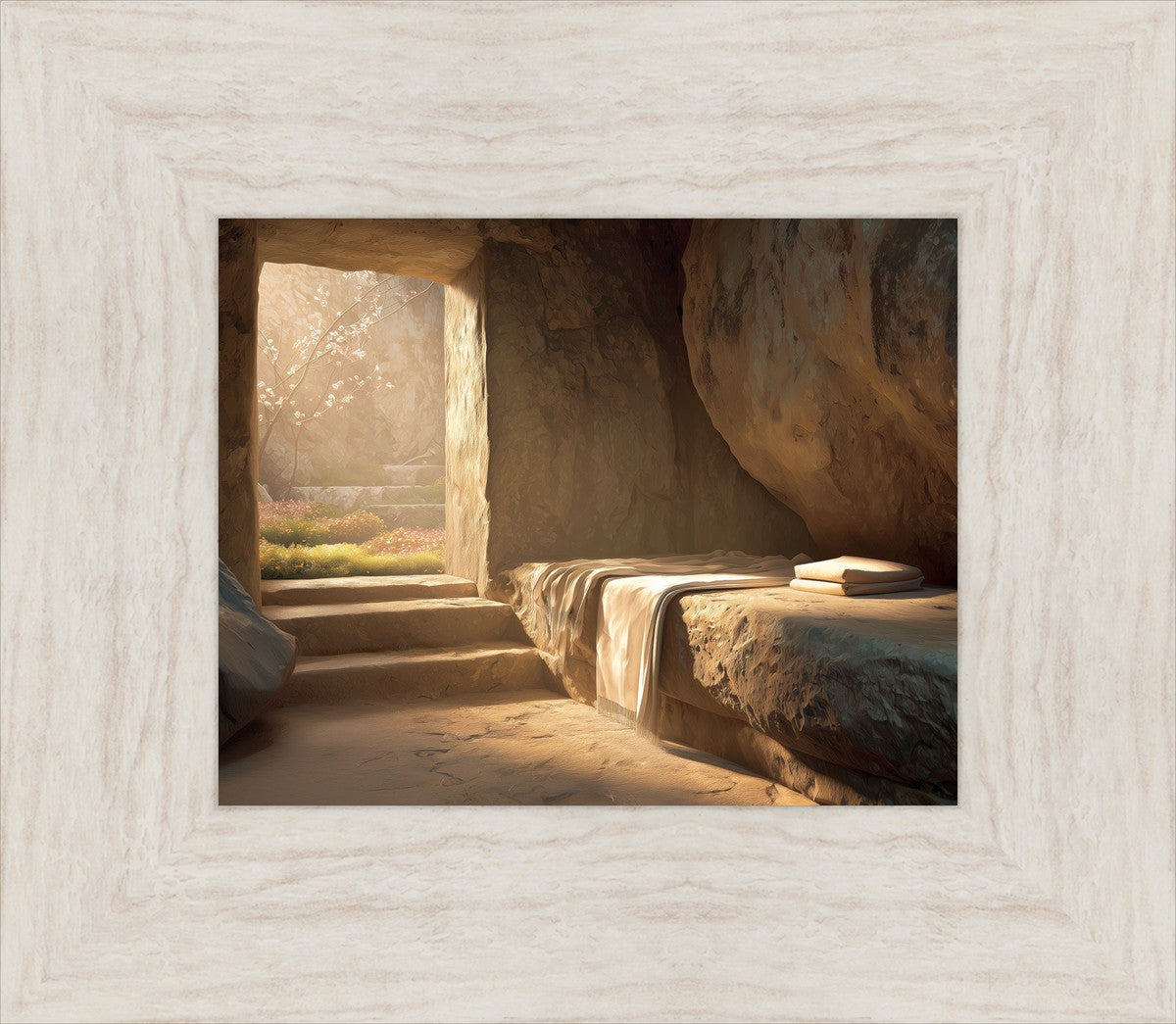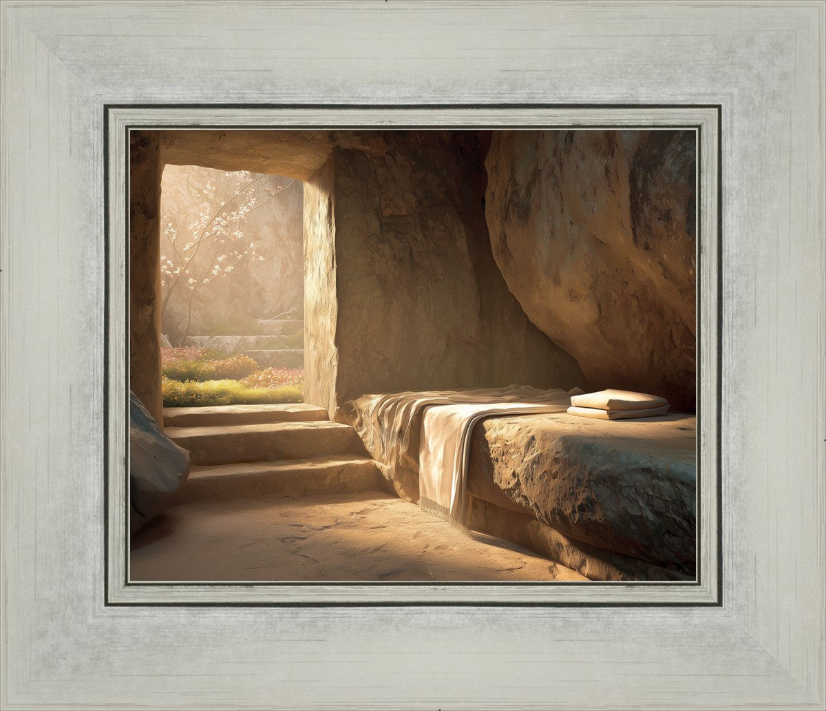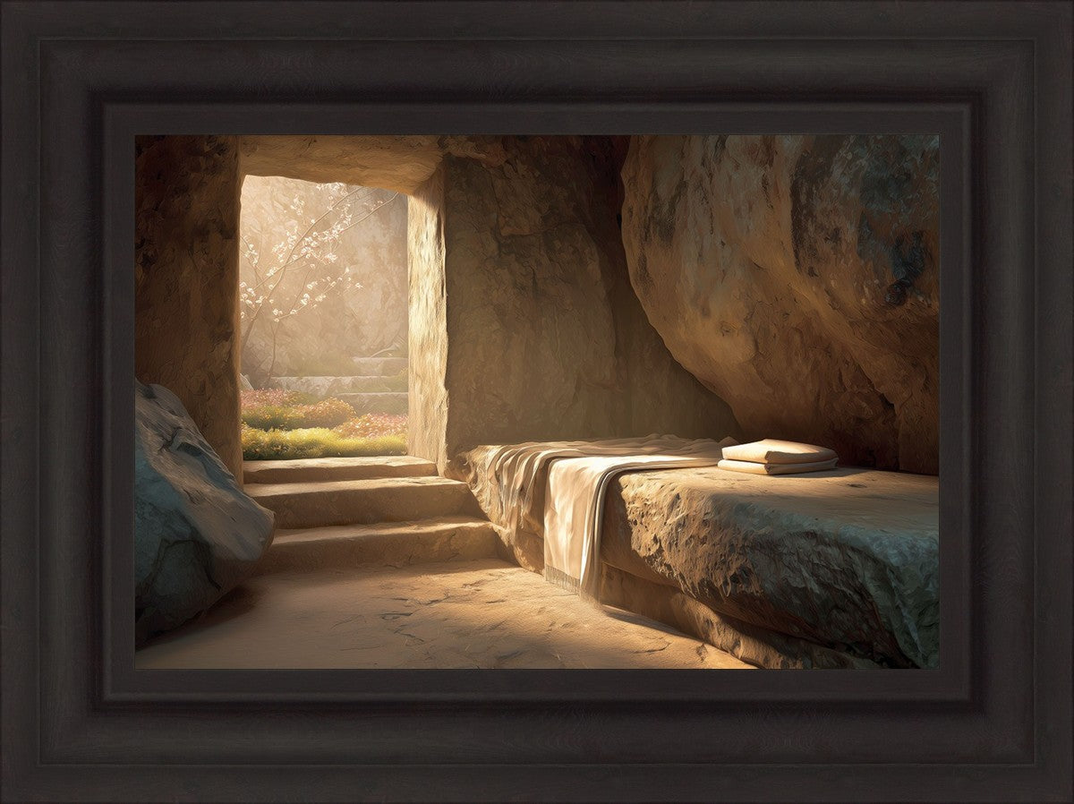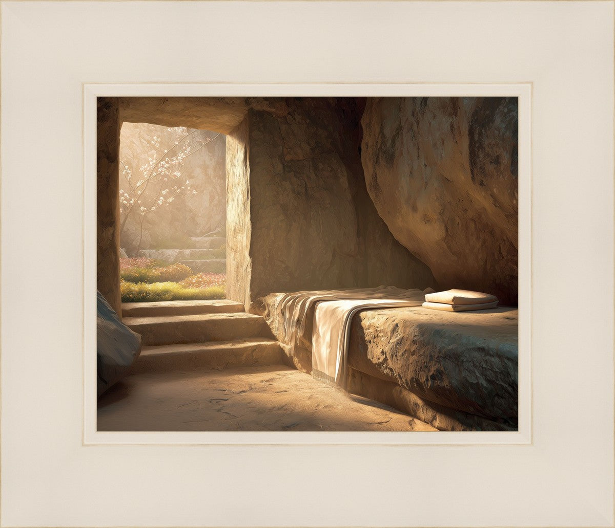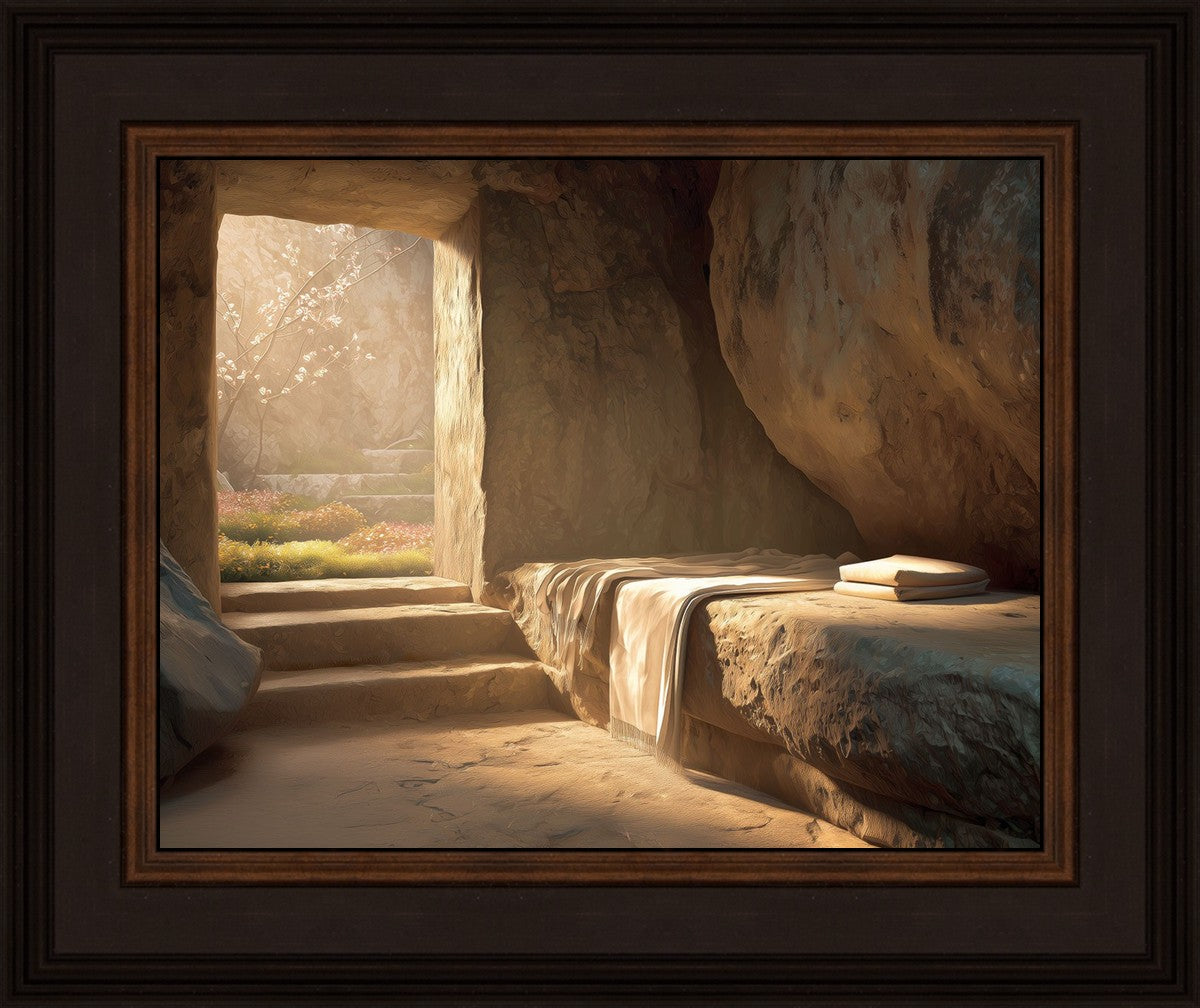 The empty tomb on Easter morning, with linens and folded cloth.