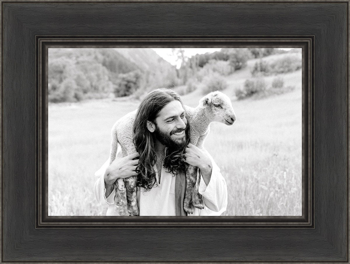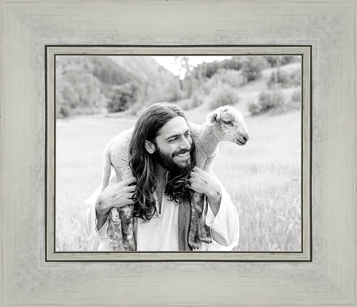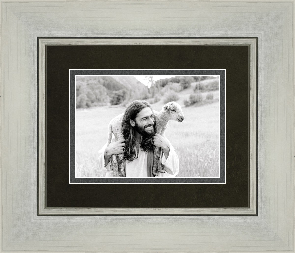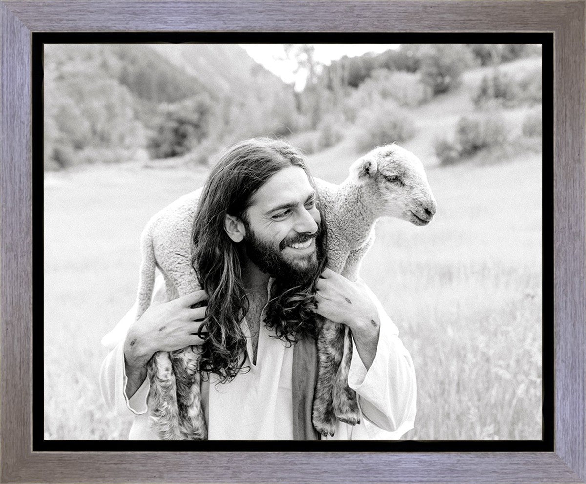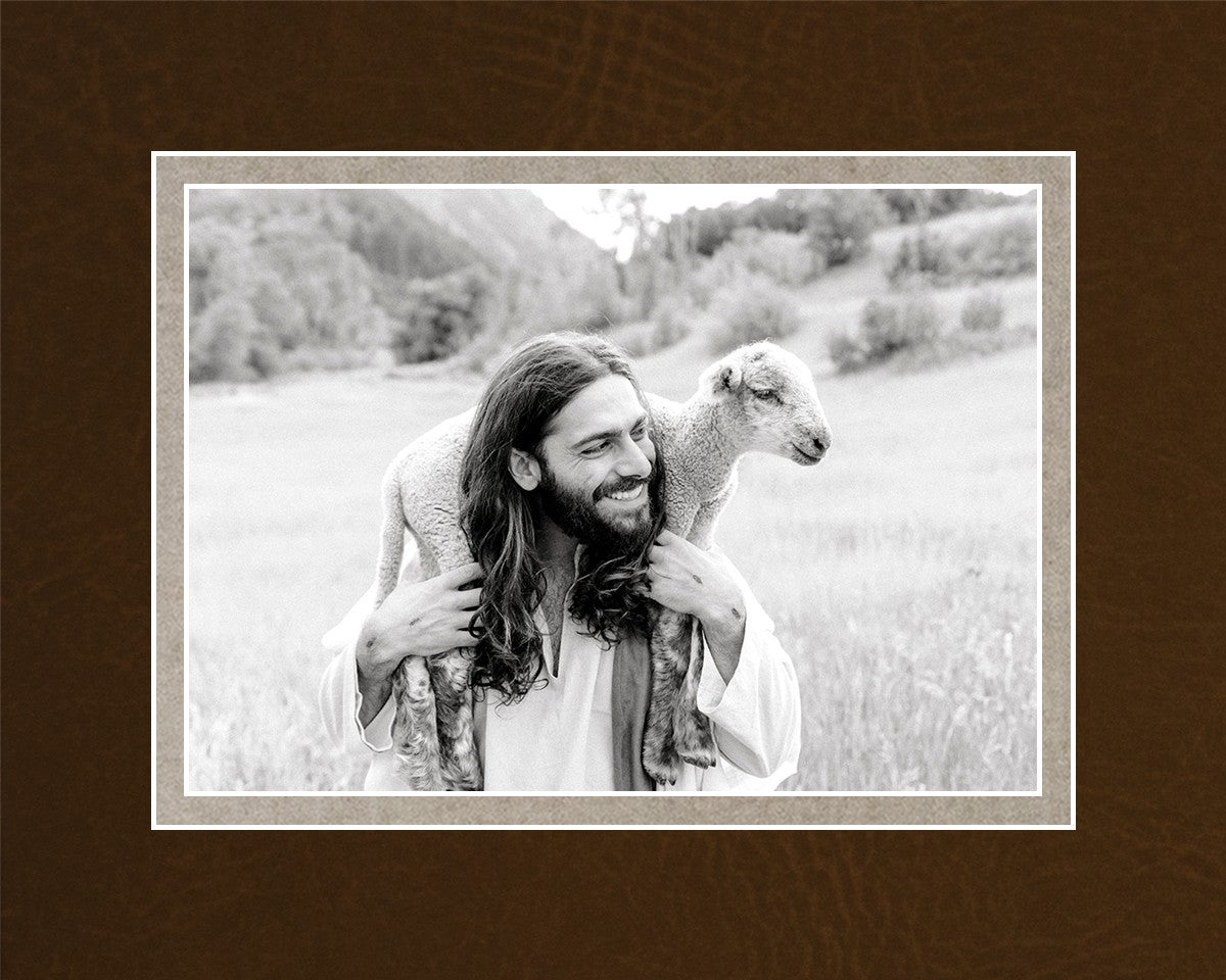 The Shepherd by Megan Owens features a black and white photograph of a resurrected Jesus Christ returning home with a lost lamb draped over his shoulder