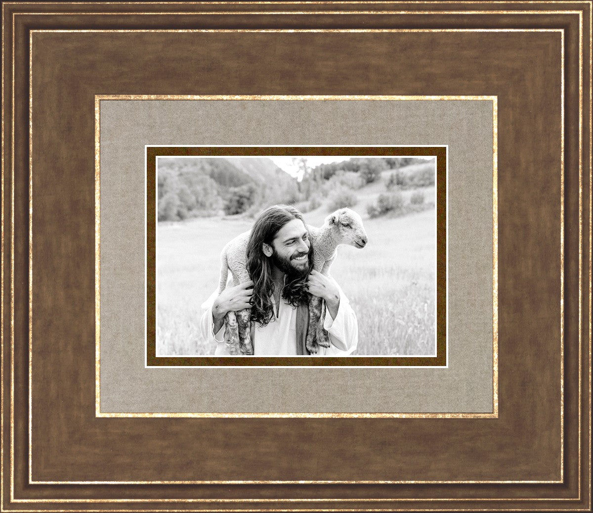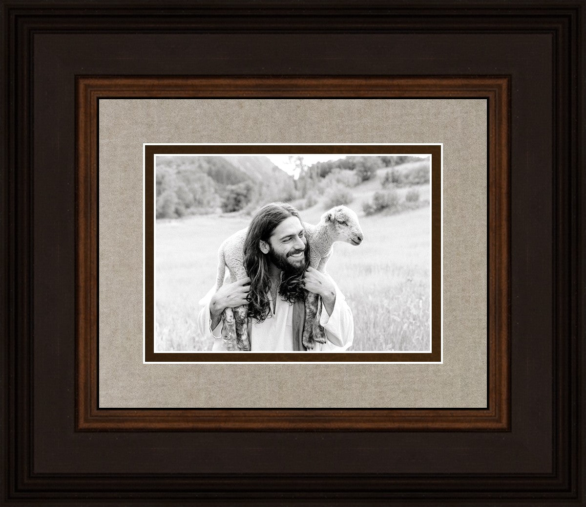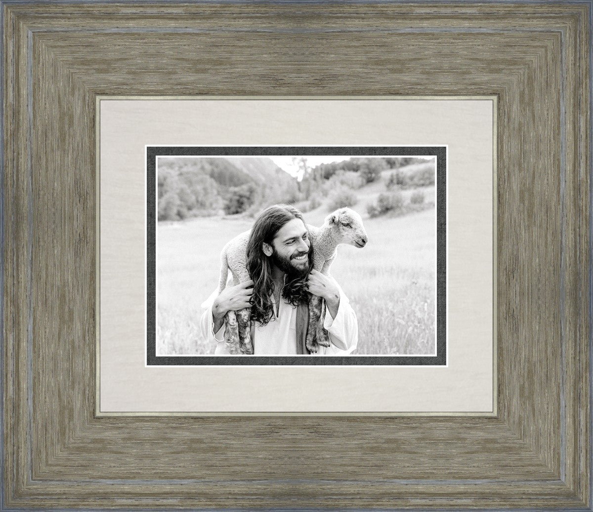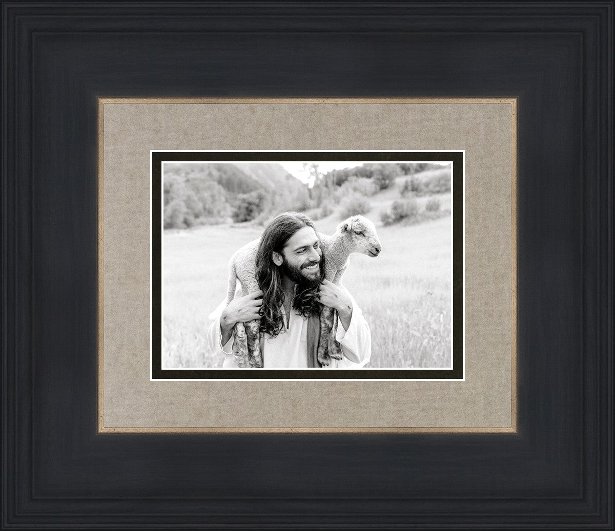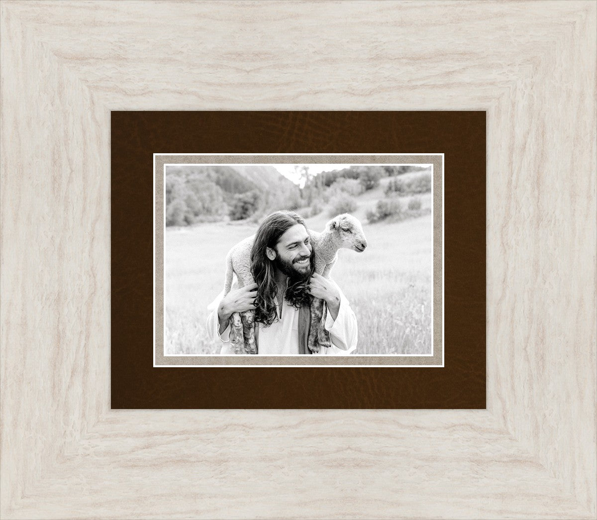 The Shepherd by Megan Owens features a black and white photograph of a resurrected Jesus Christ returning home with a lost lamb draped over his shoulder