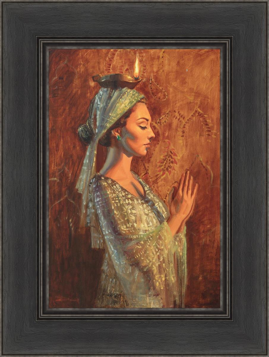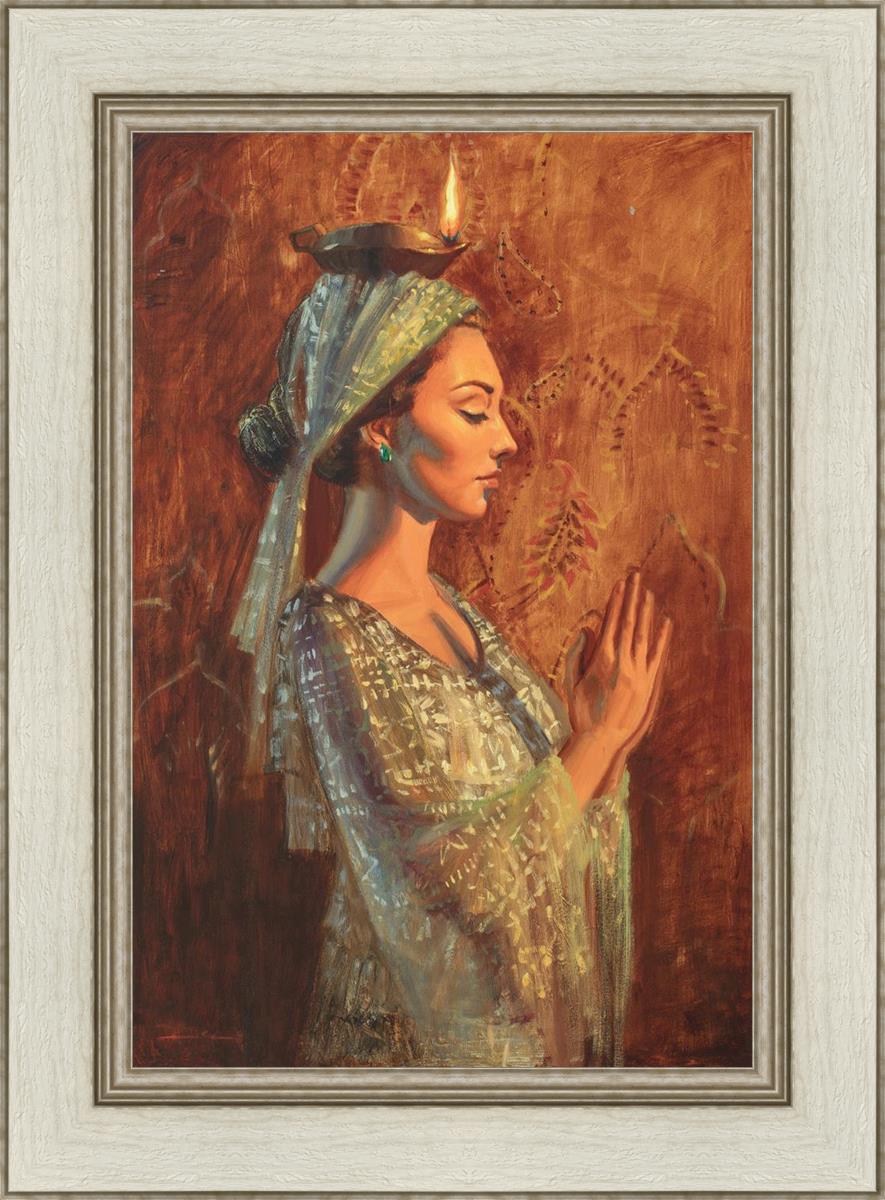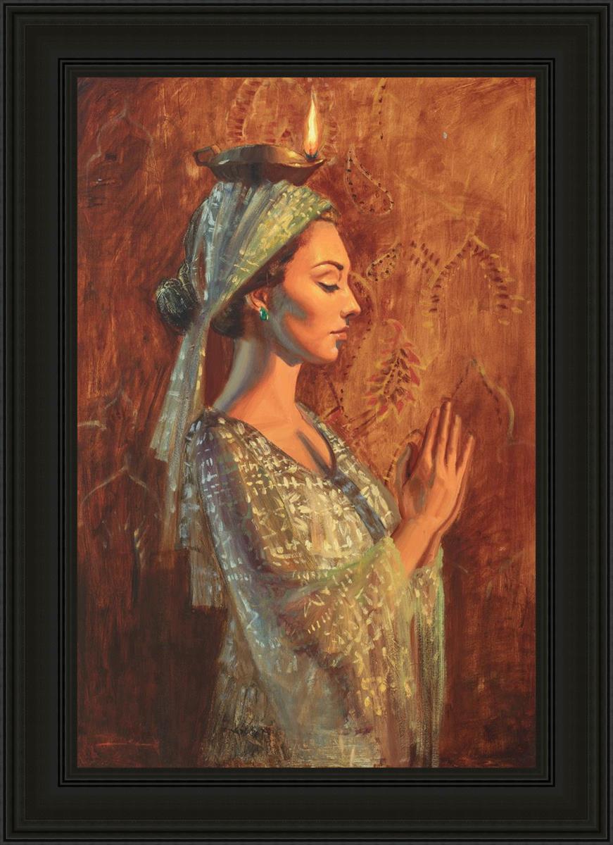 The scripture that inspired this set of paintings is found in Matt 25:2; “And five of them were wise, and five were foolish.” I think the parable of the bridegroom and the ten virgins is timeless. The clothes and styles of the virgins belong to no certain era because a parable can be applied to any era. The virgins have no certain geographic origin or race since the story pertains to all of Gods children. I am trying to convey the message that no matter who you are or where you are from, you can be found approaching Christ. Being wise or foolish is a choice we all make for ourselves. The wise virgins are shown in warm light symbolizing the warmth of Christs love. The foolish virgins are shown in cool light, demonstrating how cold life is without Christ in it. In the parable the bridegroom told the foolish virgins, "... I know you not” (verse 12). We must be wise and, “Watch therefore, for ye know neither the day nor the hour wherein the Son of man cometh" (verse 13).