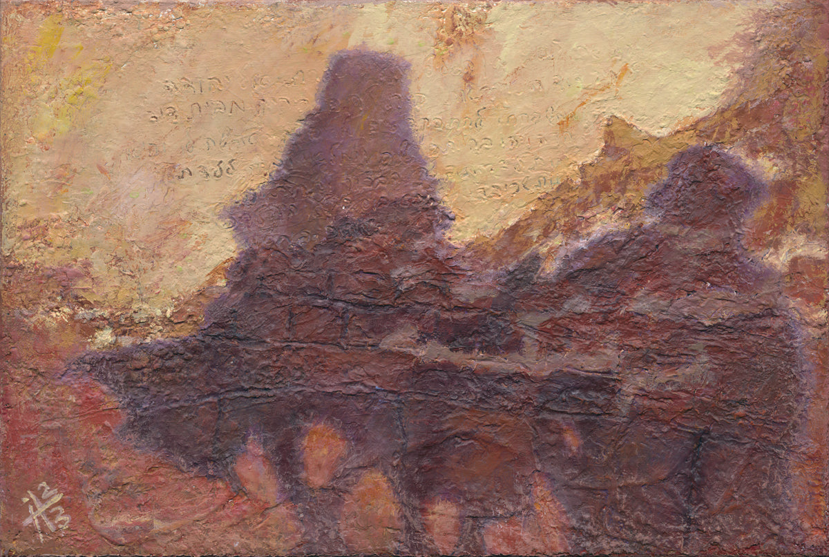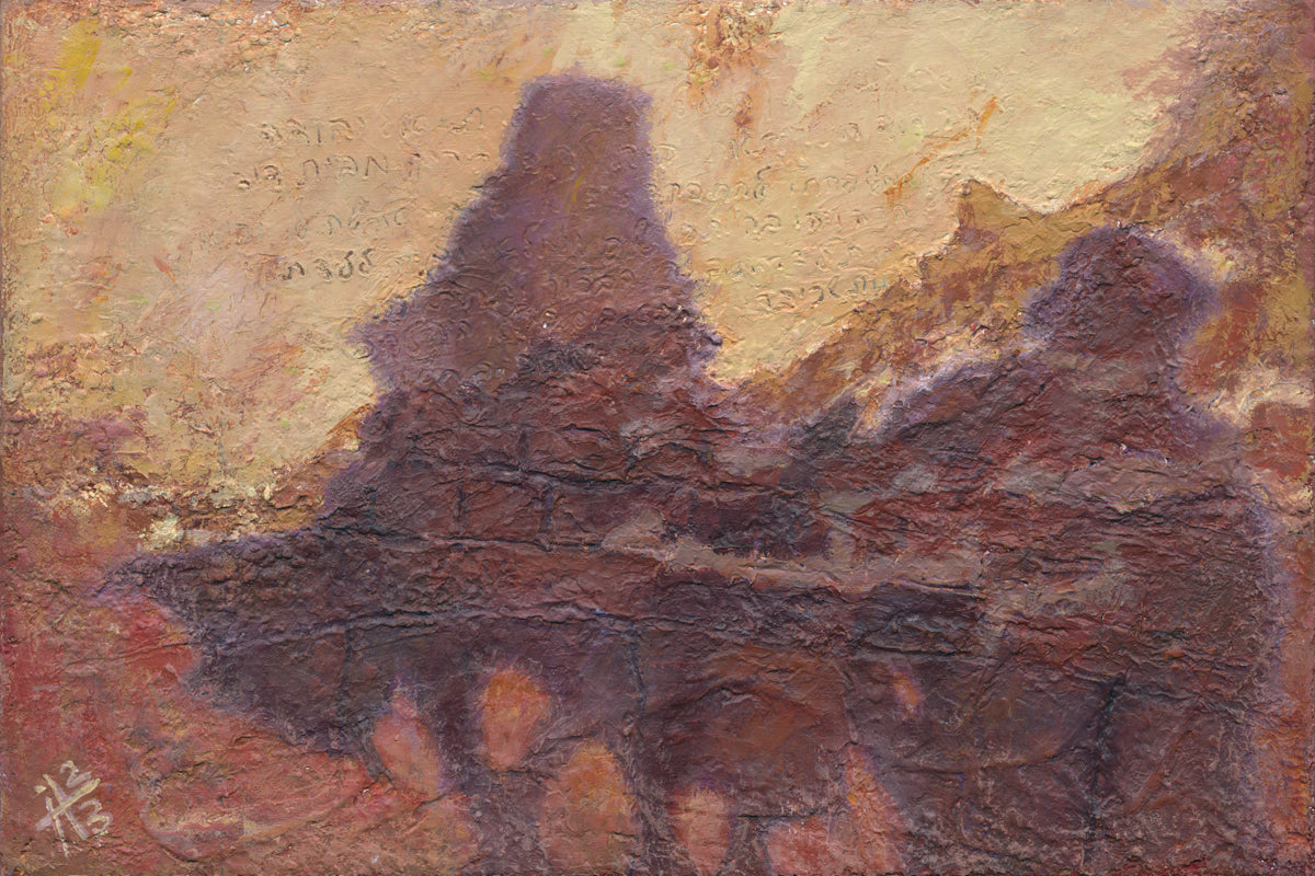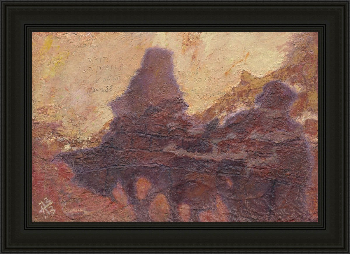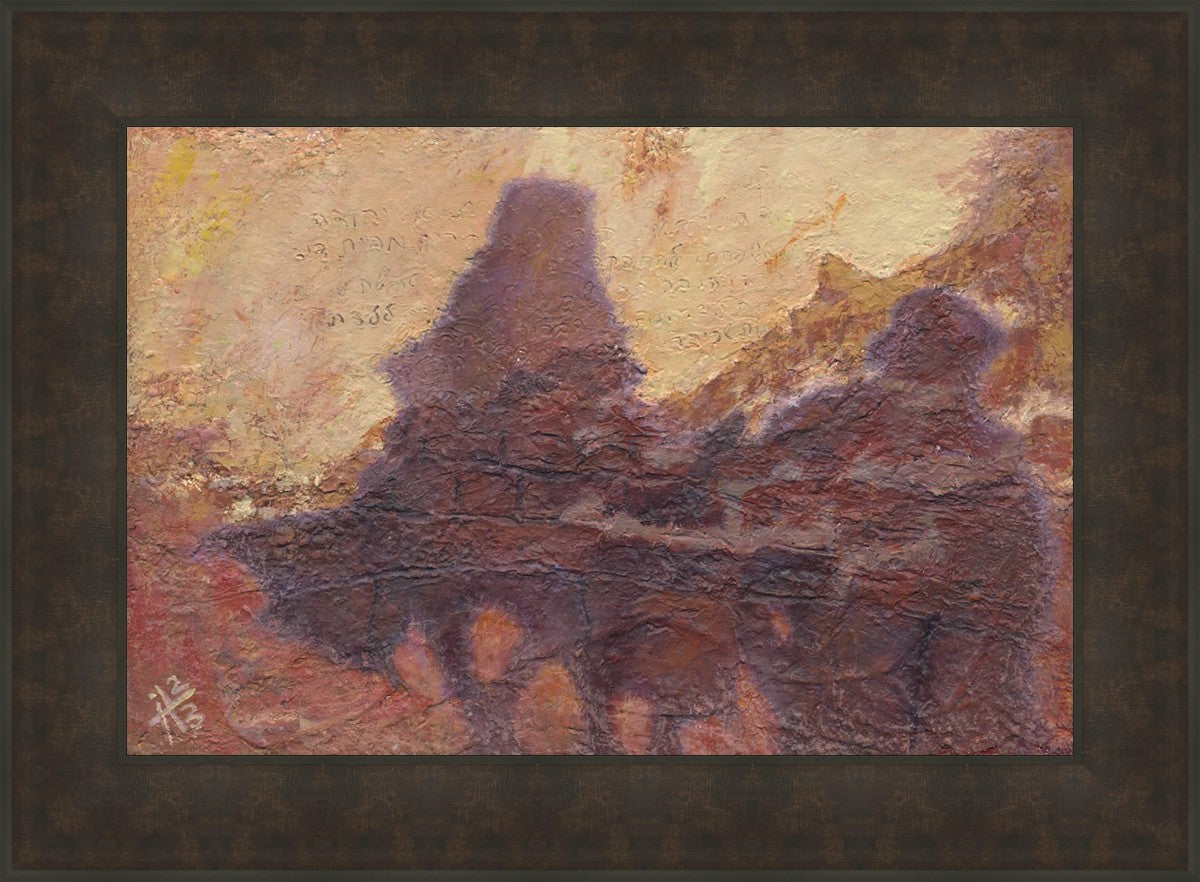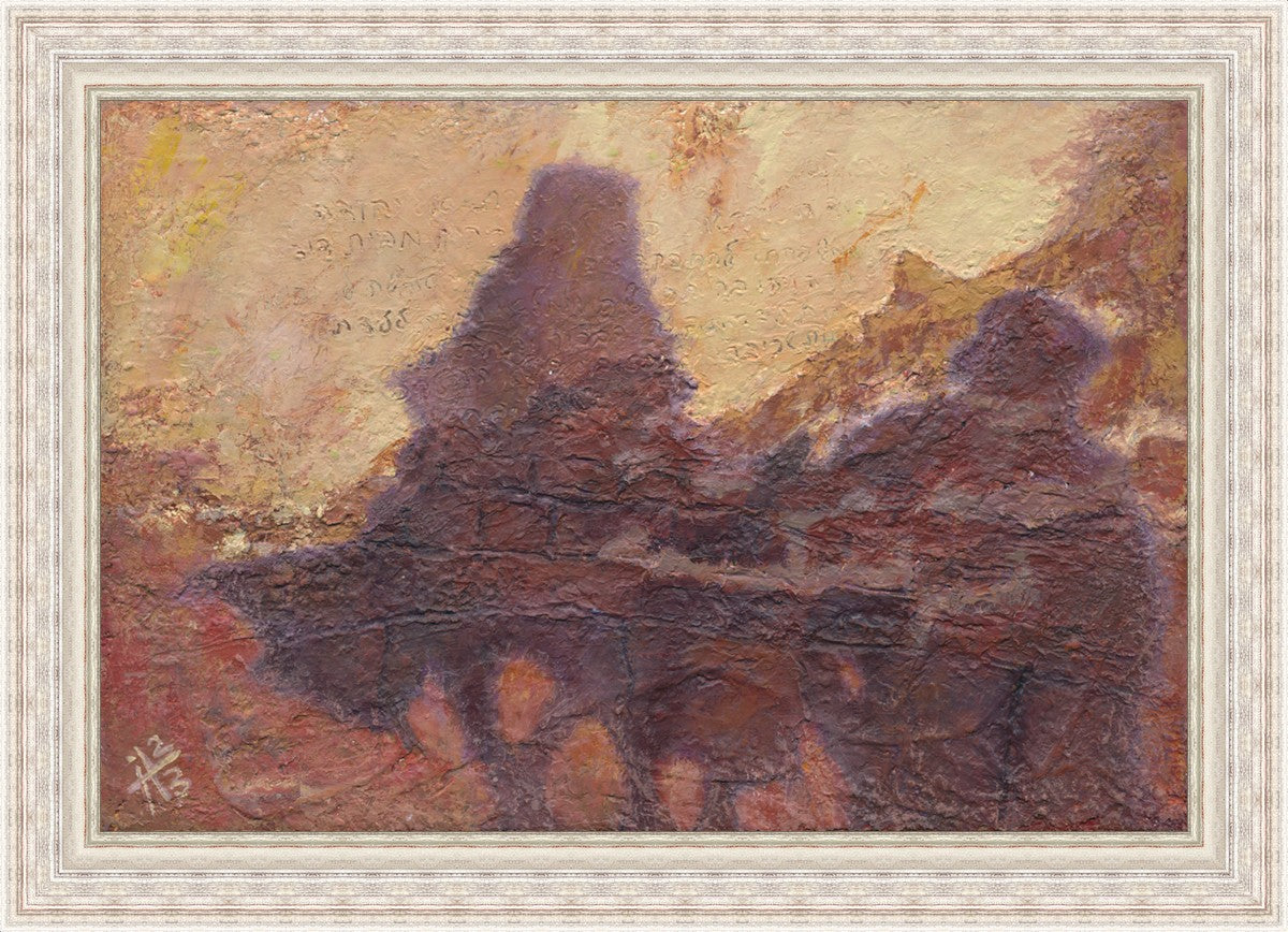 An image of Mary and Josephs shadows as they are walking through Bethlehem in their search for overnight lodging. There is an inscription upon wall in the background - the text from Luke 2:4-7 - "And Joseph also went up from Galilee, out of the city of Nazareth, into Judaea, unto the city of David, which is called Bethlehem; (because he was of the house and lineage of David:), to be taxed with Mary his espoused wife, being great with child. And so it was, that, while they were there, the days were accomplished that she should be delivered. And she brought forth her firstborn son, and wrapped him in swaddling clothes, and laid him in a manger; because there was no room for them in the inn".