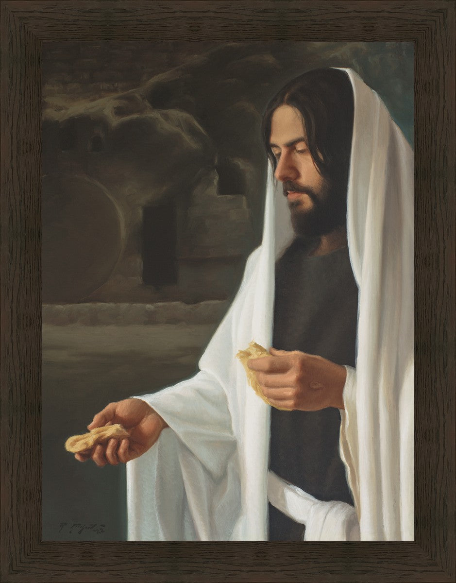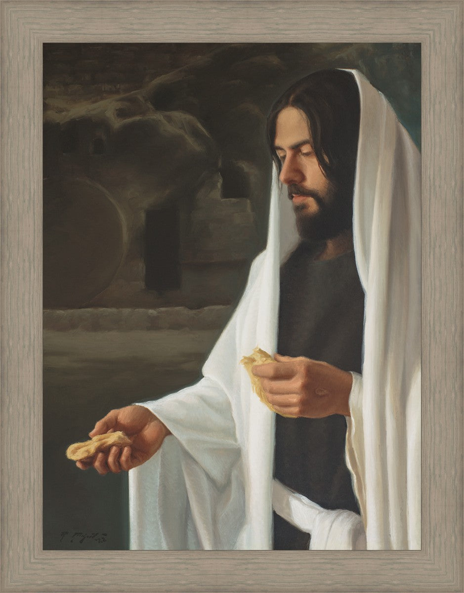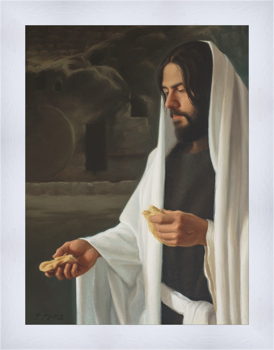This painting highlights a few aspects of that faith with symbolism. The symbolism of the open tomb in the background reminds the viewer of Jesus Christ’s victory over death. The visible nail prints in His hands reminds us that He is very acquainted with the suffering of this world and that He is still aware of us here. Those nail prints also remind us of the steep cost demanded of Jesus Christ in order for Him to be awarded power over illness and death. His white robes remind us of His perfect and sinless nature. And lastly, the symbolism of Christ being the one offering the broken bread is meant to remind the viewer that He is the one offering these great blessings to us.