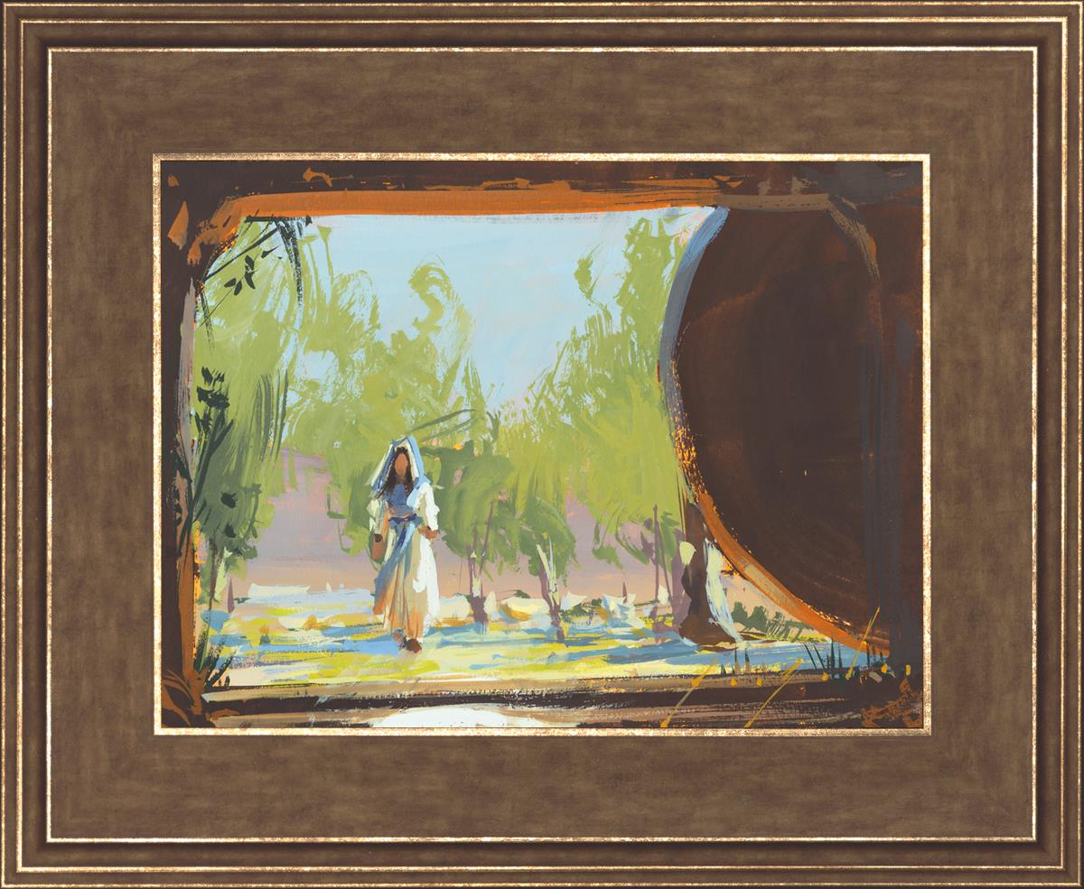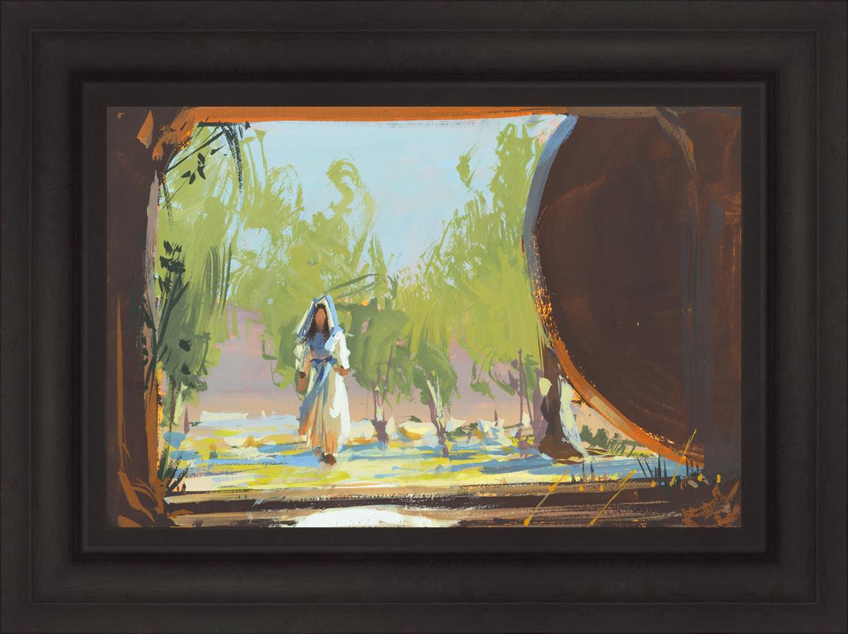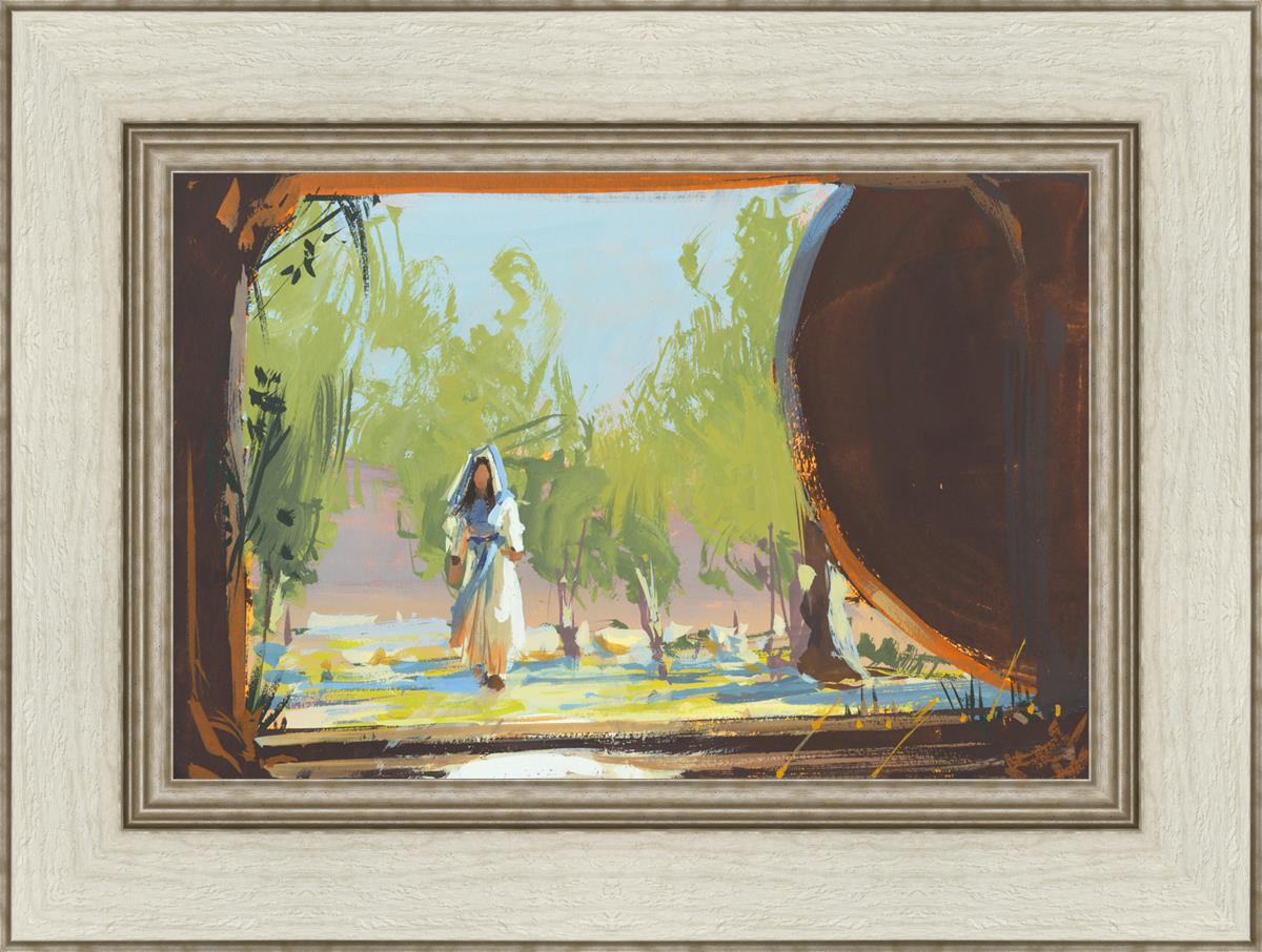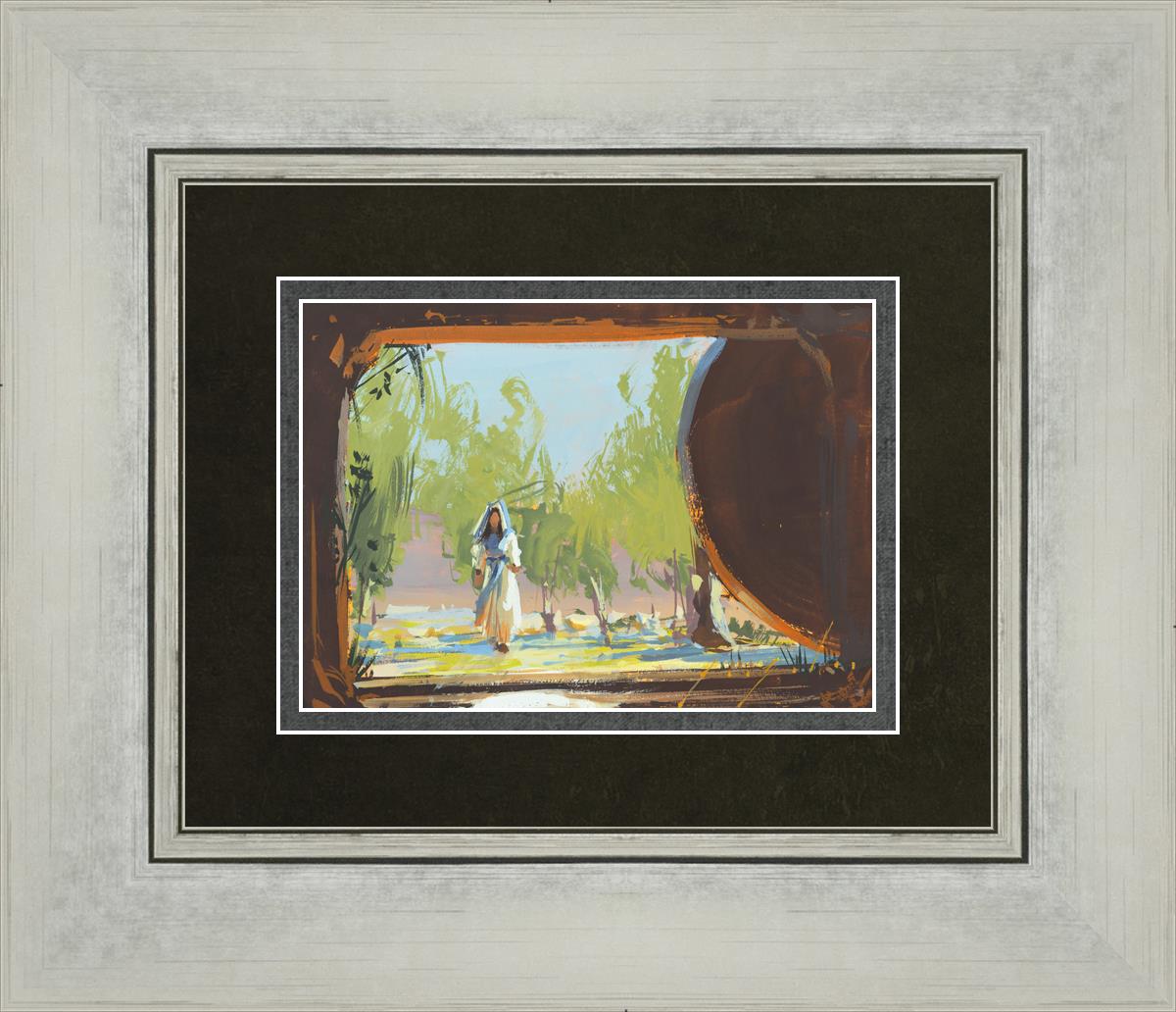 This is when Mary Magdalene approached the empty tomb where Christ was buried and where she found his body not there. This is moments before she knew that. She sees the stone rolled away and perhaps is starting to feel some anxiety that something is wrong. This story is so beautiful. As far as we know, she was the first to see the risen Lord.