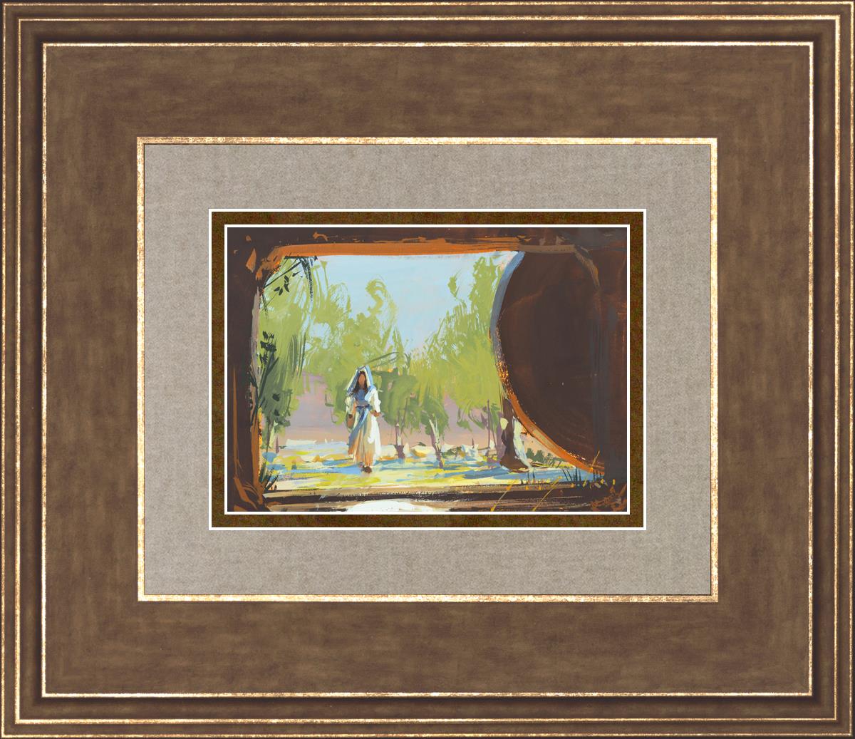 We are viewing from the tomb out to the world where a woman in a cream and blue dress is approaching. The tomb is empty and a round stone is on the right side of the frame. Everything in the tomb is dark and silhouetted. There are stairs leading up from the tomb. It is a bright spring morning with trees behind the woman.