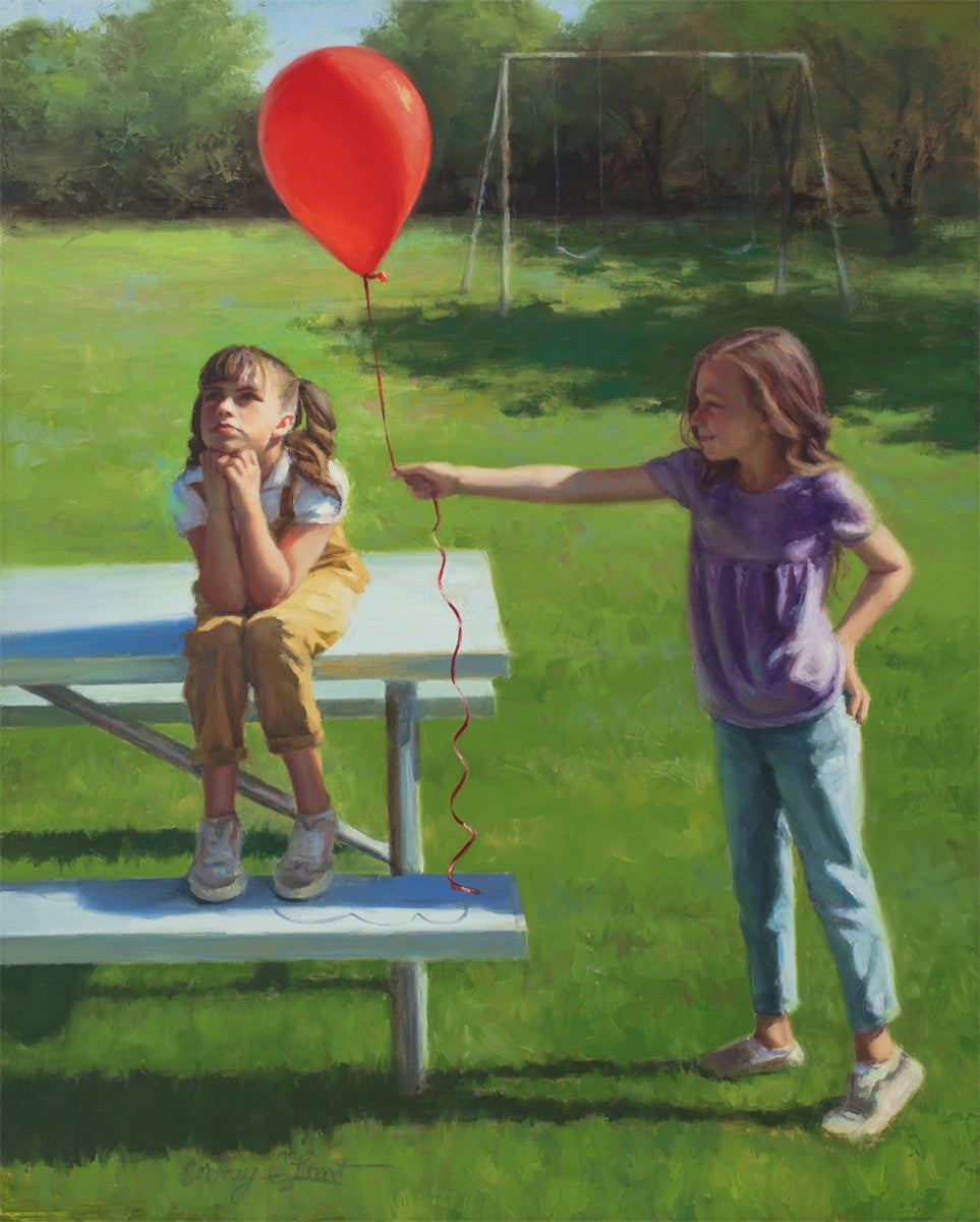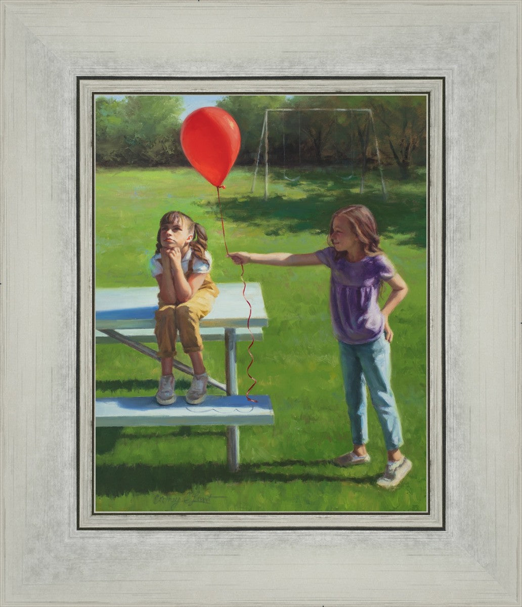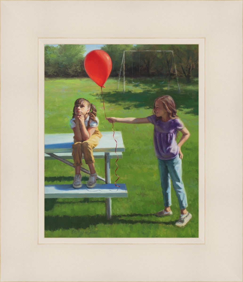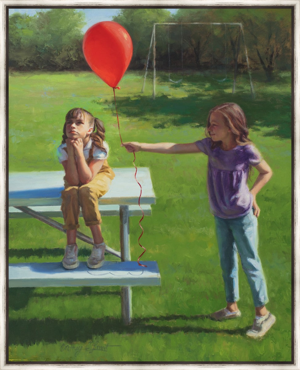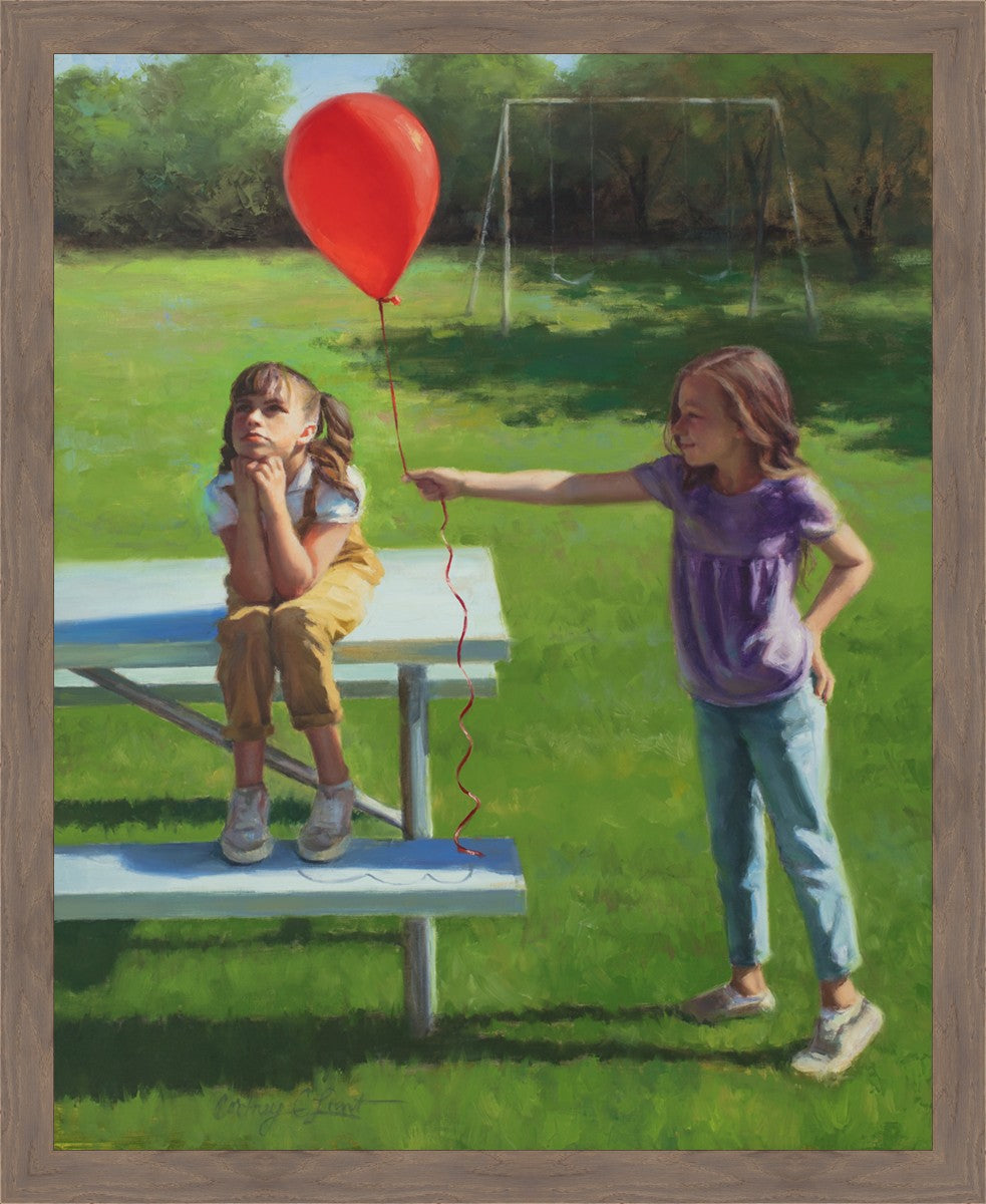I had been trying to think of a way that I could do a painting that represents kindness. One day I was at a park with my family, and we noticed a little scene that was my inspiration I had been looking for. There was a little girl who had lost her helium balloon and was quite upset by it. Then we noticed her sister give up her very own balloon by handing it to her to help her feel better. It was so sweet! My daughter leaned over to me and told me I should paint that story, and I agreed. It’s a perfect example of true kindness.