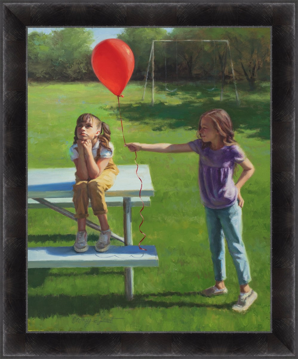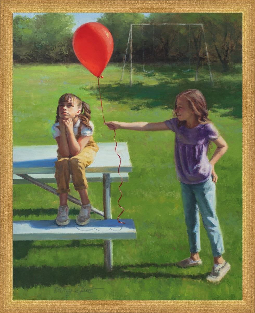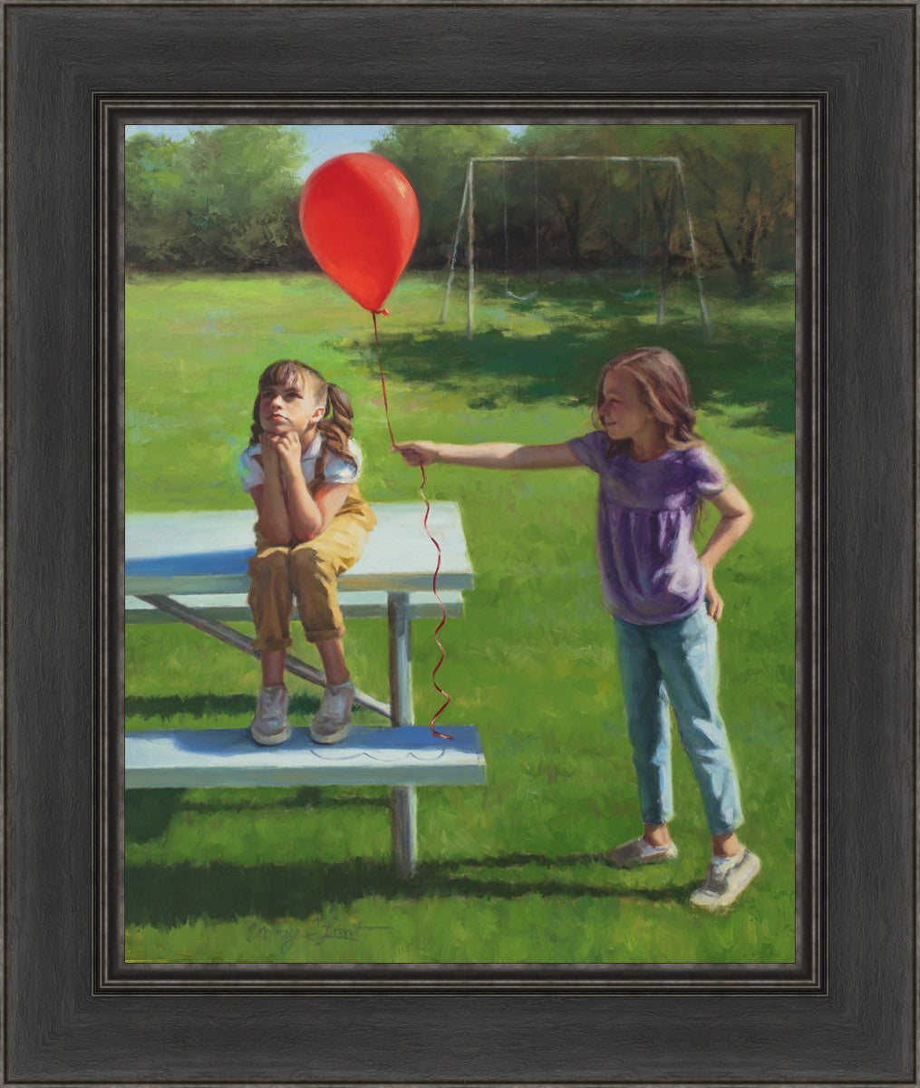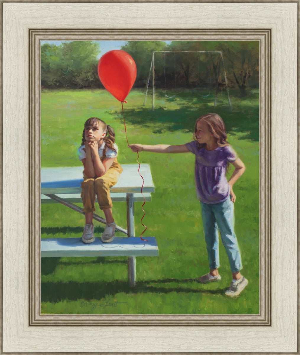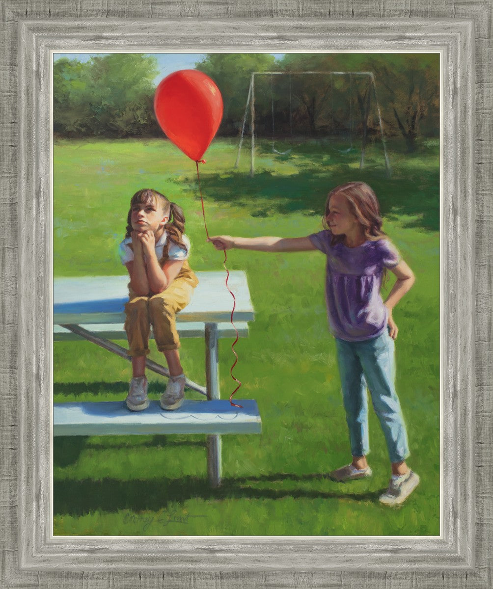 I had been trying to think of a way that I could do a painting that represents kindness. One day I was at a park with my family, and we noticed a little scene that was my inspiration I had been looking for. There was a little girl who had lost her helium balloon and was quite upset by it. Then we noticed her sister give up her very own balloon by handing it to her to help her feel better. It was so sweet! My daughter leaned over to me and told me I should paint that story, and I agreed. It’s a perfect example of true kindness.