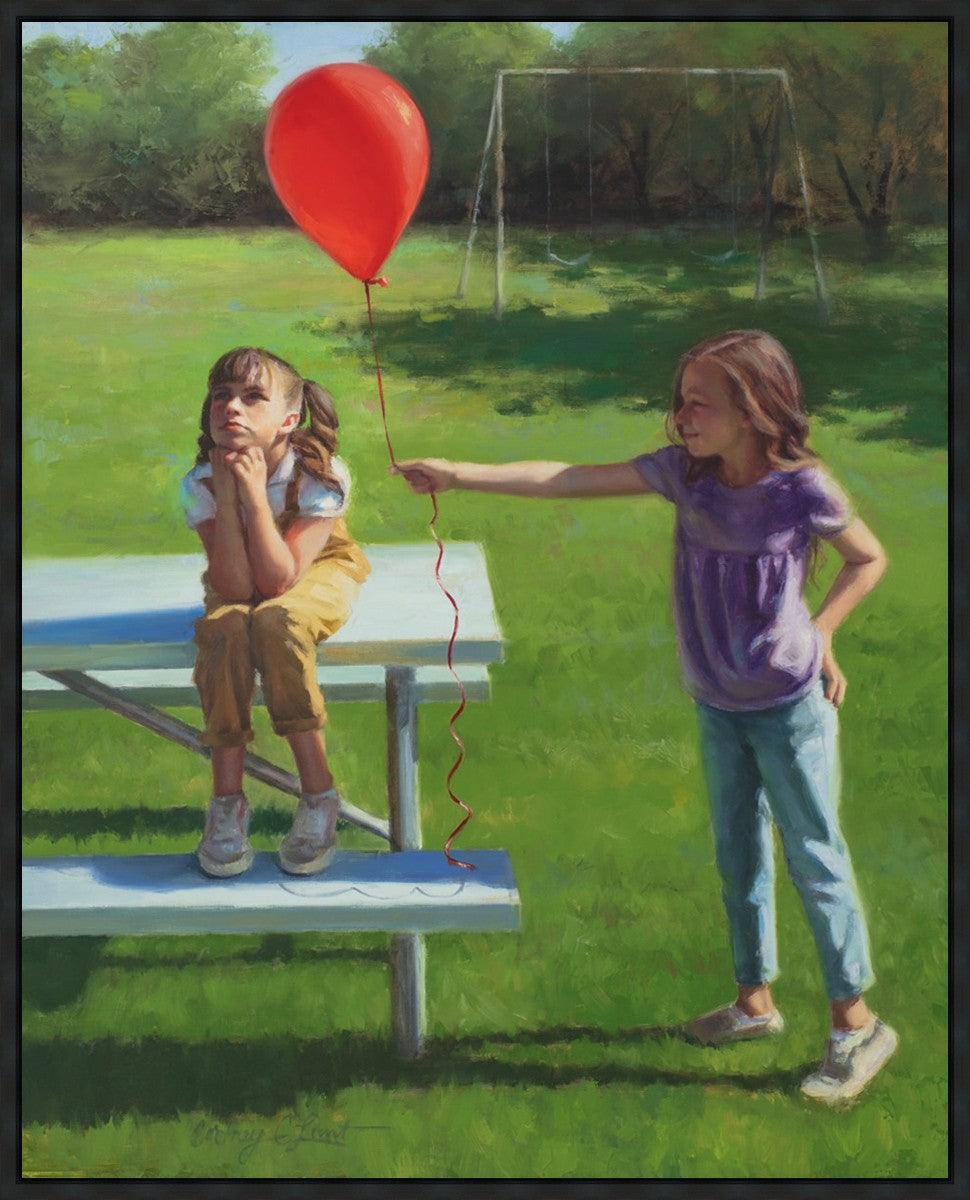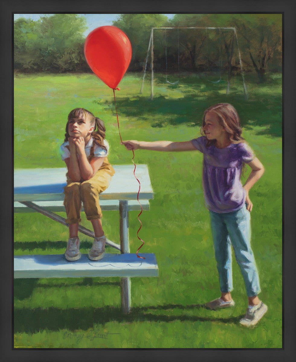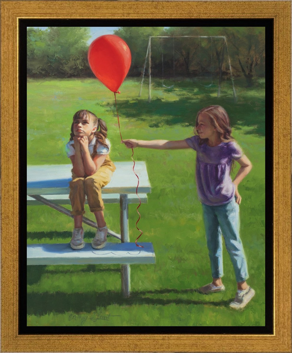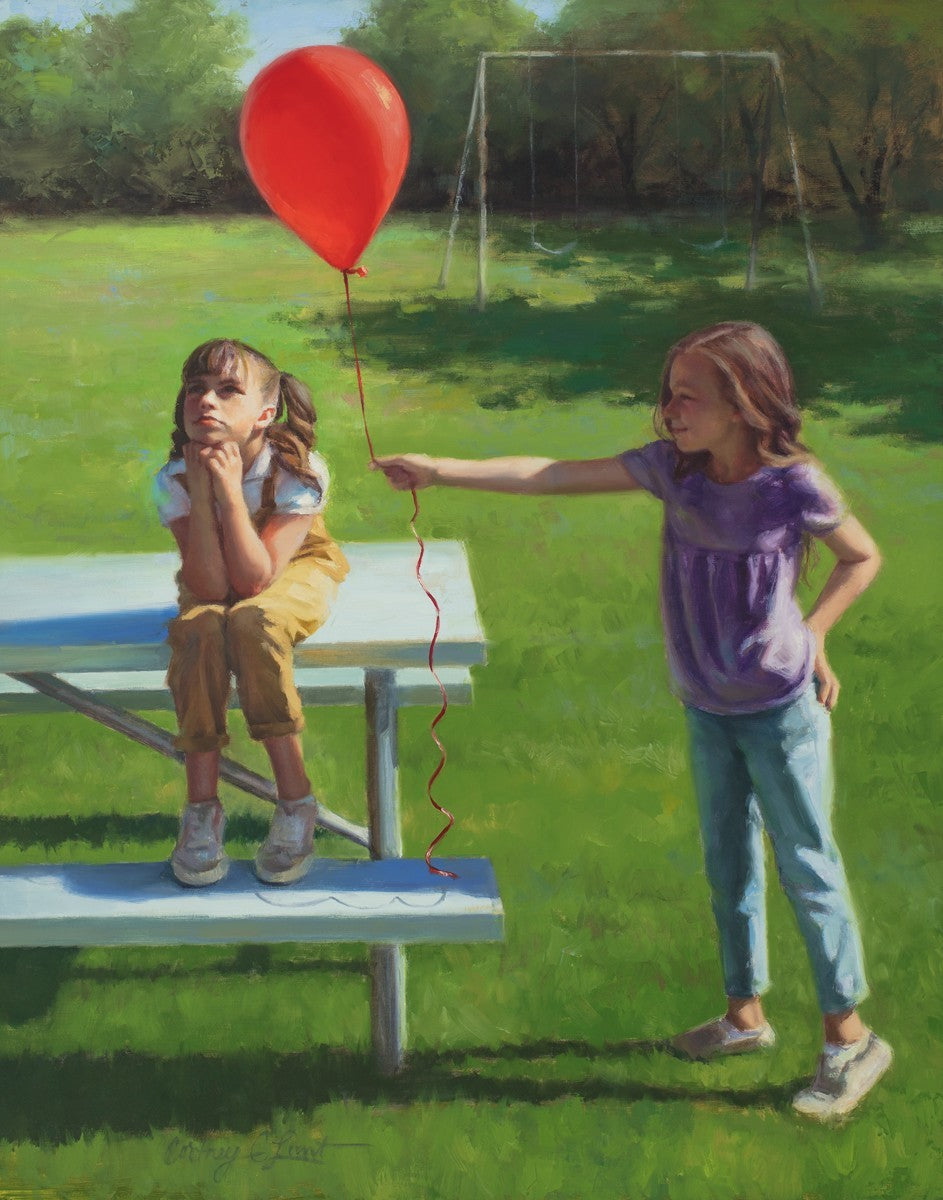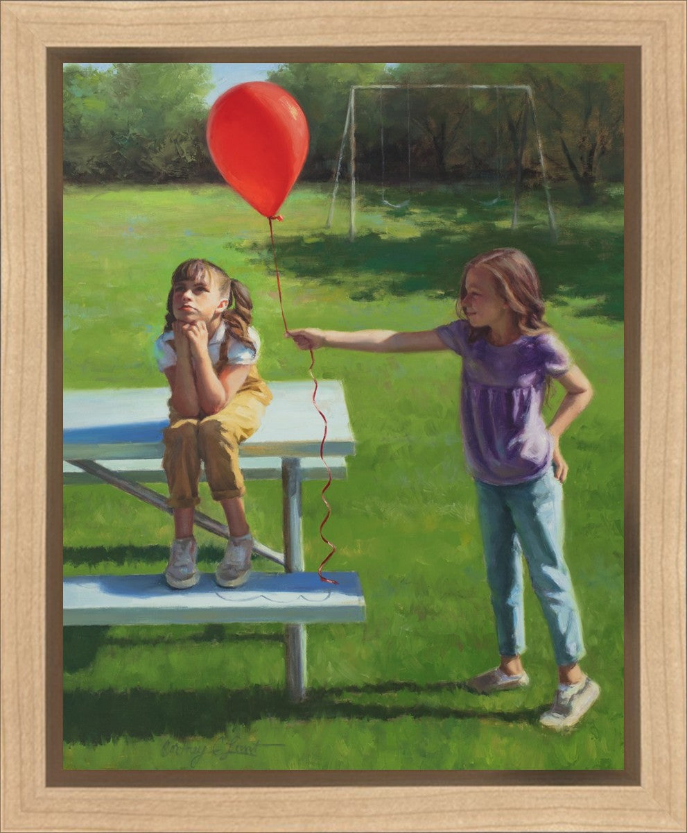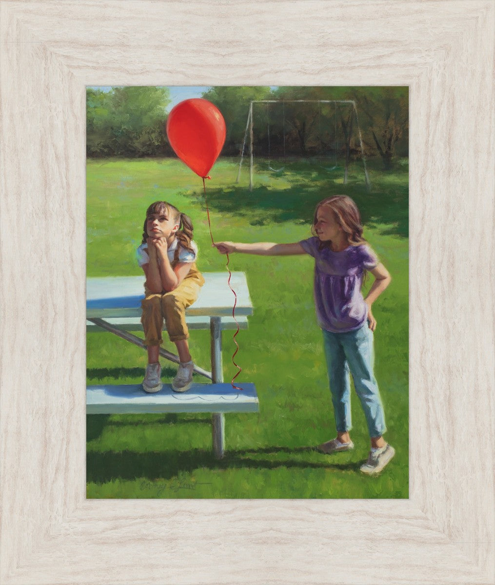 I had been trying to think of a way that I could do a painting that represents kindness. One day I was at a park with my family, and we noticed a little scene that was my inspiration I had been looking for. There was a little girl who had lost her helium balloon and was quite upset by it. Then we noticed her sister give up her very own balloon by handing it to her to help her feel better. It was so sweet! My daughter leaned over to me and told me I should paint that story, and I agreed. It’s a perfect example of true kindness.