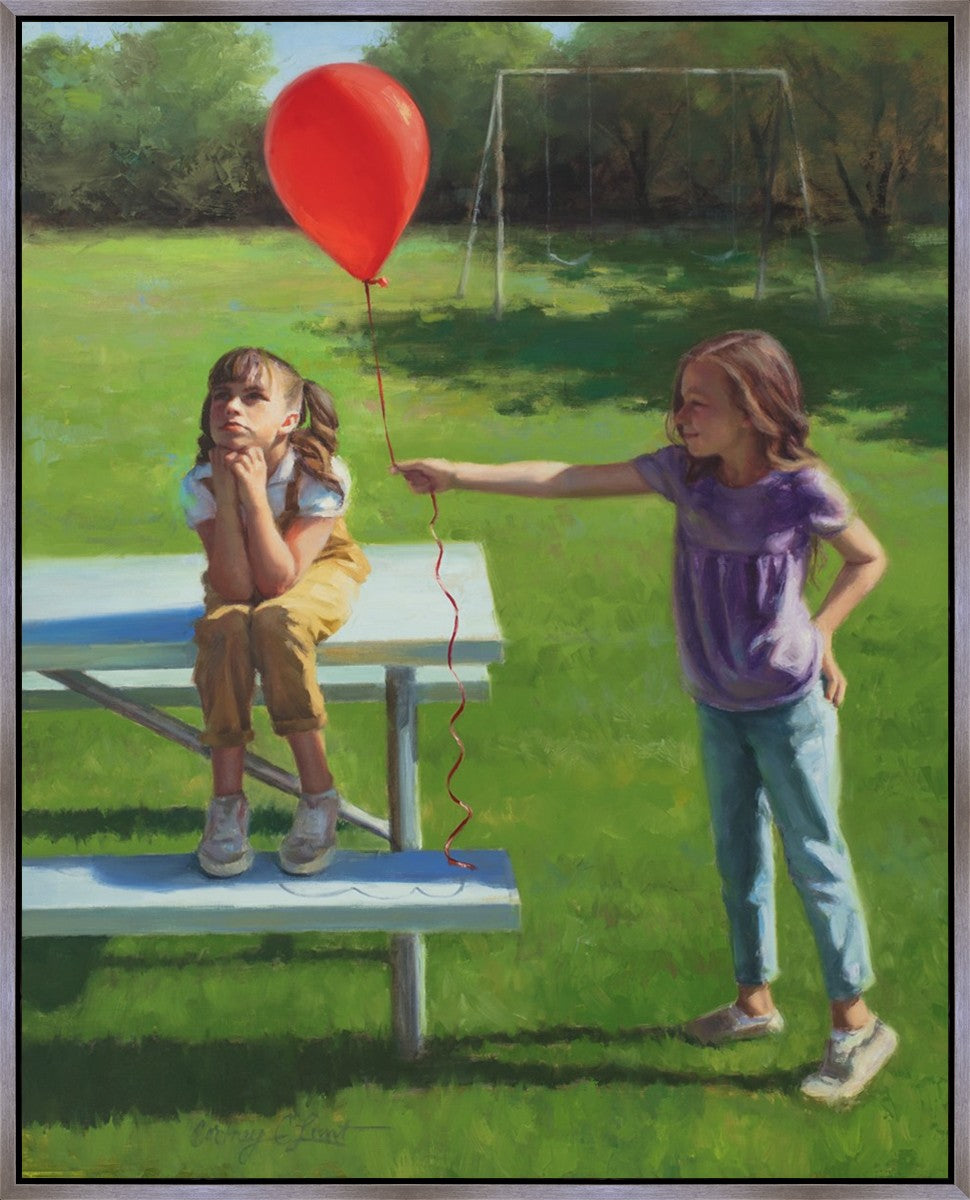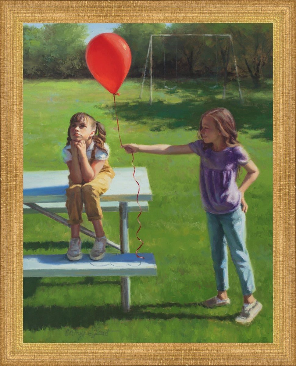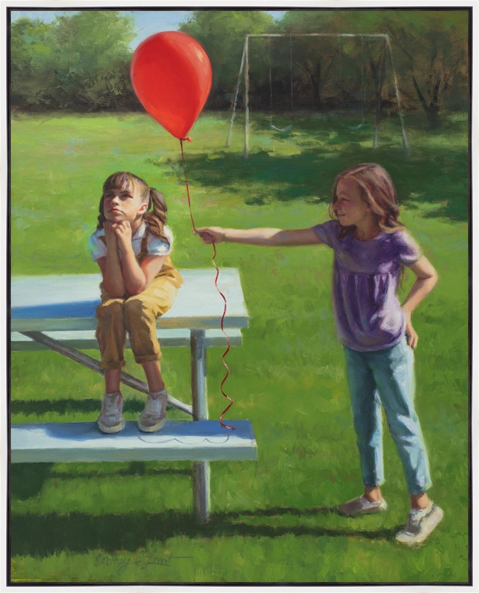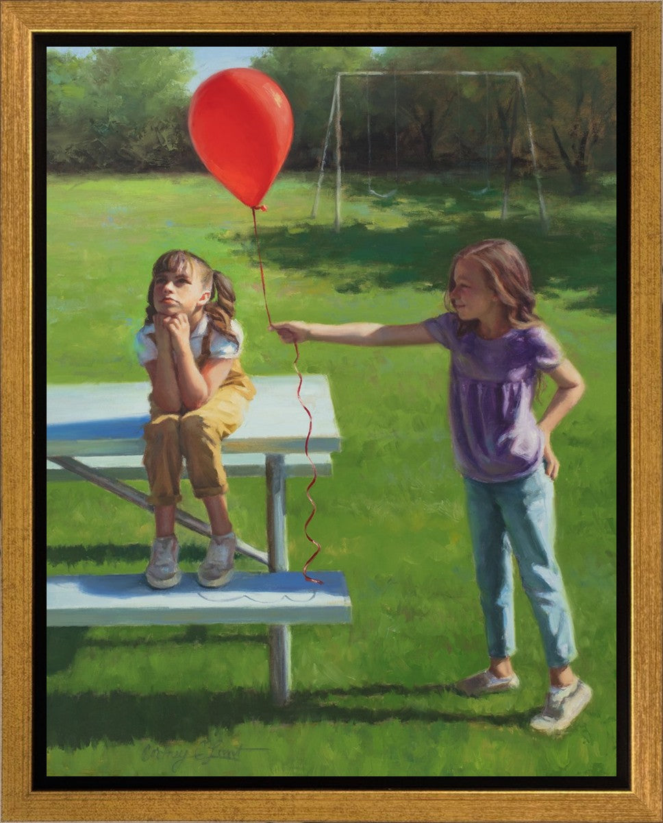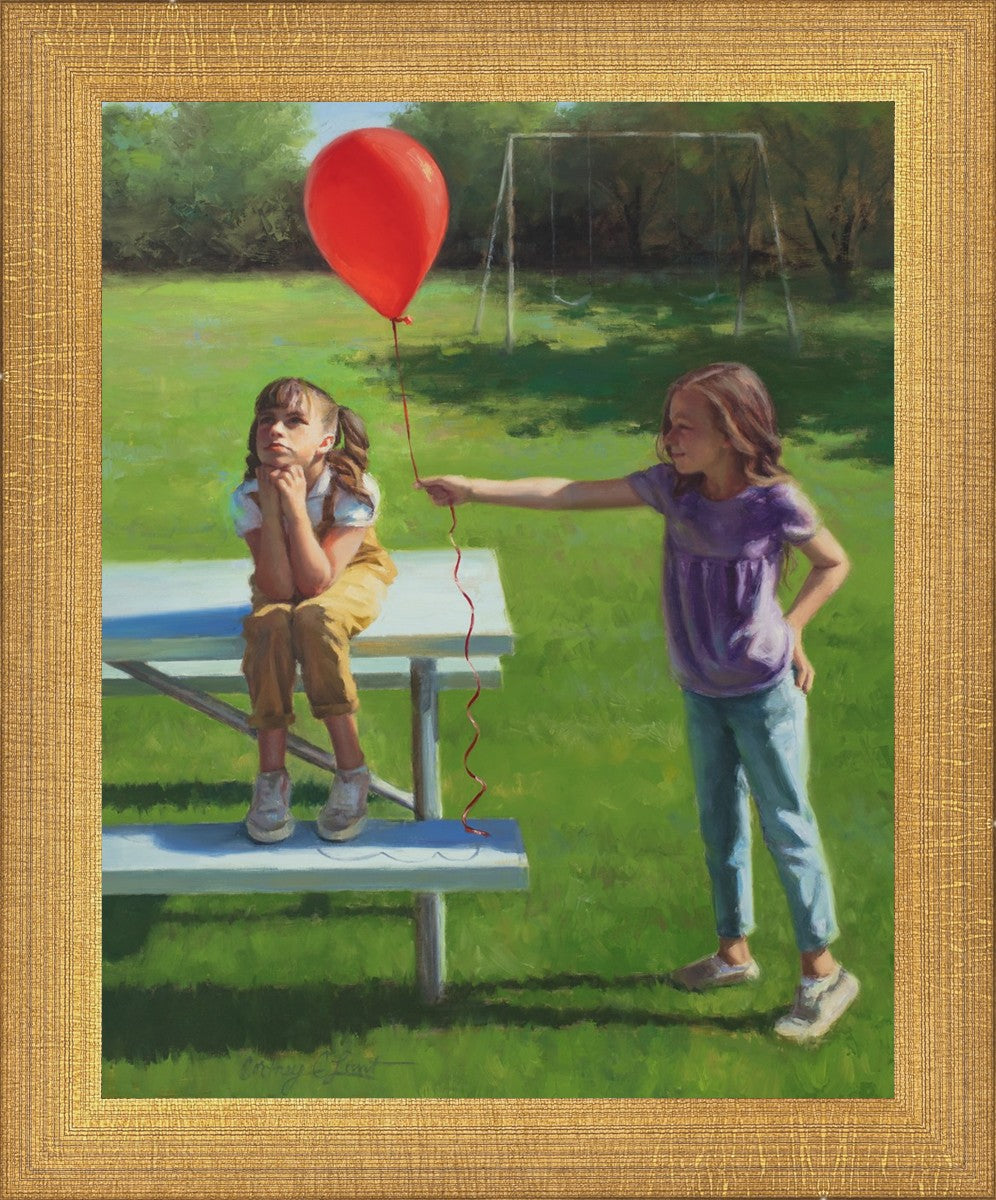I had been trying to think of a way that I could do a painting that represents kindness. One day I was at a park with my family, and we noticed a little scene that was my inspiration I had been looking for. There was a little girl who had lost her helium balloon and was quite upset by it. Then we noticed her sister give up her very own balloon by handing it to her to help her feel better. It was so sweet! My daughter leaned over to me and told me I should paint that story, and I agreed. It’s a perfect example of true kindness.