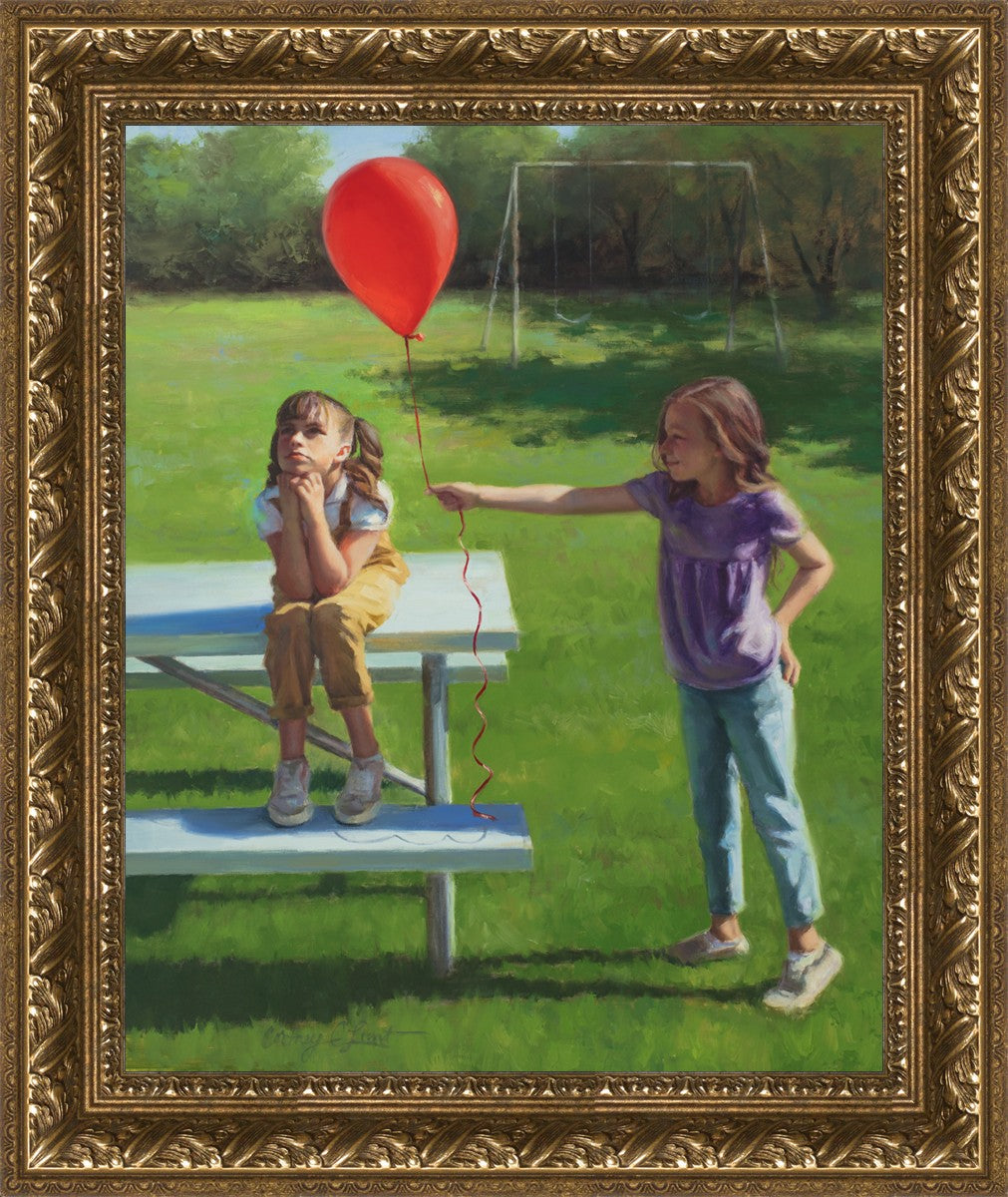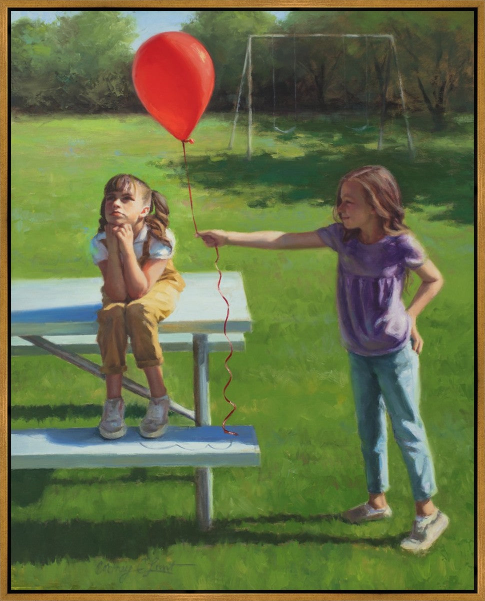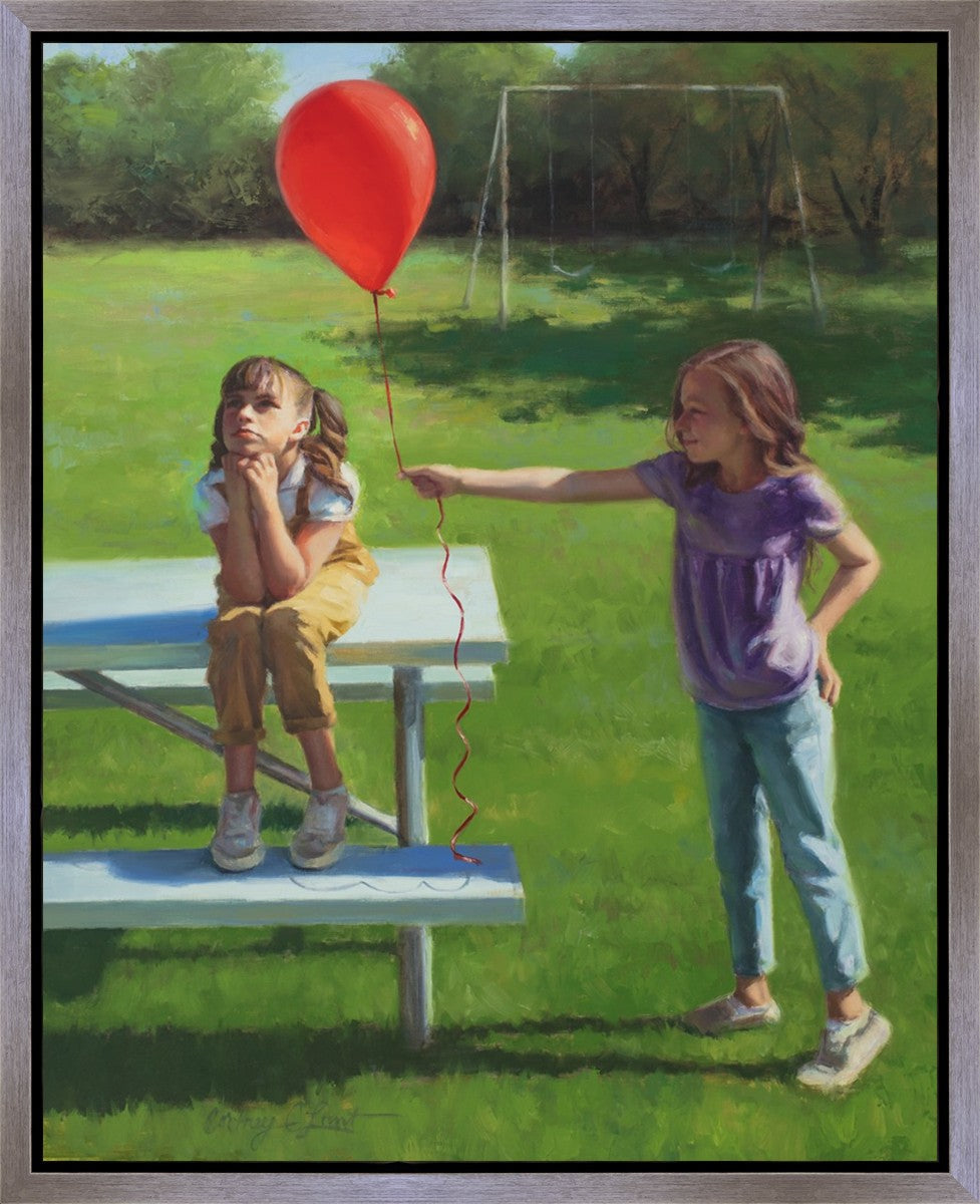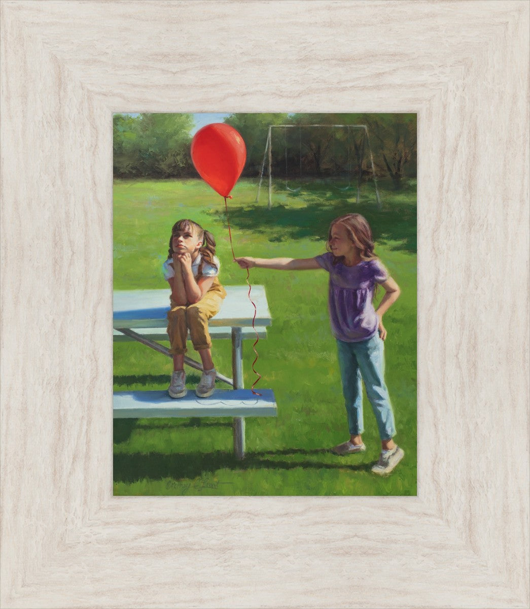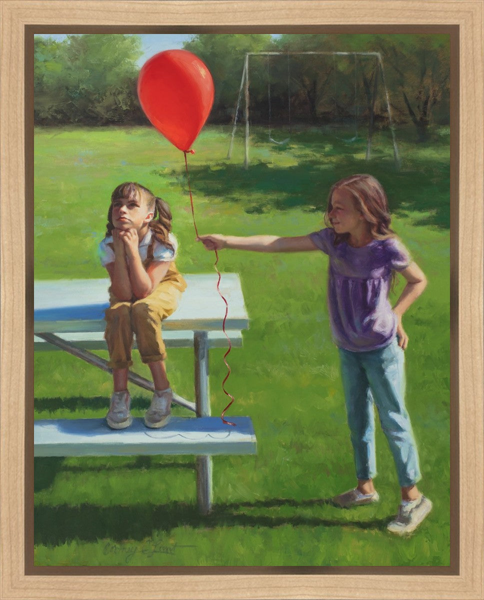 I had been trying to think of a way that I could do a painting that represents kindness. One day I was at a park with my family, and we noticed a little scene that was my inspiration I had been looking for. There was a little girl who had lost her helium balloon and was quite upset by it. Then we noticed her sister give up her very own balloon by handing it to her to help her feel better. It was so sweet! My daughter leaned over to me and told me I should paint that story, and I agreed. It’s a perfect example of true kindness.