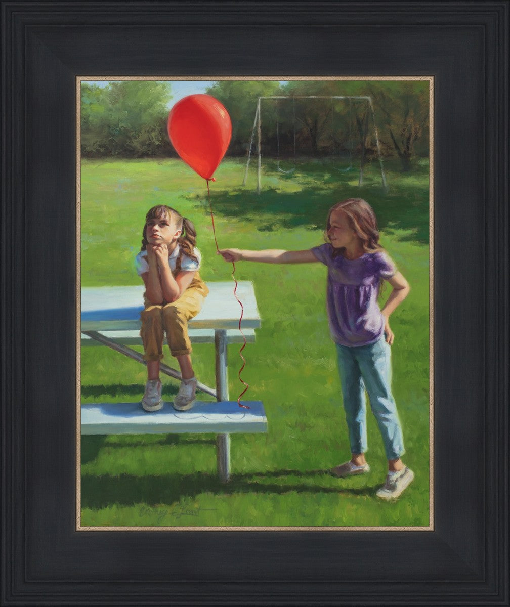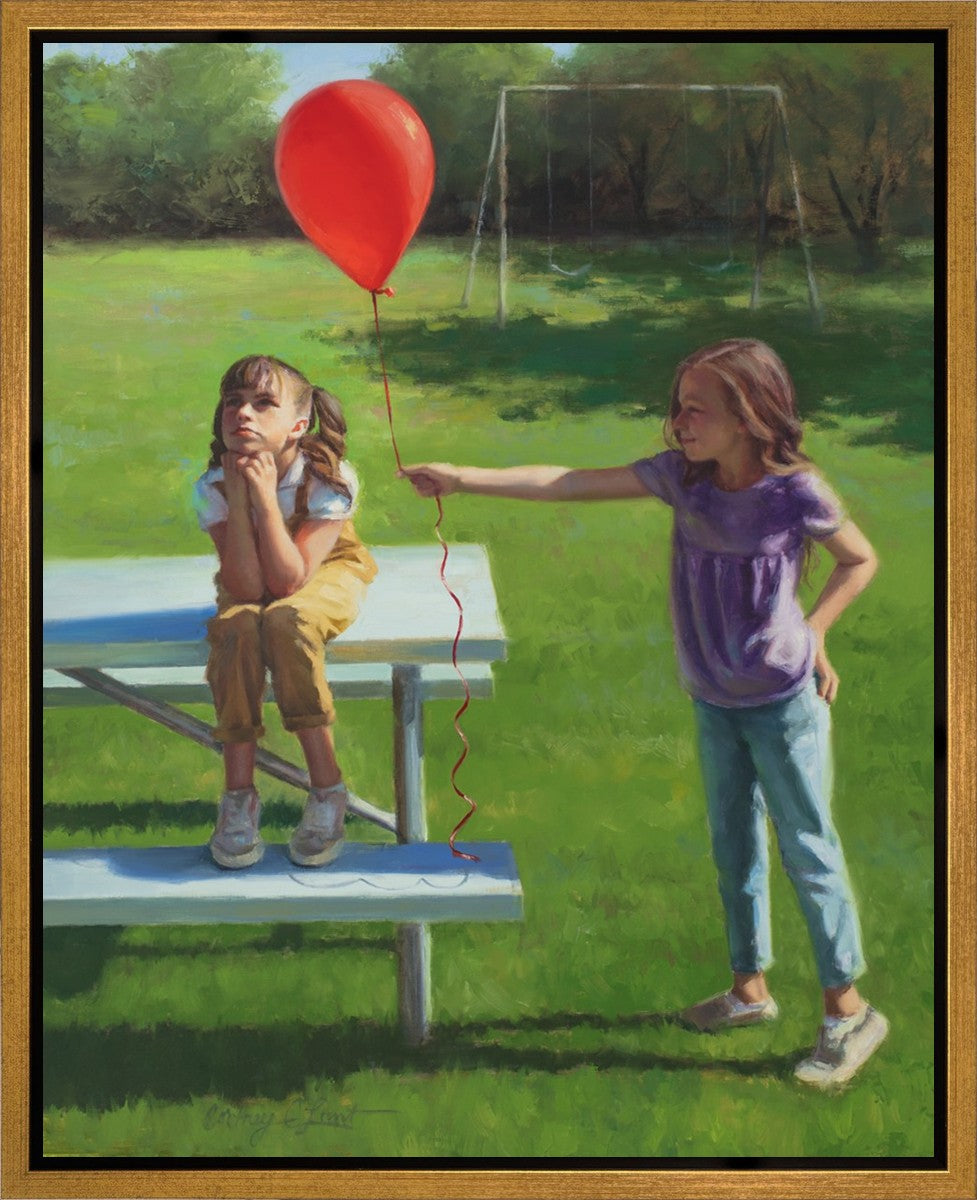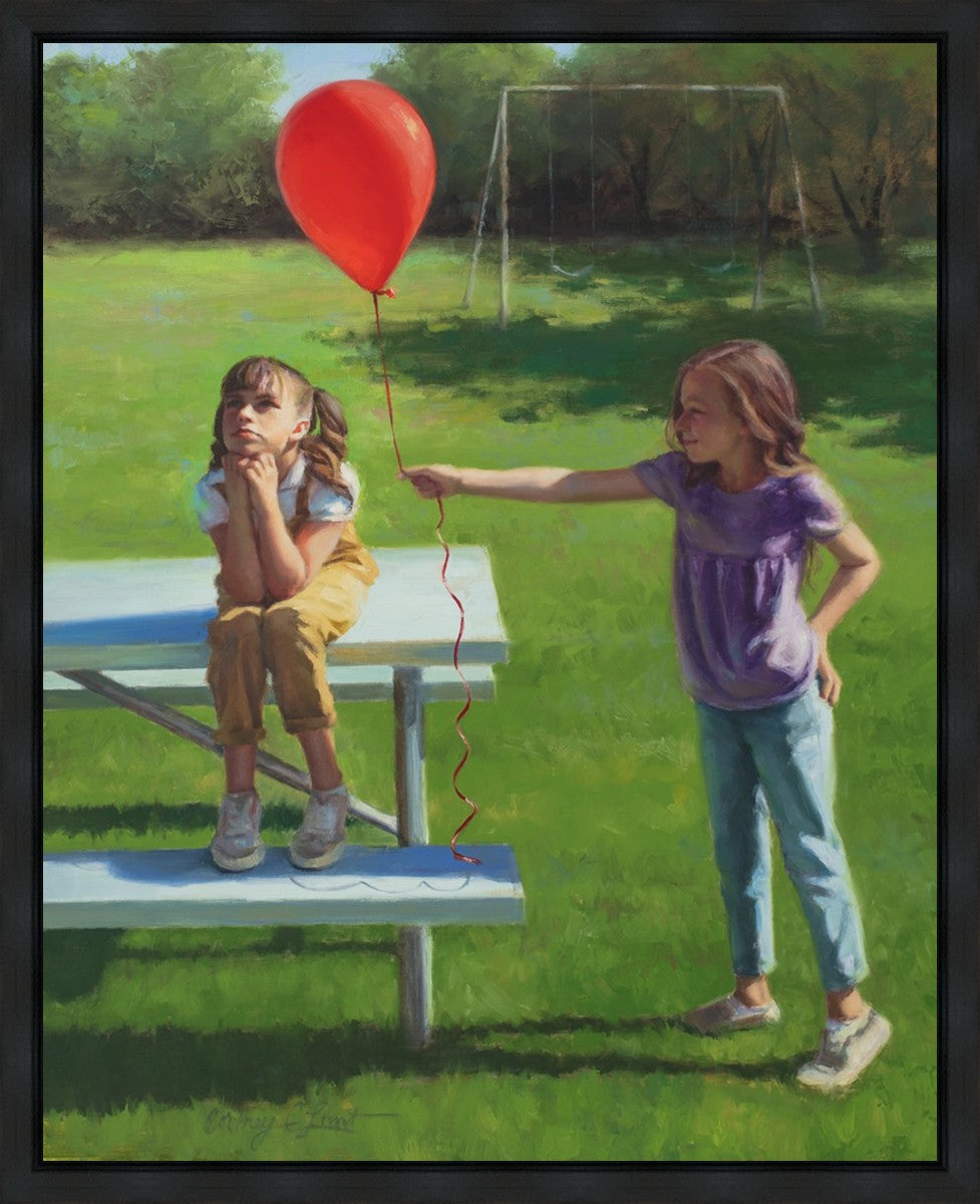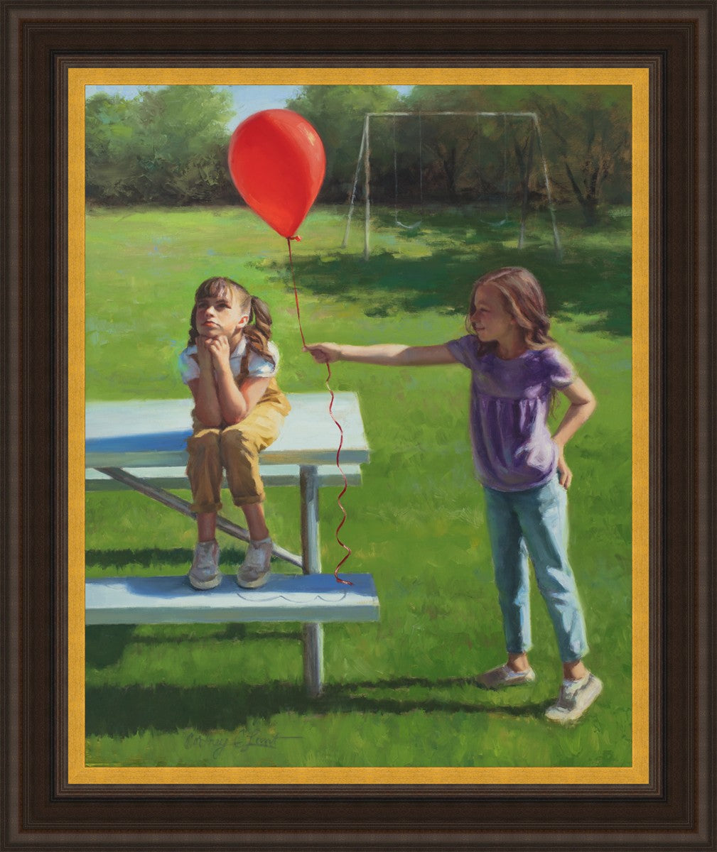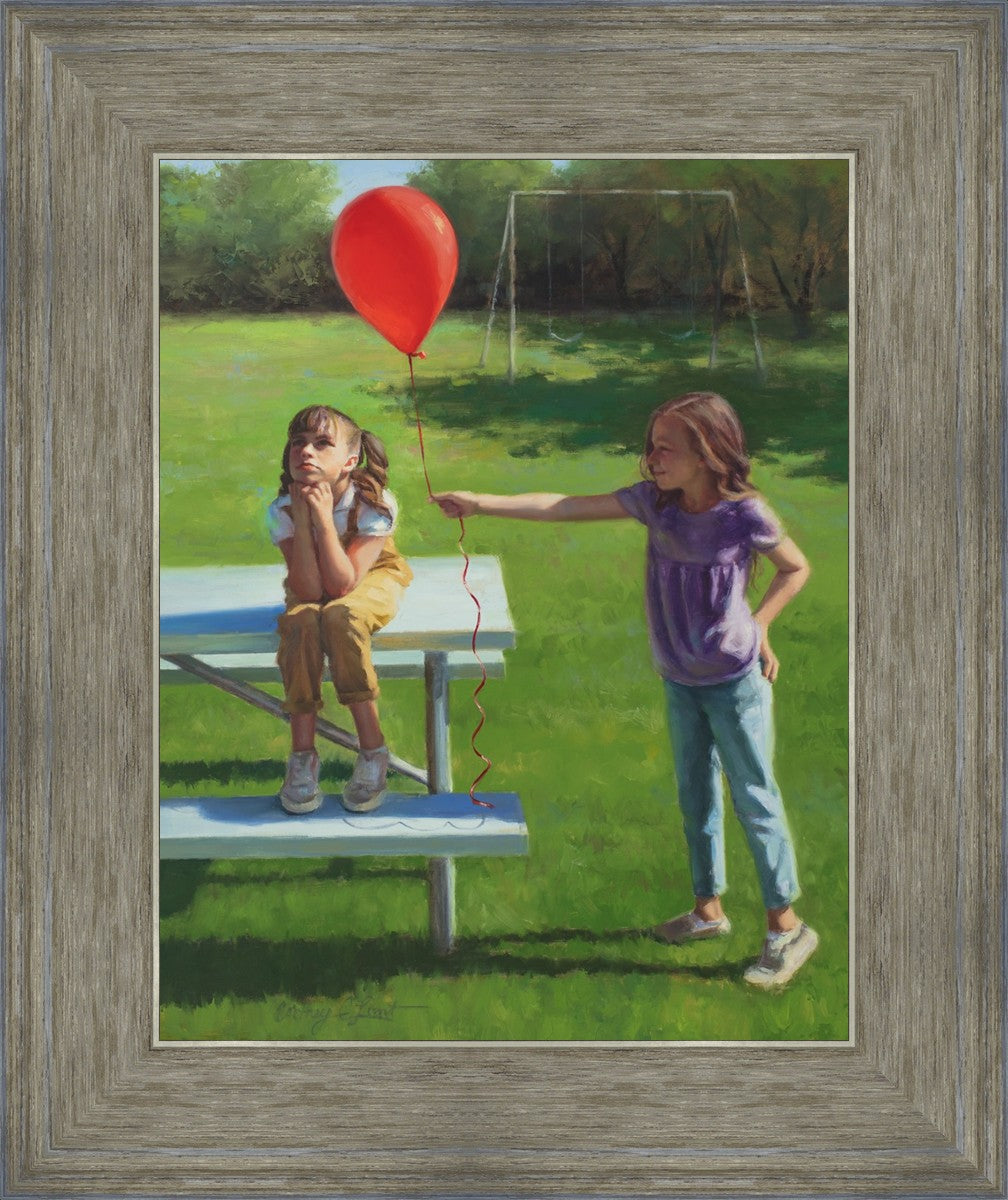 I had been trying to think of a way that I could do a painting that represents kindness. One day I was at a park with my family, and we noticed a little scene that was my inspiration I had been looking for. There was a little girl who had lost her helium balloon and was quite upset by it. Then we noticed her sister give up her very own balloon by handing it to her to help her feel better. It was so sweet! My daughter leaned over to me and told me I should paint that story, and I agreed. It’s a perfect example of true kindness.