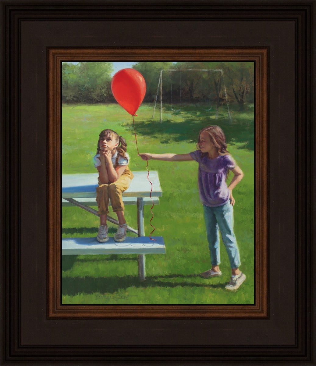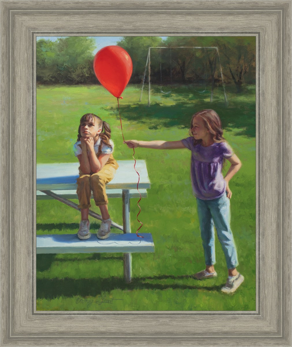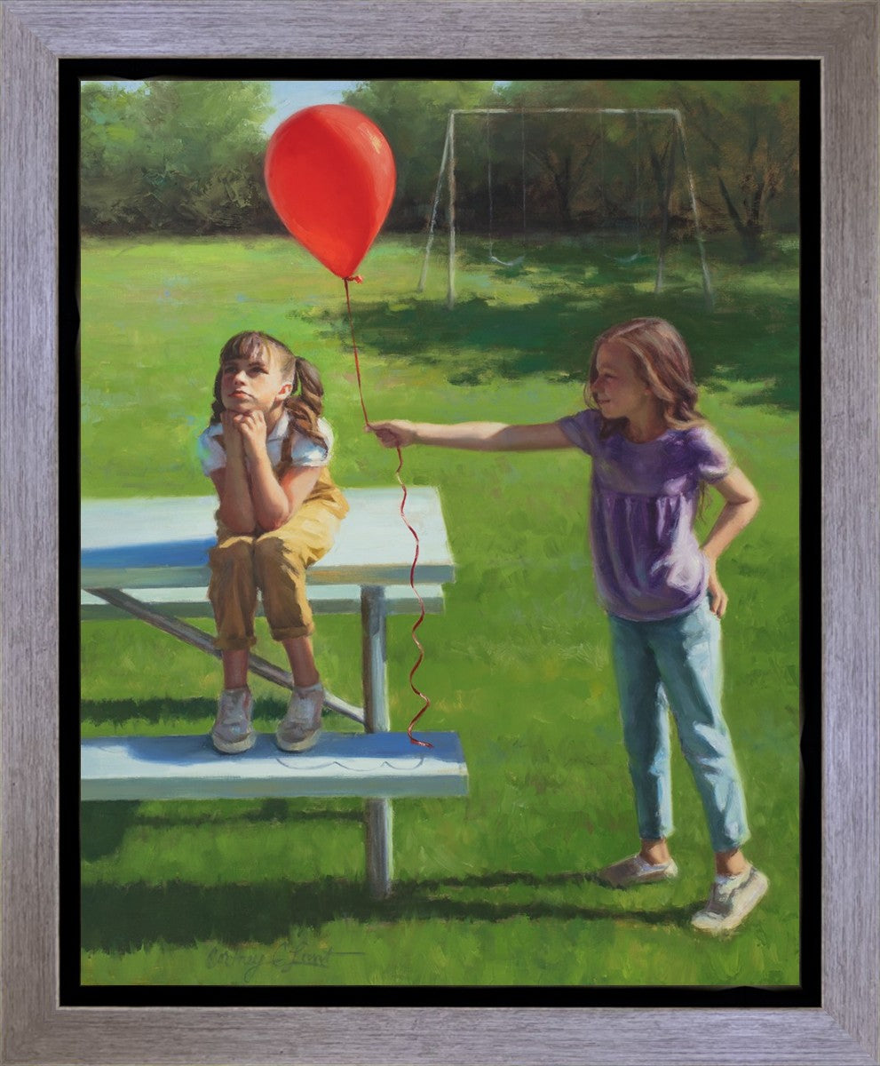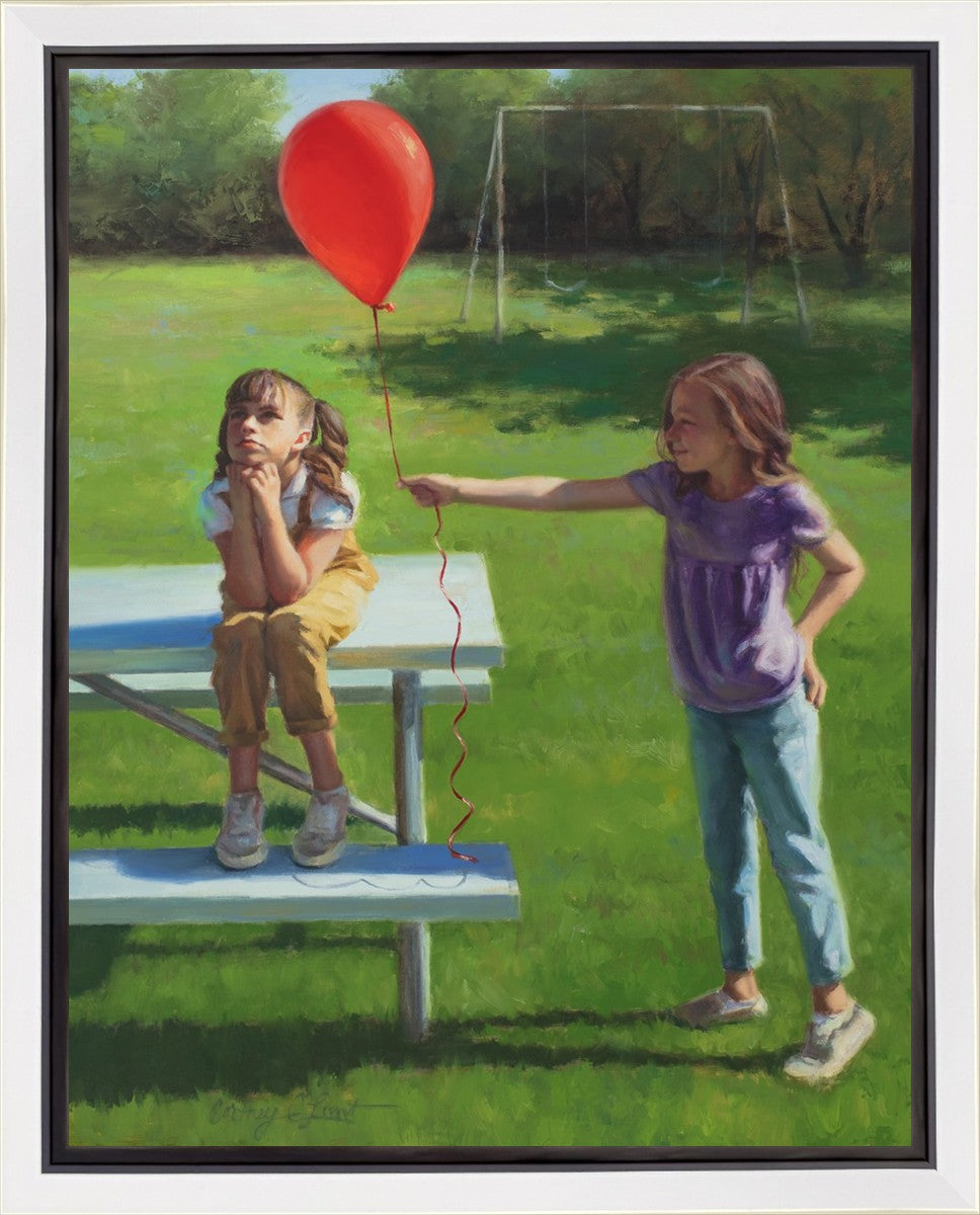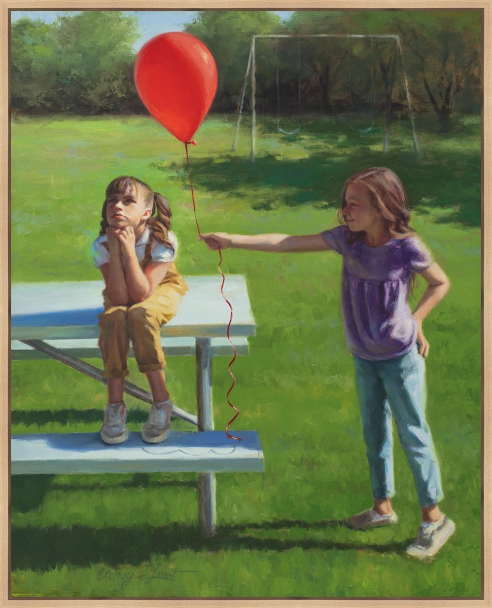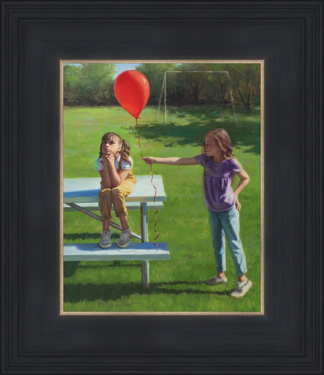 I had been trying to think of a way that I could do a painting that represents kindness. One day I was at a park with my family, and we noticed a little scene that was my inspiration I had been looking for. There was a little girl who had lost her helium balloon and was quite upset by it. Then we noticed her sister give up her very own balloon by handing it to her to help her feel better. It was so sweet! My daughter leaned over to me and told me I should paint that story, and I agreed. It’s a perfect example of true kindness.