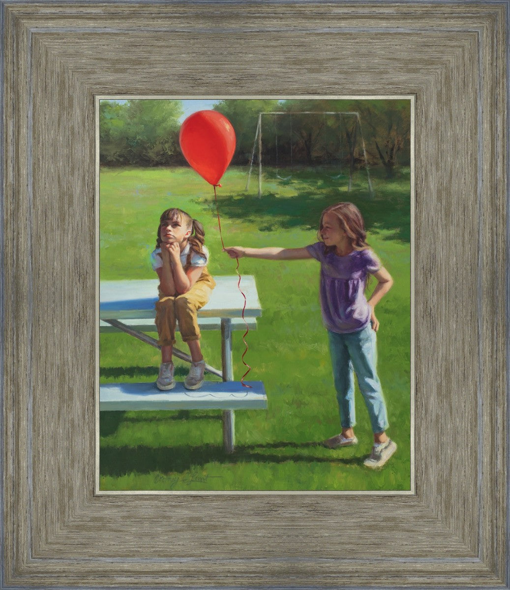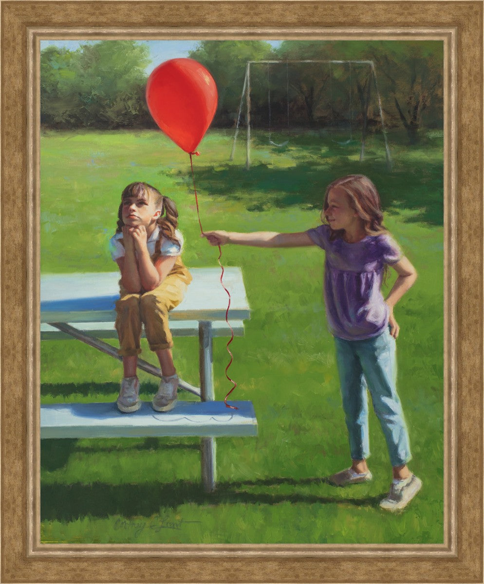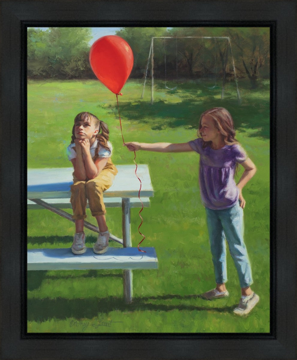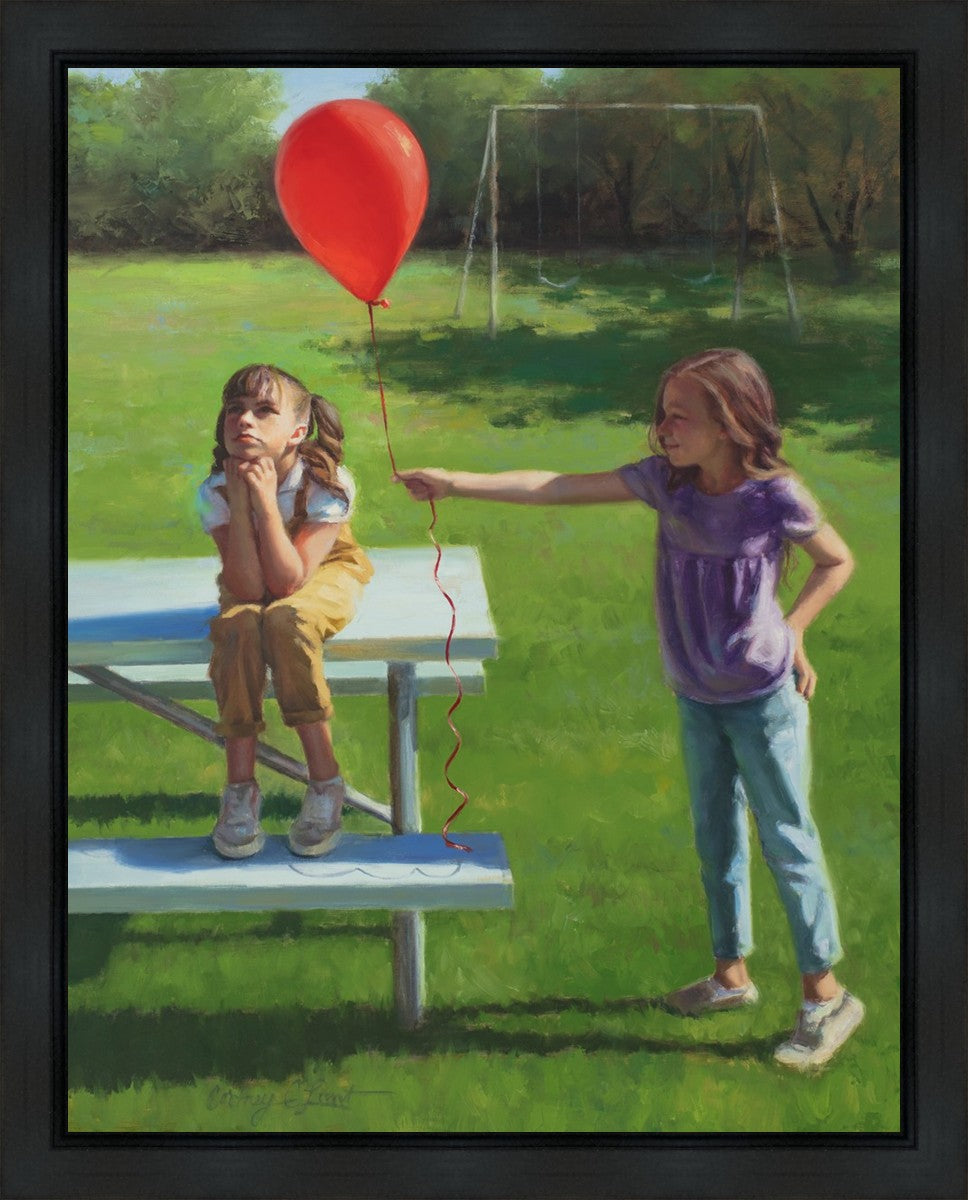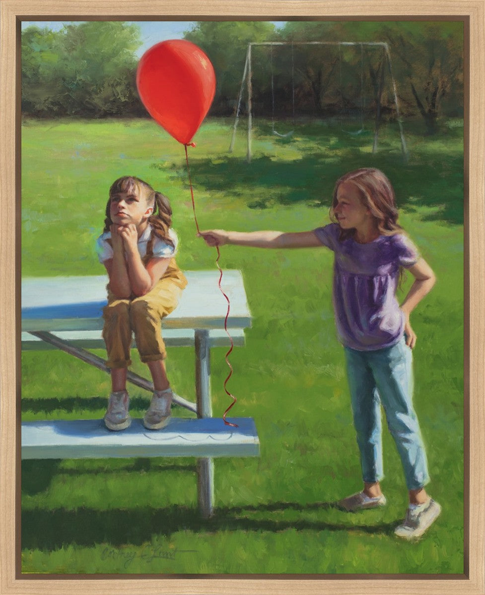 I had been trying to think of a way that I could do a painting that represents kindness. One day I was at a park with my family, and we noticed a little scene that was my inspiration I had been looking for. There was a little girl who had lost her helium balloon and was quite upset by it. Then we noticed her sister give up her very own balloon by handing it to her to help her feel better. It was so sweet! My daughter leaned over to me and told me I should paint that story, and I agreed. It’s a perfect example of true kindness.