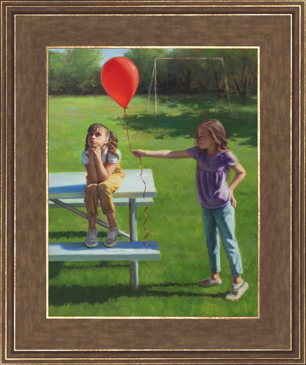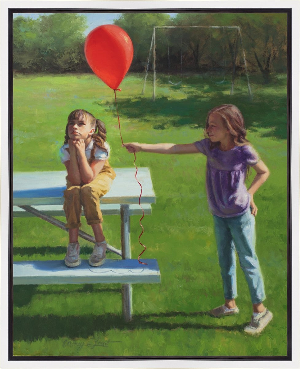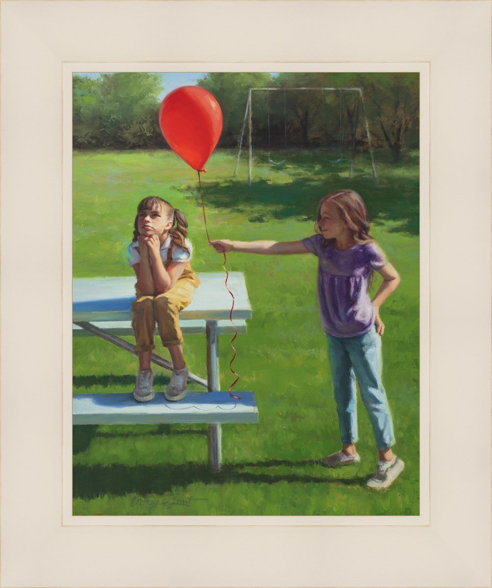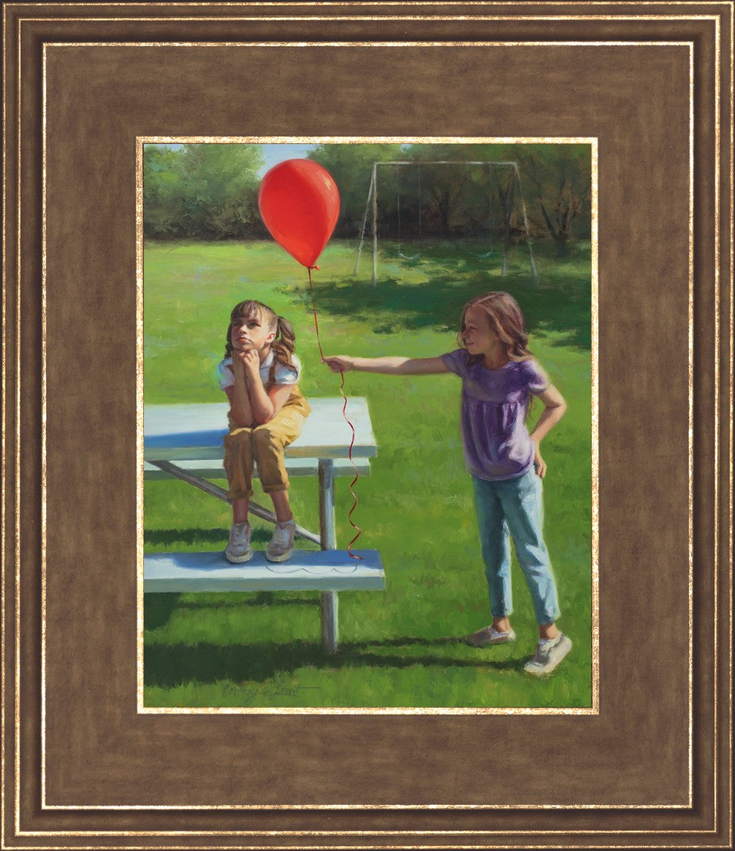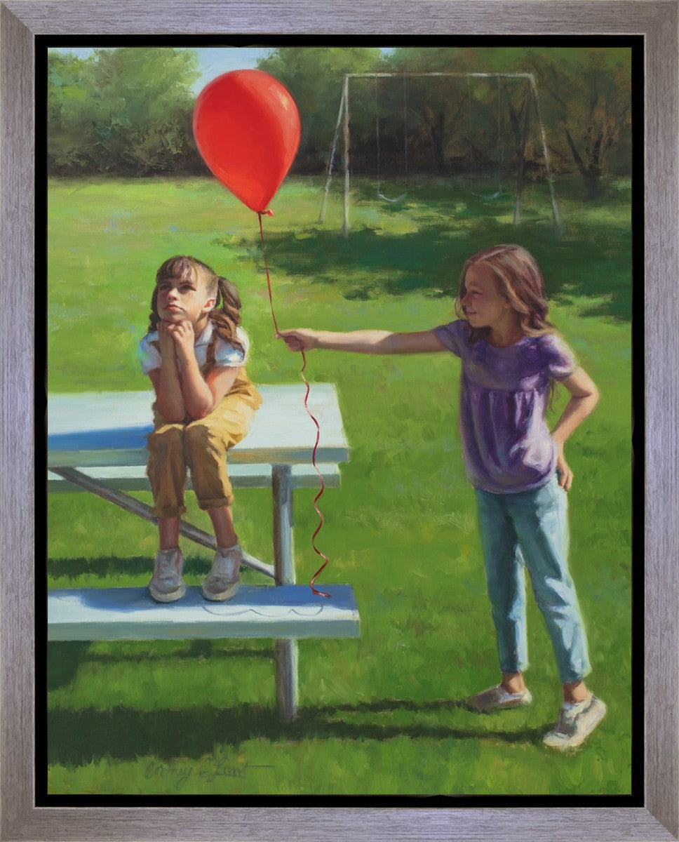 I had been trying to think of a way that I could do a painting that represents kindness. One day I was at a park with my family, and we noticed a little scene that was my inspiration I had been looking for. There was a little girl who had lost her helium balloon and was quite upset by it. Then we noticed her sister give up her very own balloon by handing it to her to help her feel better. It was so sweet! My daughter leaned over to me and told me I should paint that story, and I agreed. It’s a perfect example of true kindness.