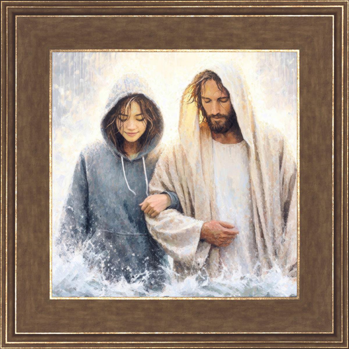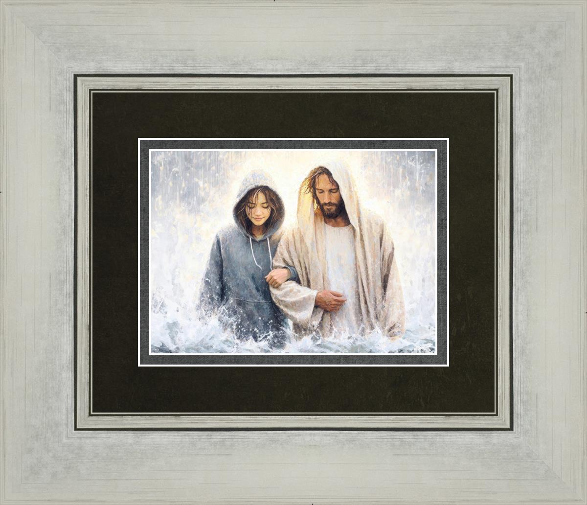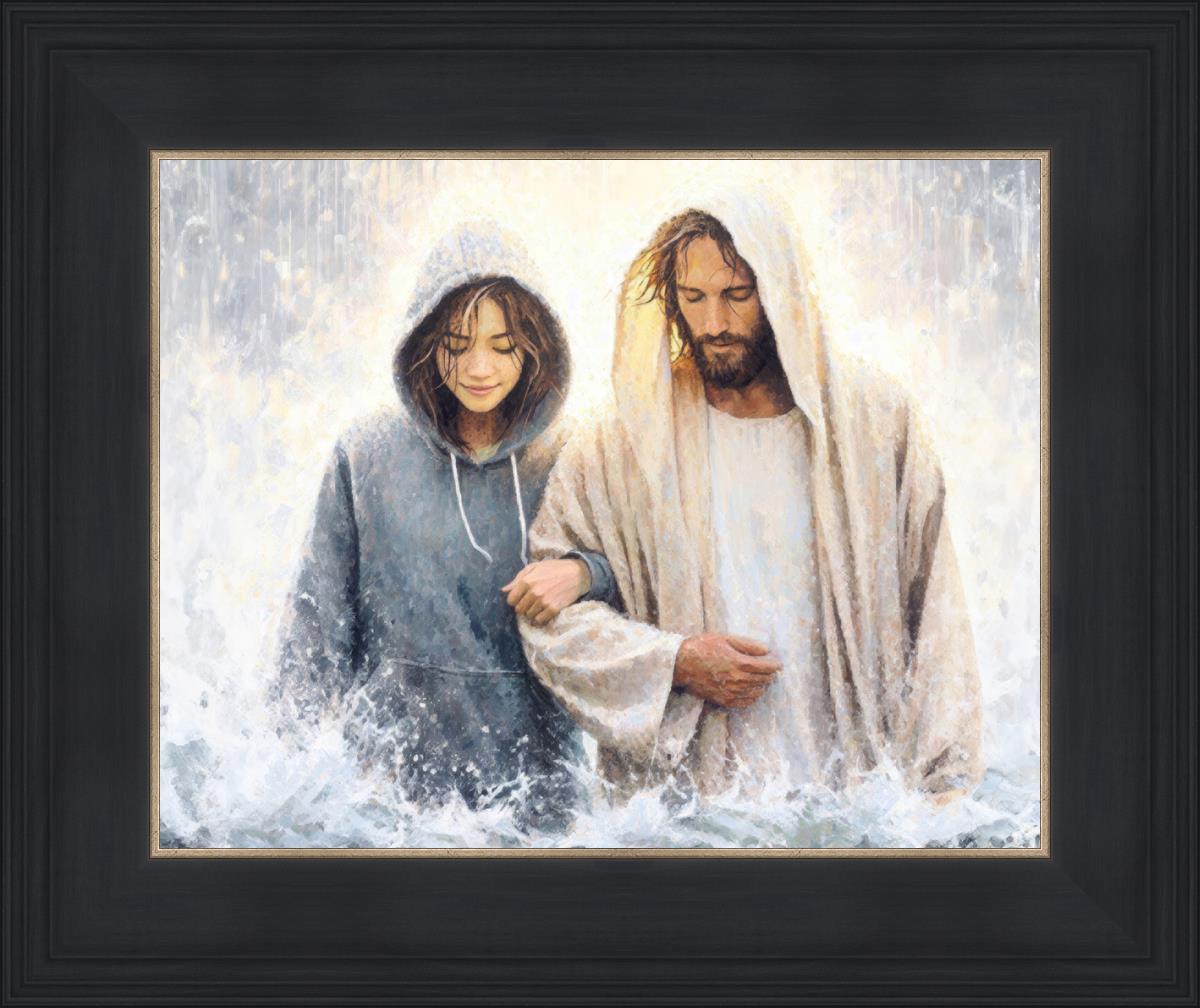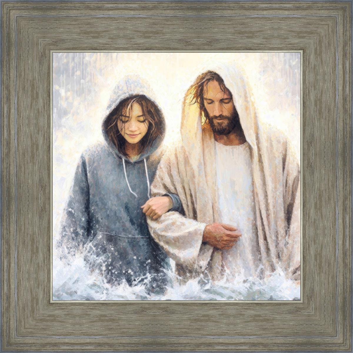 In this piece, a young girl exudes serenity as she clasps the arm of her Savior and confidant, strolling together through the water. Fearlessly, she embraces the security of her companionship with the Savior, feeling a profound sense of trust.
