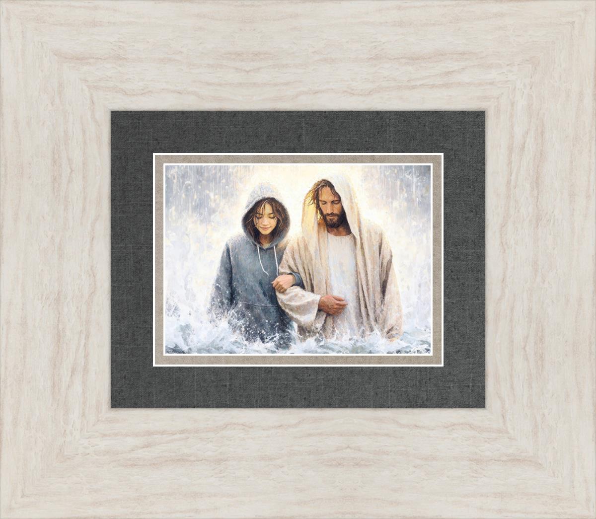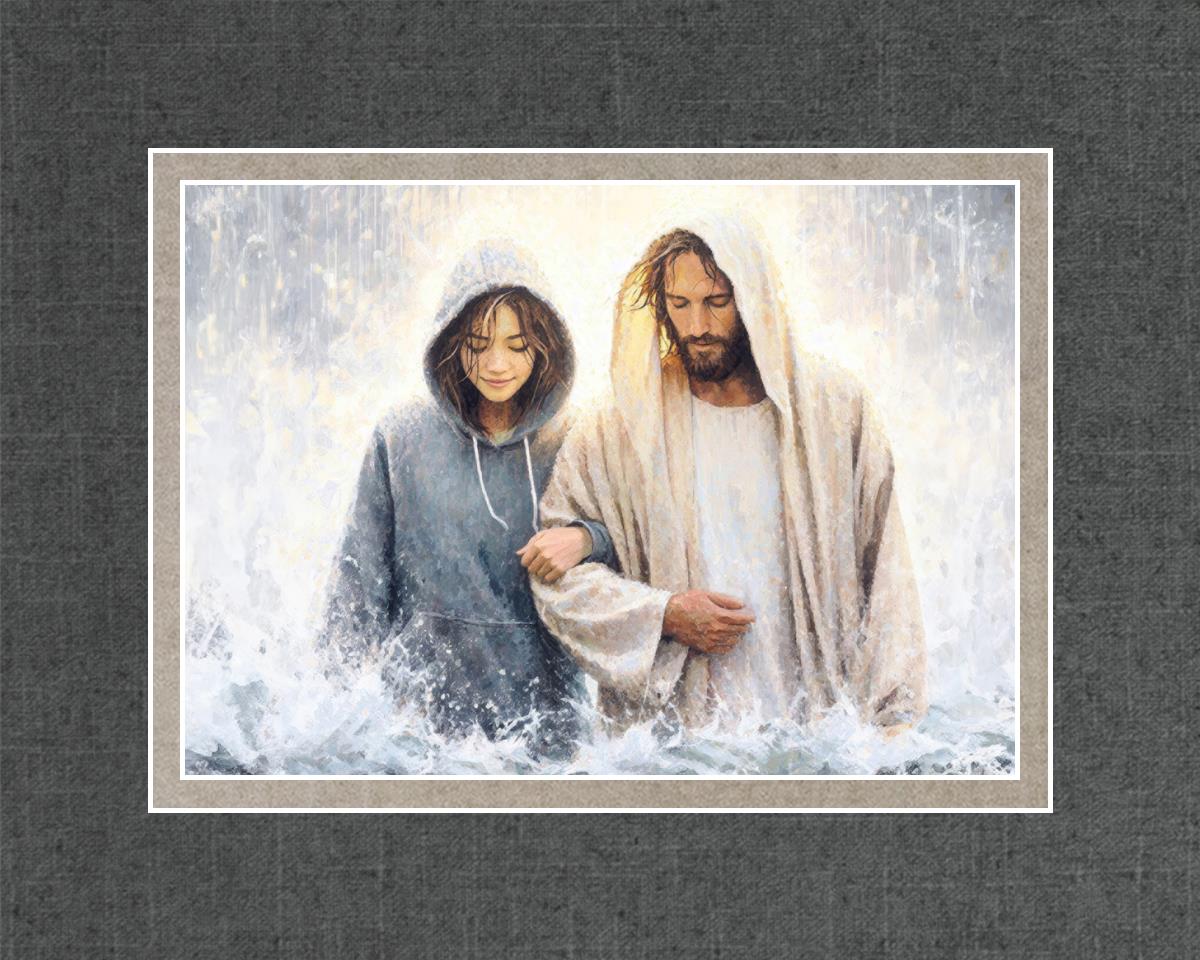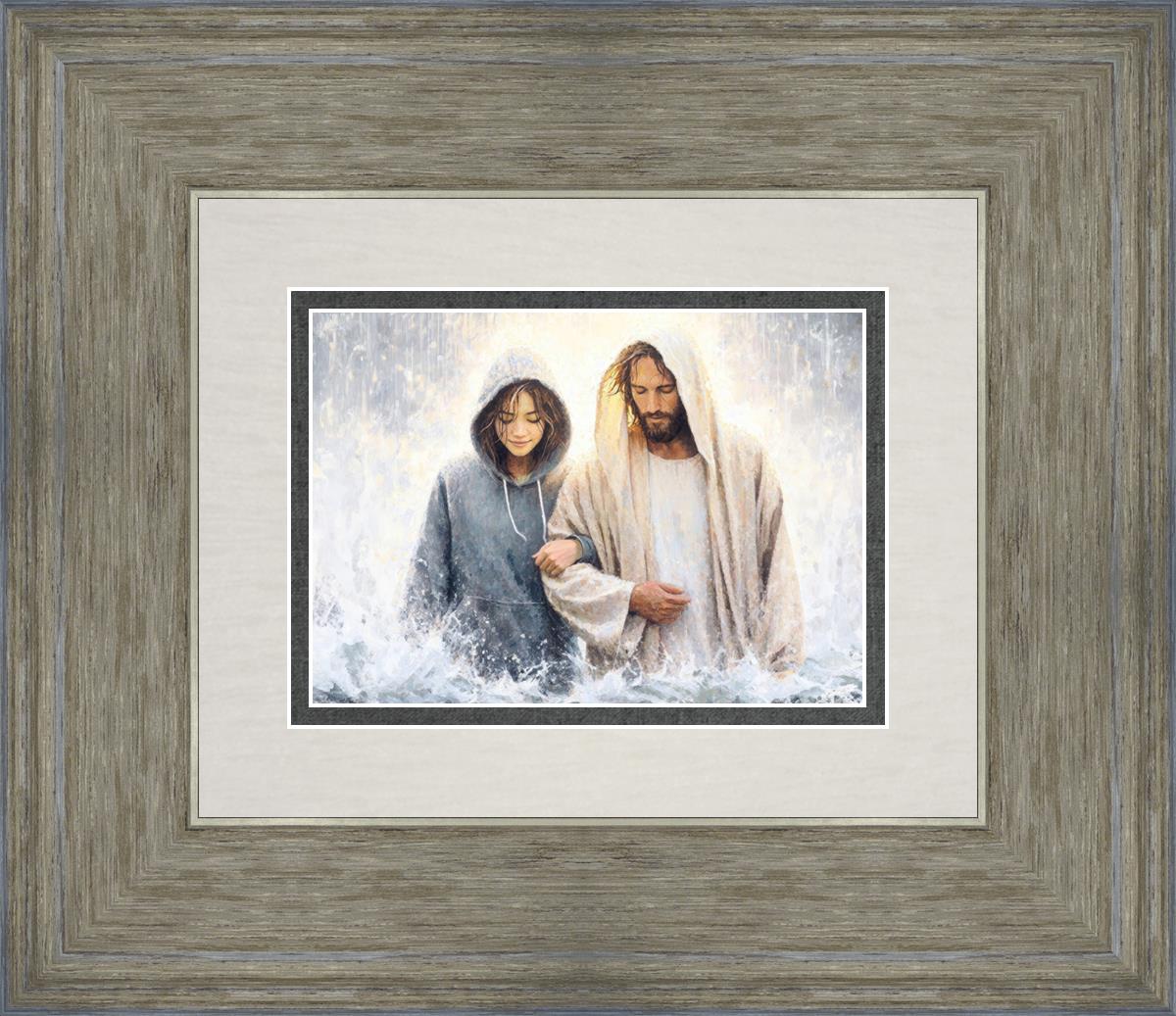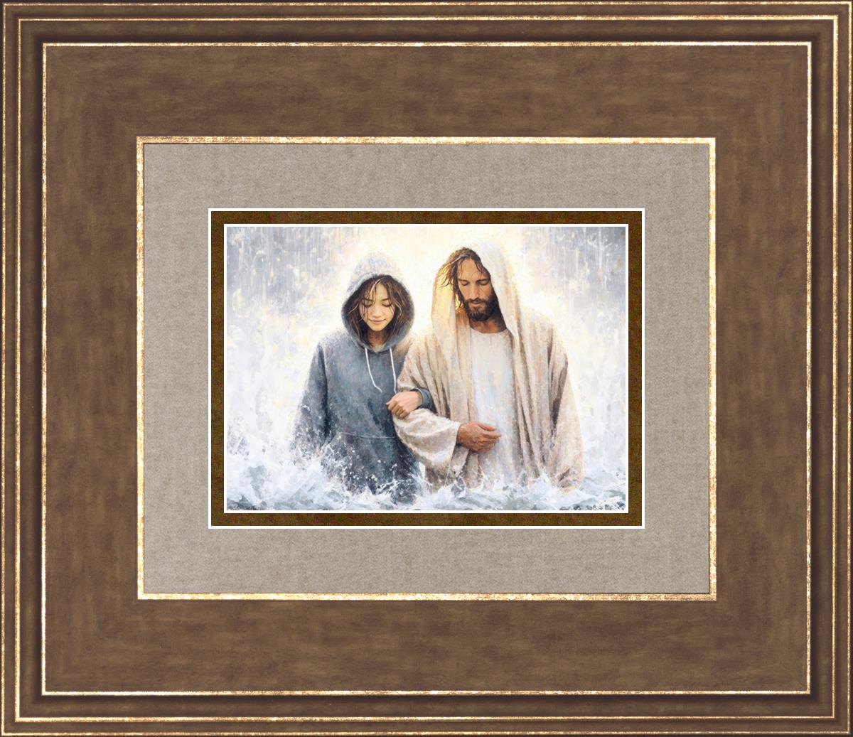 In this piece, a young girl exudes serenity as she clasps the arm of her Savior and confidant, strolling together through the water. Fearlessly, she embraces the security of her companionship with the Savior, feeling a profound sense of trust.