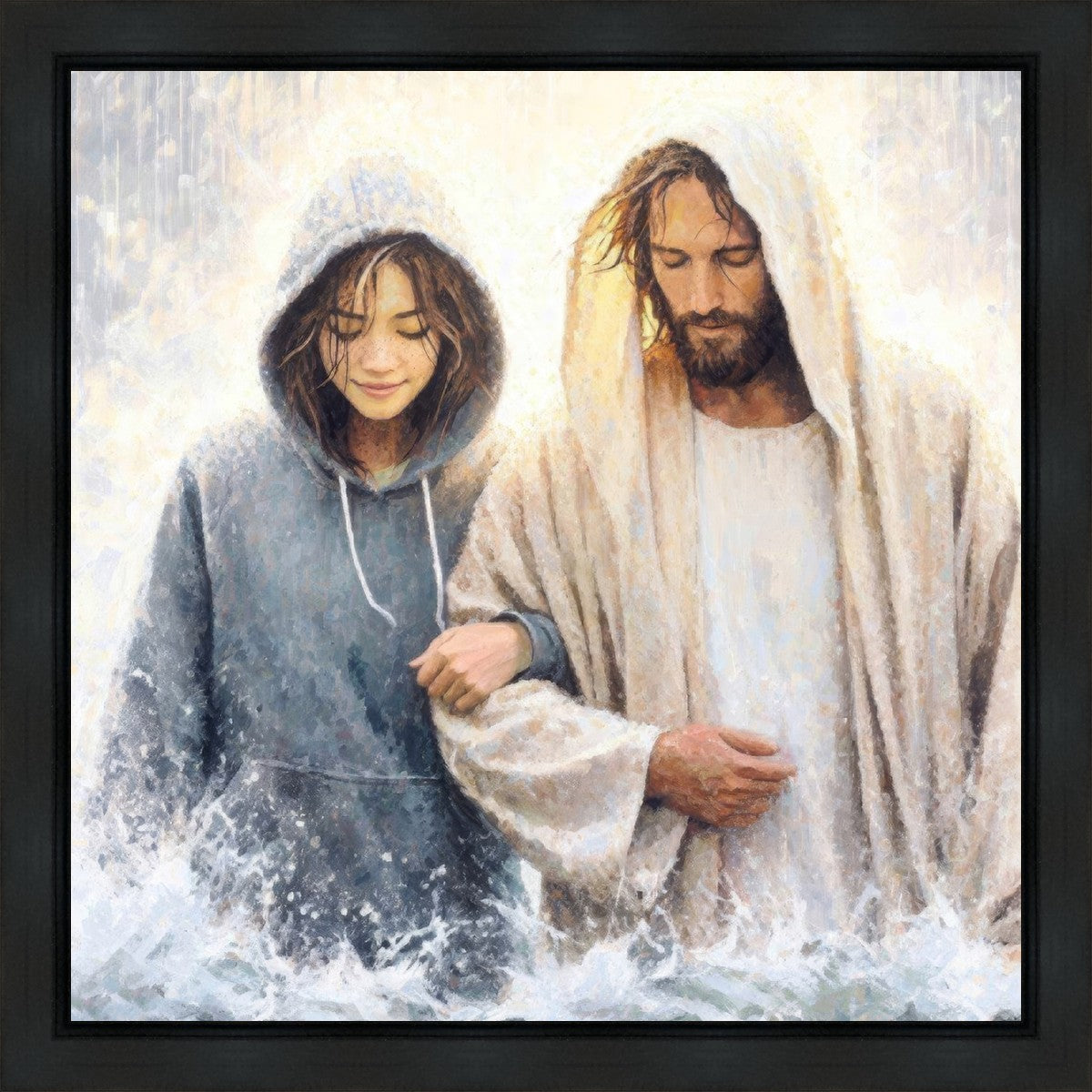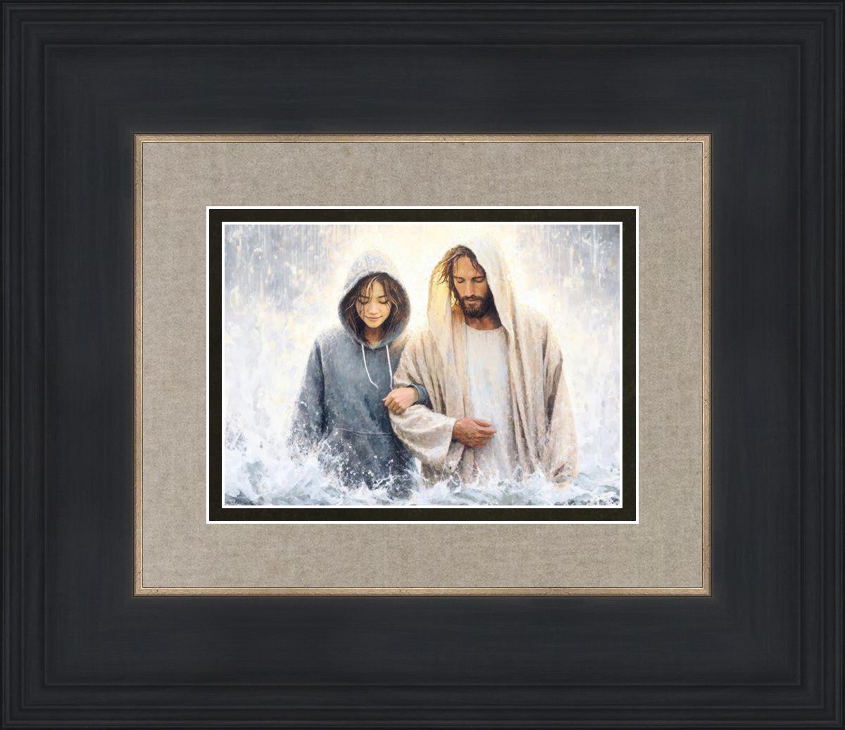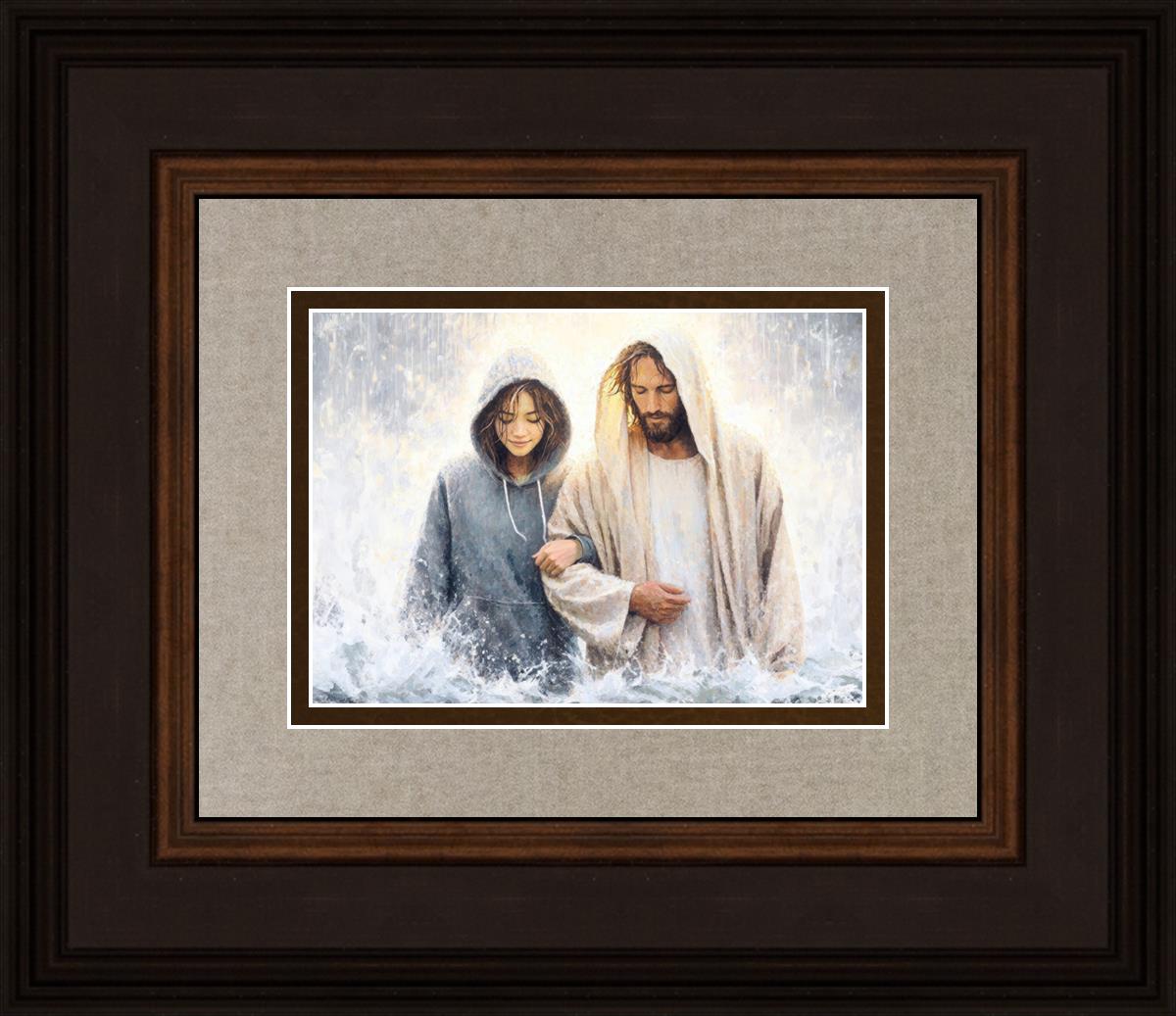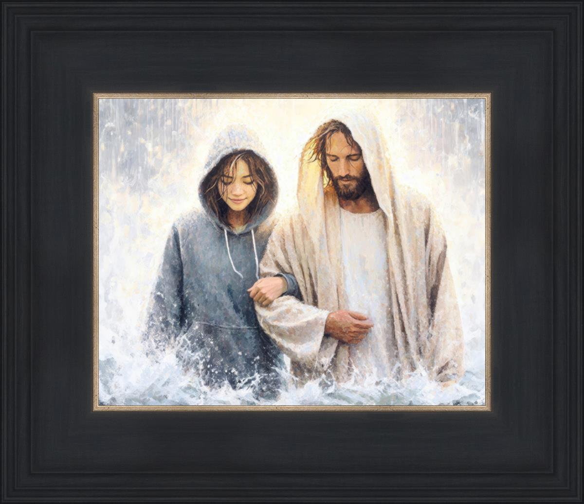 In this piece, a young girl exudes serenity as she clasps the arm of her Savior and confidant, strolling together through the water. Fearlessly, she embraces the security of her companionship with the Savior, feeling a profound sense of trust.