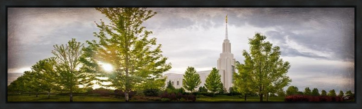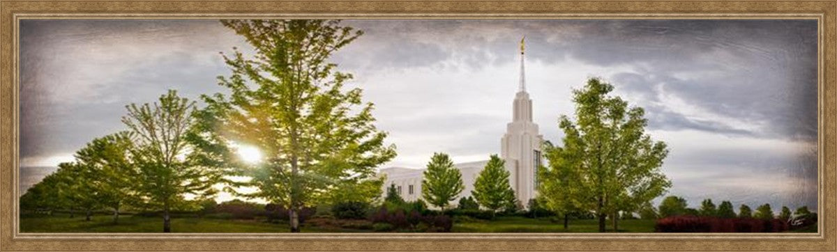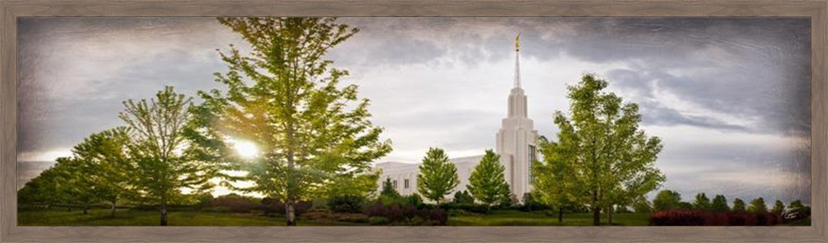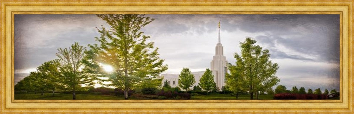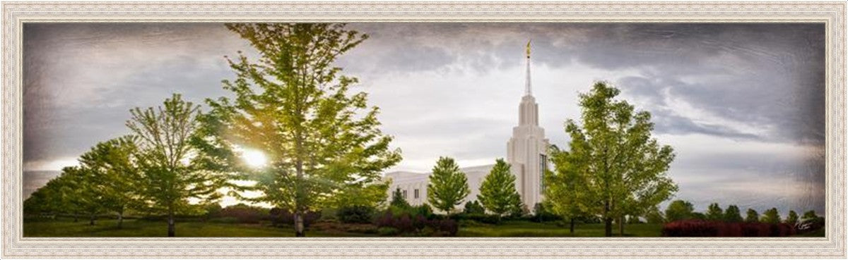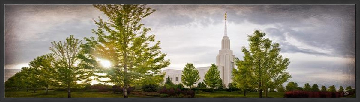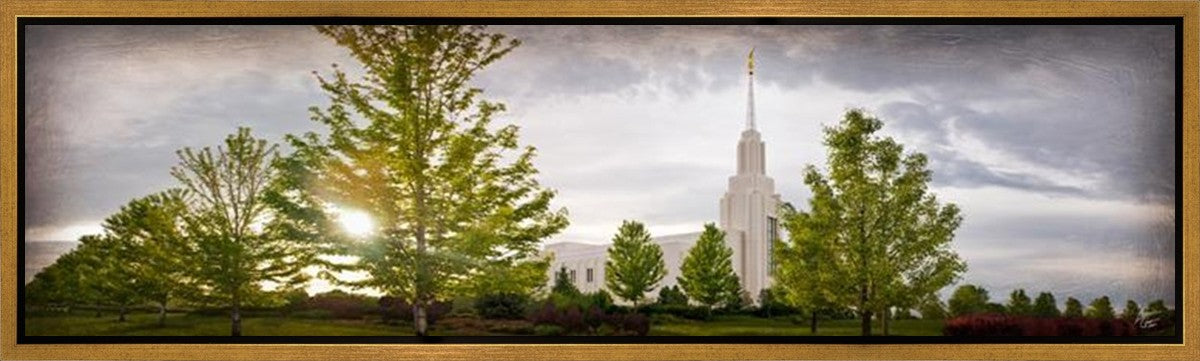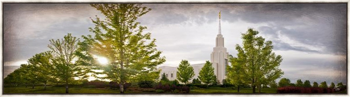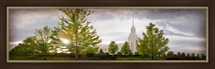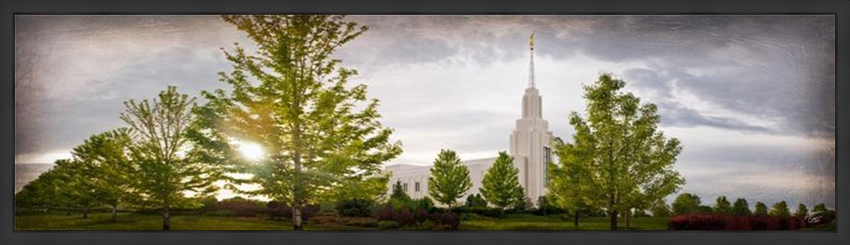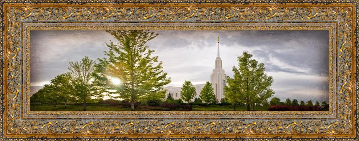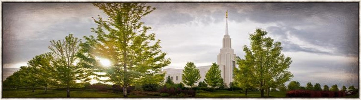 Since 1999 Landon has worked as an artisan in nearly 40 temples doing the decorative paint and gold leaf. He continues to do so as well as wood repair and graining. He was married in 2001 to Jacey Thomas in the Manti Utah temple. When she couldn’t find an image of the temple that she liked enough to purchase for their home, he decided to take one himself. That desire to create something original and different inspired his current series of temple art. They are taken from a panoramic viewpoint and stylized with an artistic border that reflect his paintings. All modern structures apart from the temple have been omitted.