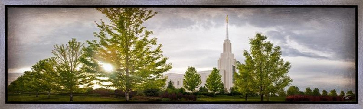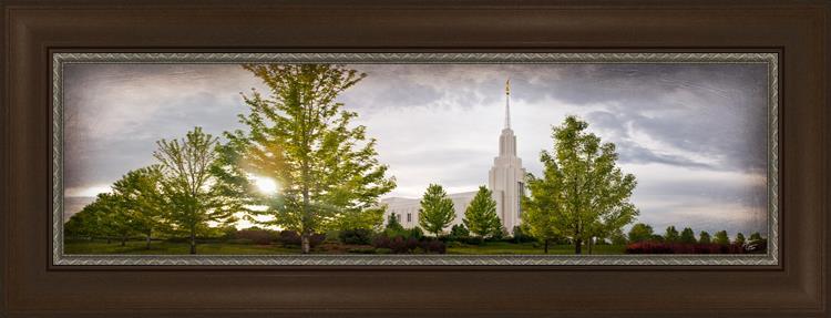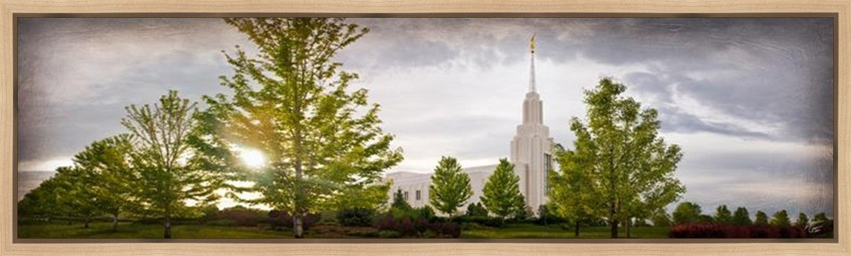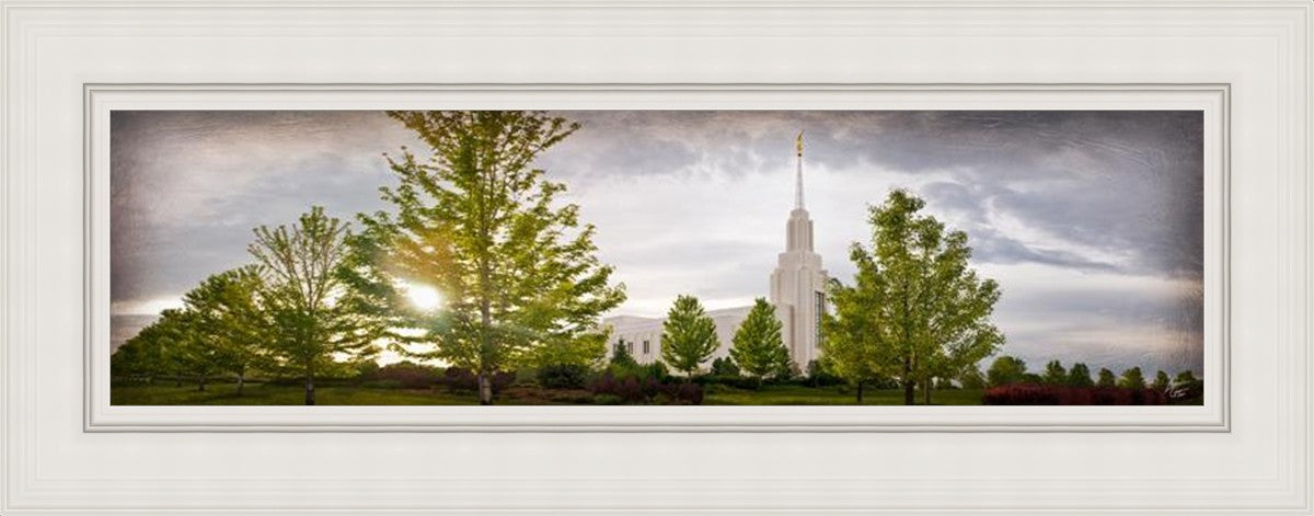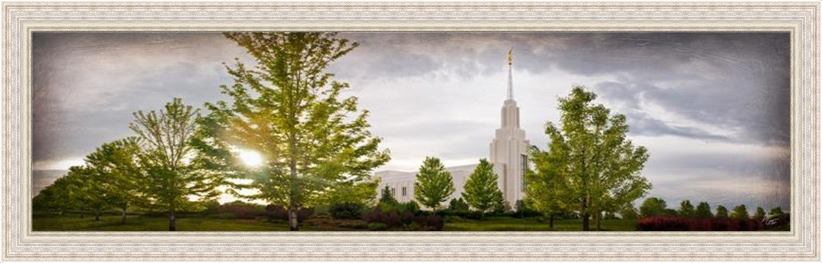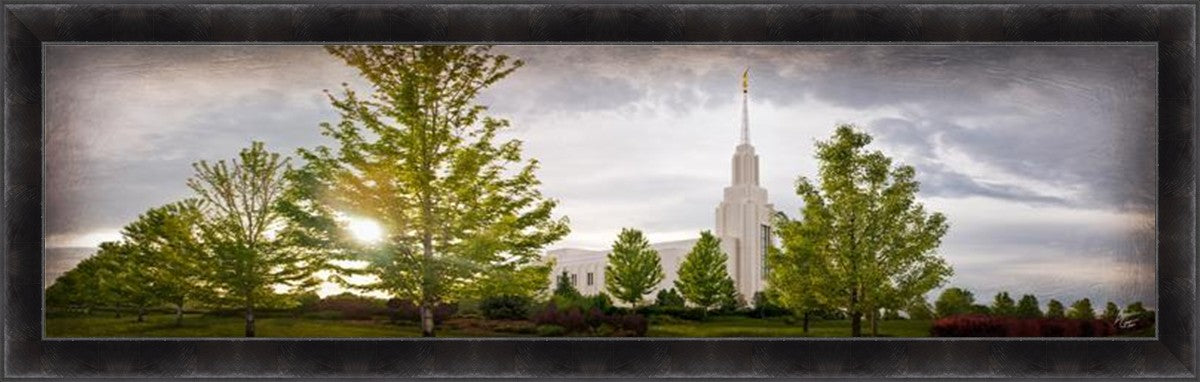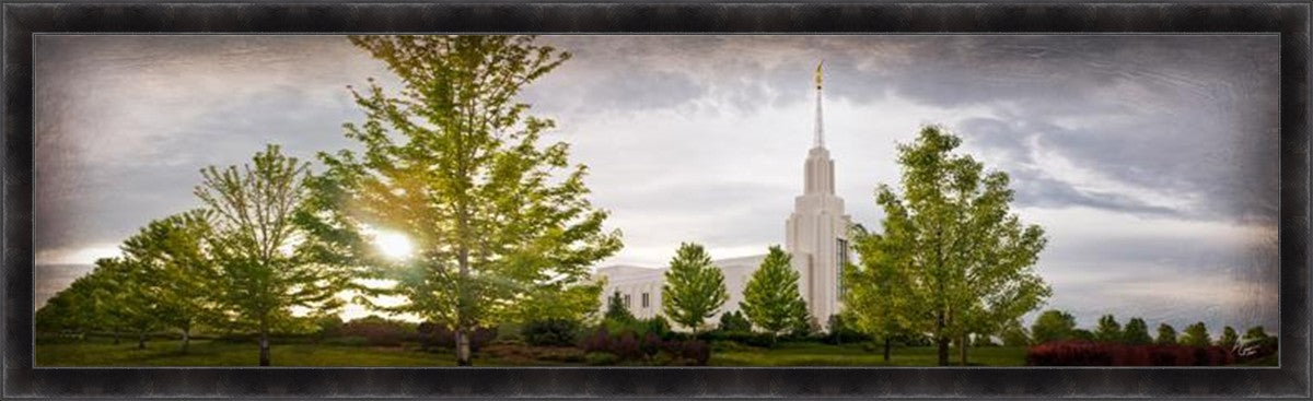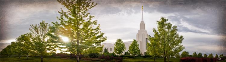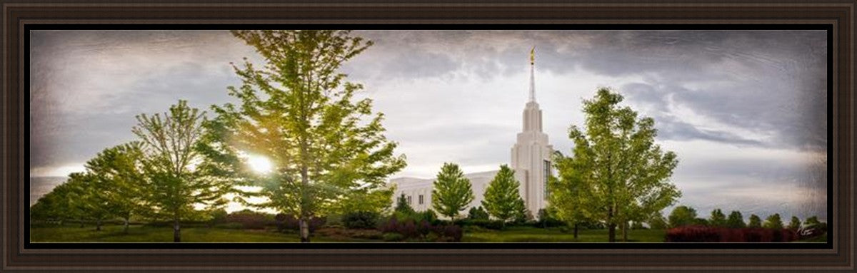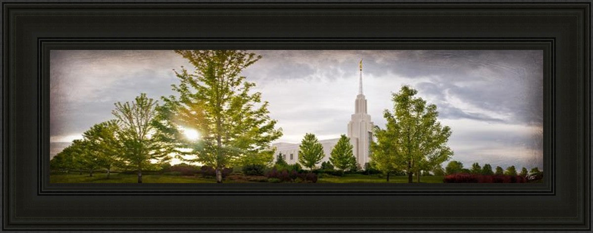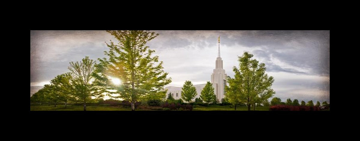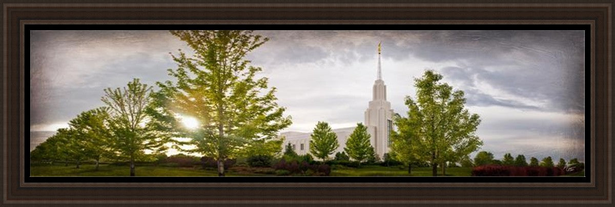 Since 1999 Landon has worked as an artisan in nearly 40 temples doing the decorative paint and gold leaf. He continues to do so as well as wood repair and graining. He was married in 2001 to Jacey Thomas in the Manti Utah temple. When she couldn’t find an image of the temple that she liked enough to purchase for their home, he decided to take one himself. That desire to create something original and different inspired his current series of temple art. They are taken from a panoramic viewpoint and stylized with an artistic border that reflect his paintings. All modern structures apart from the temple have been omitted.