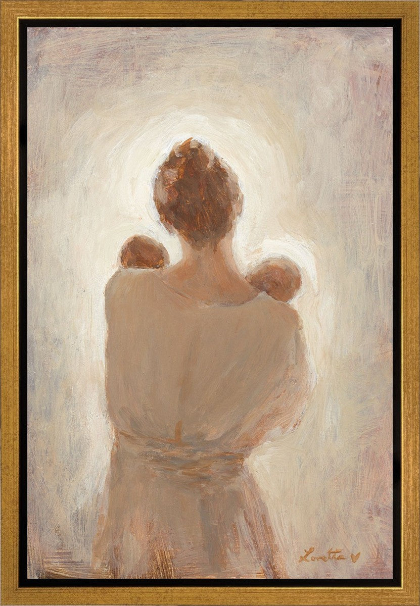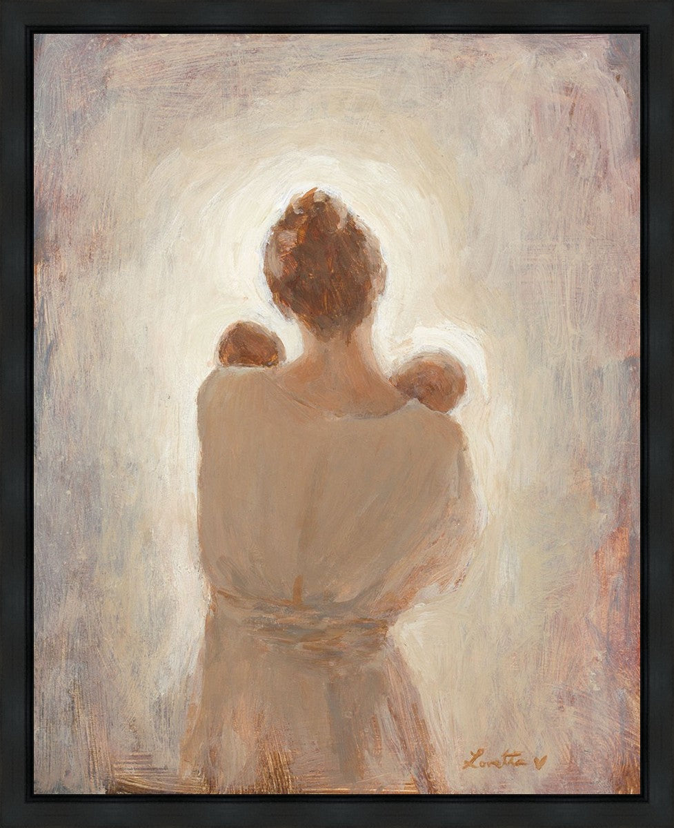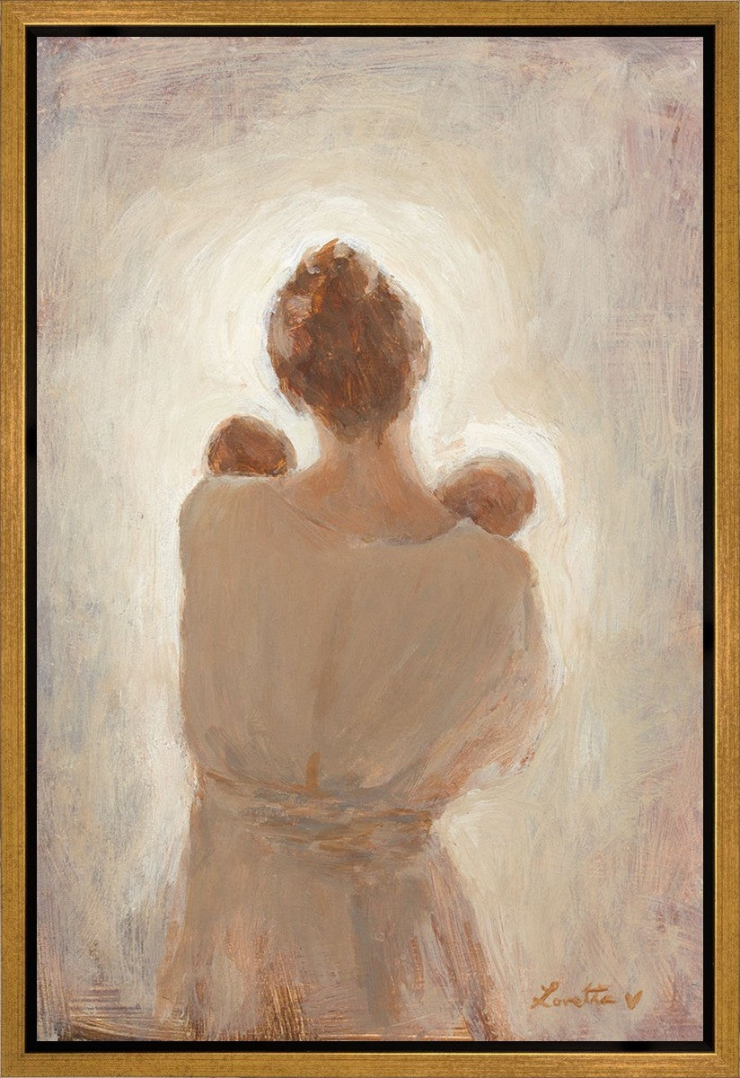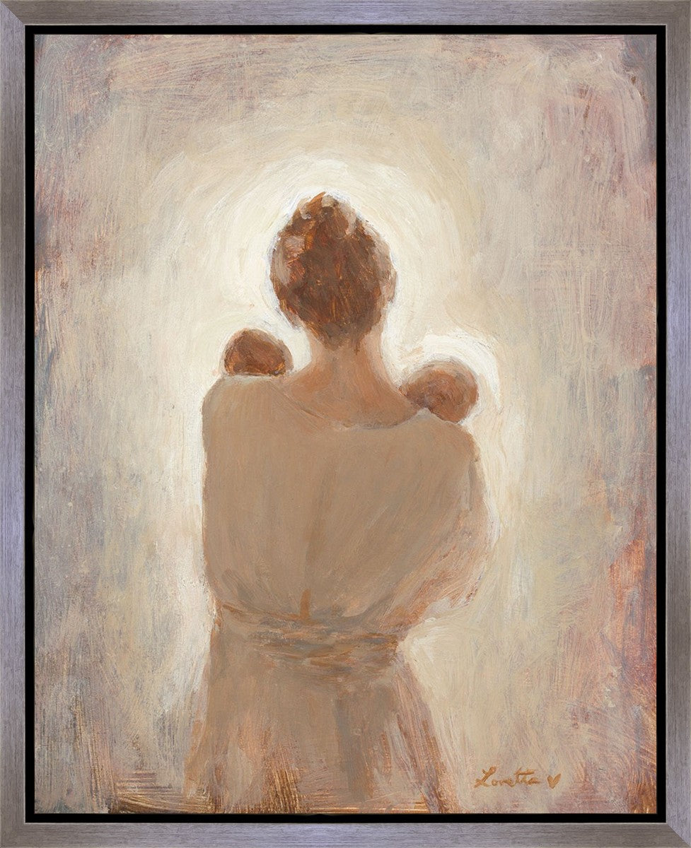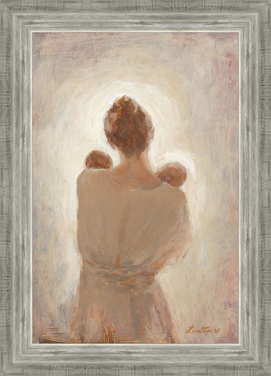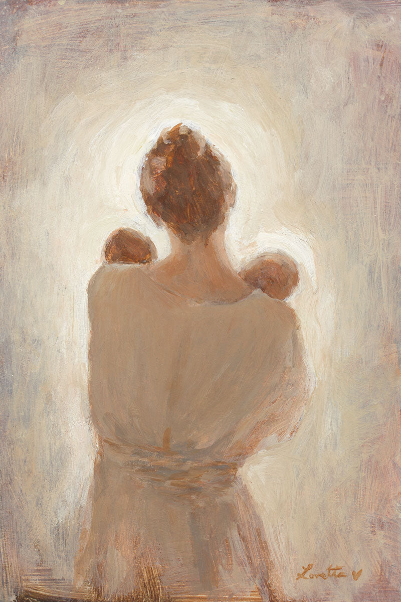 Two Little Loves" by Lovetta Reyes Cairo is a heartwarming painting portraying a mother holding her newborn twins against a soft pink background. This captivating artwork captures the beauty of motherhood and the bond between parent and child, making it perfect for nurseries and spaces celebrating the joy of new life. Immerse yourself in the tender embrace depicted in this artwork, ideal for those seeking inspiration and comfort in the journey of parenthood.